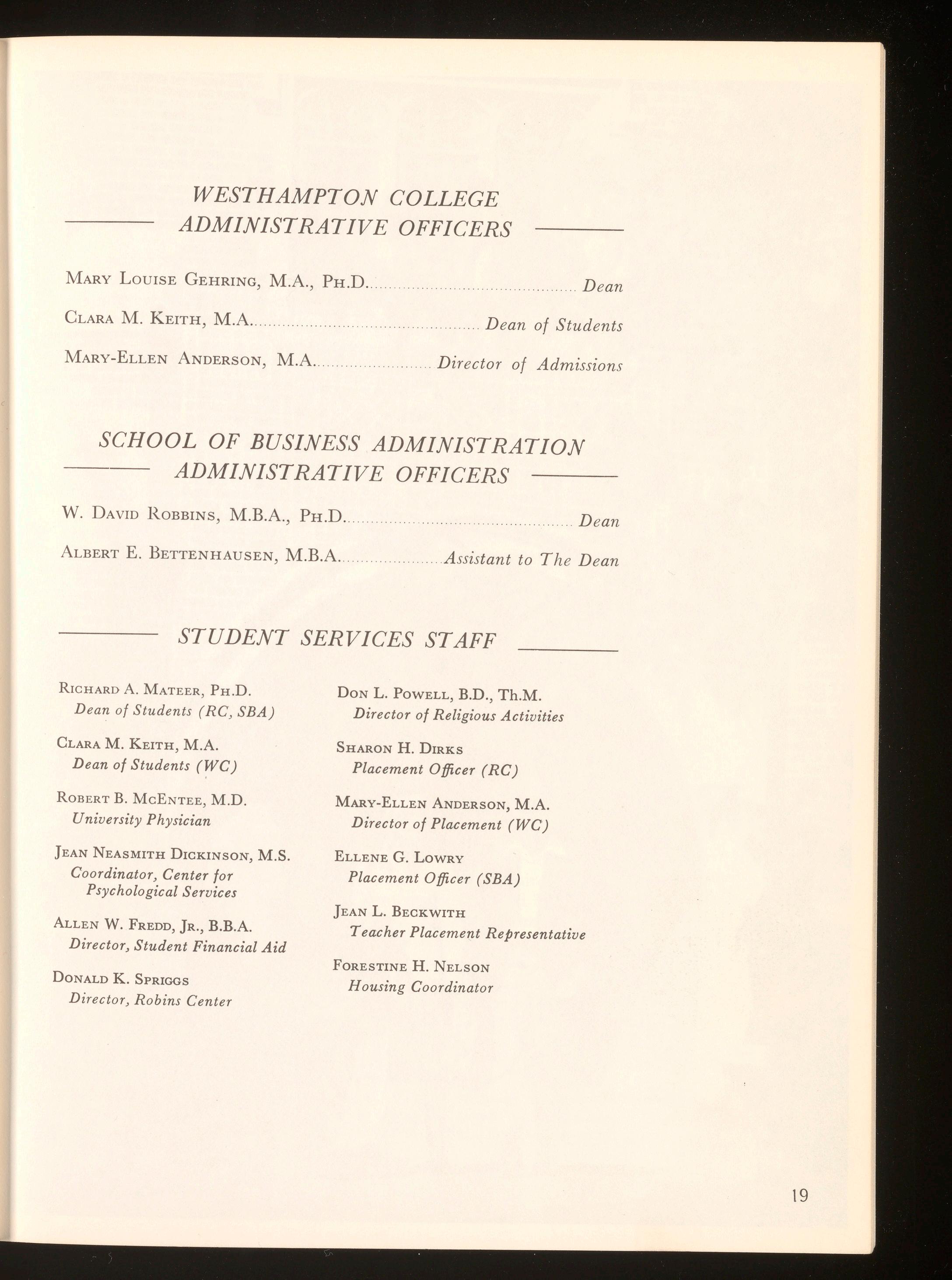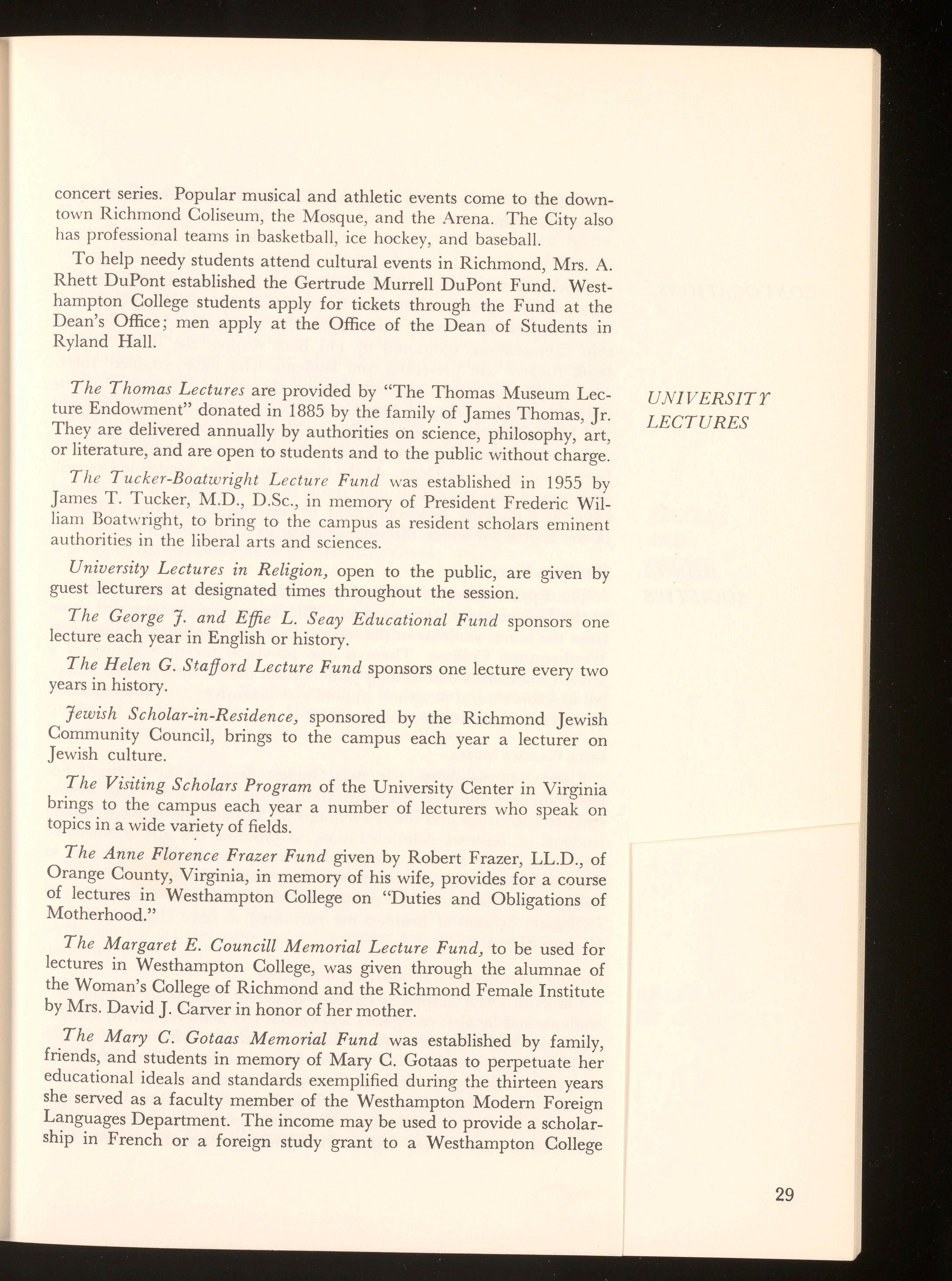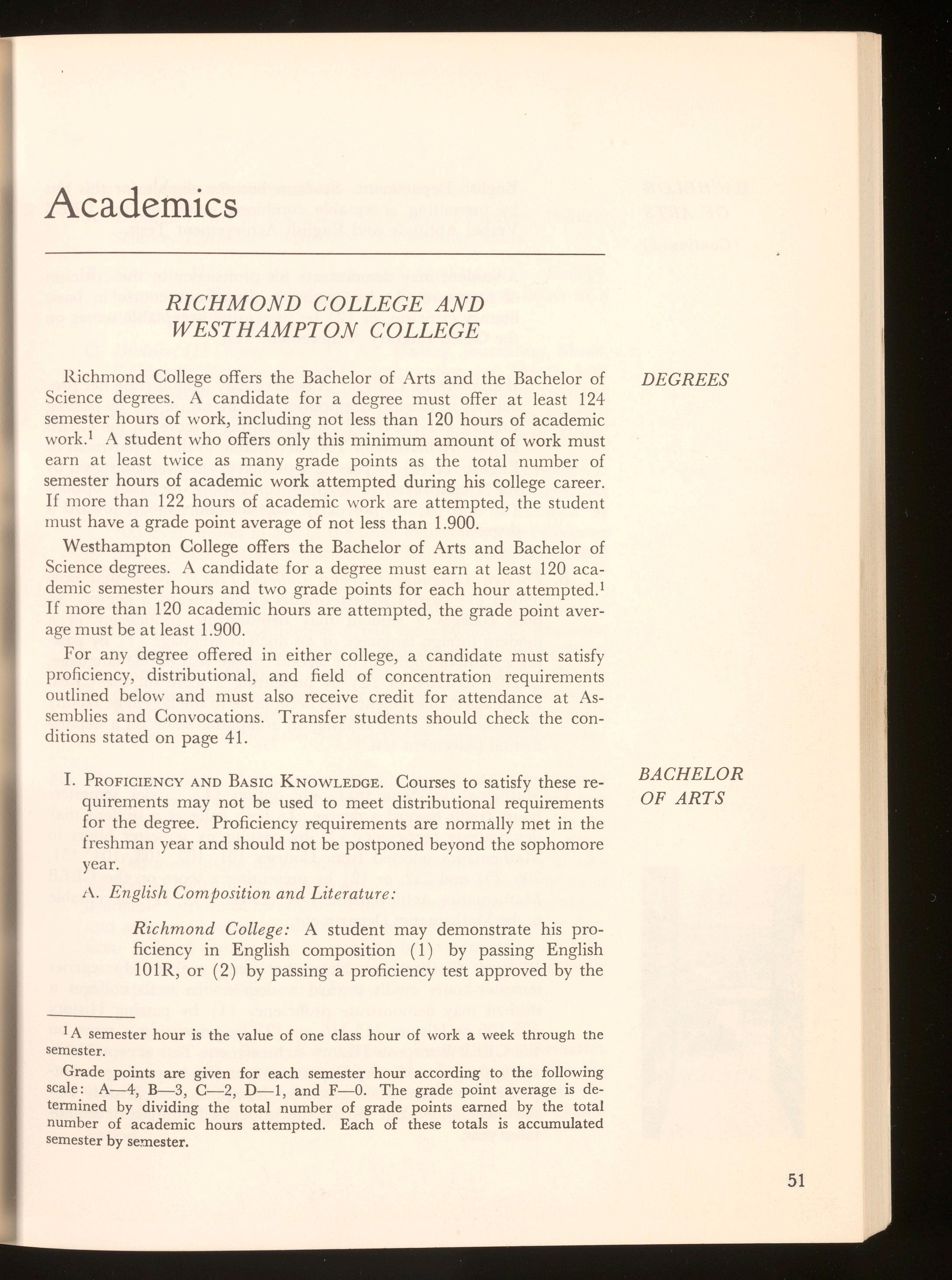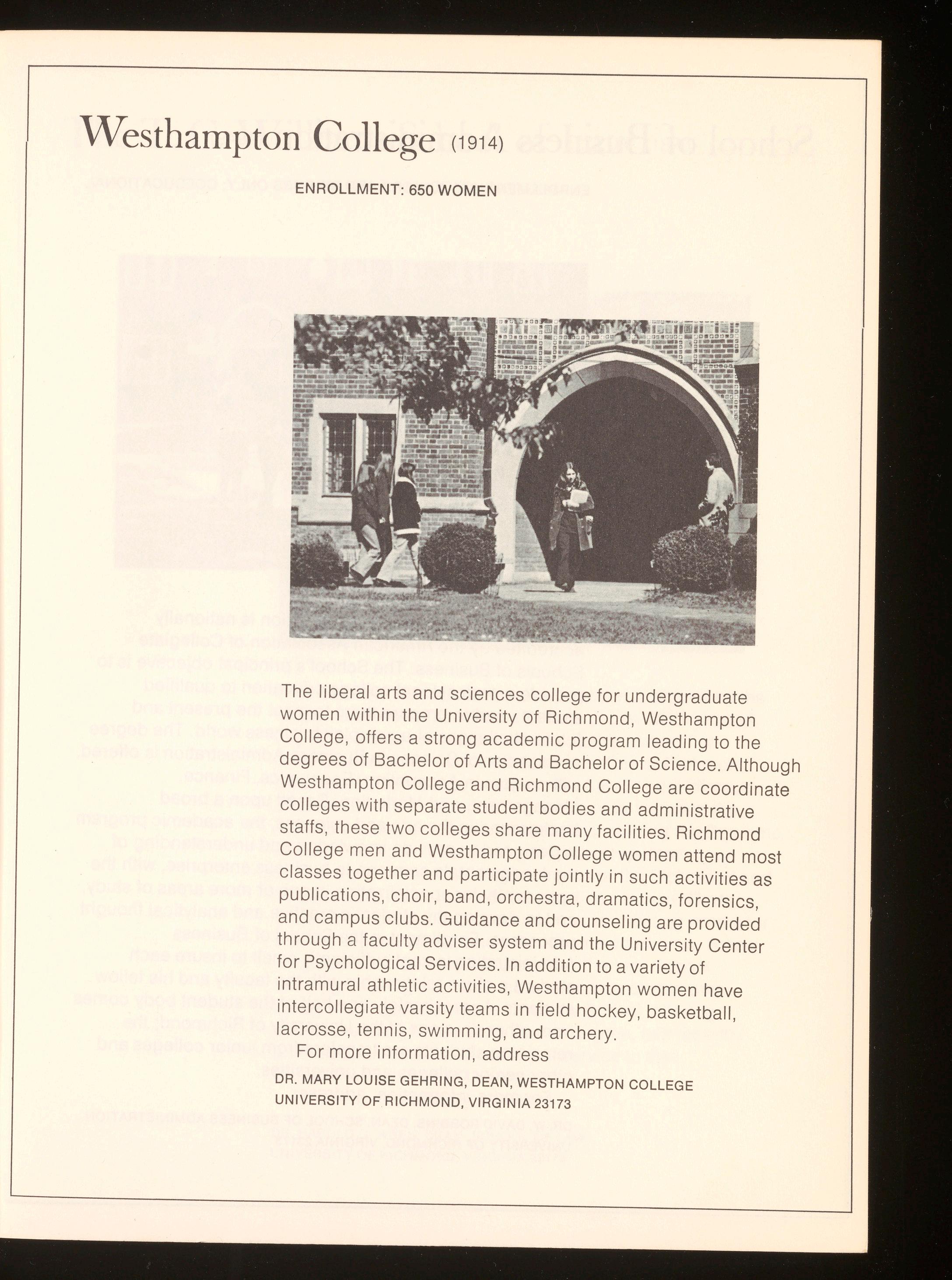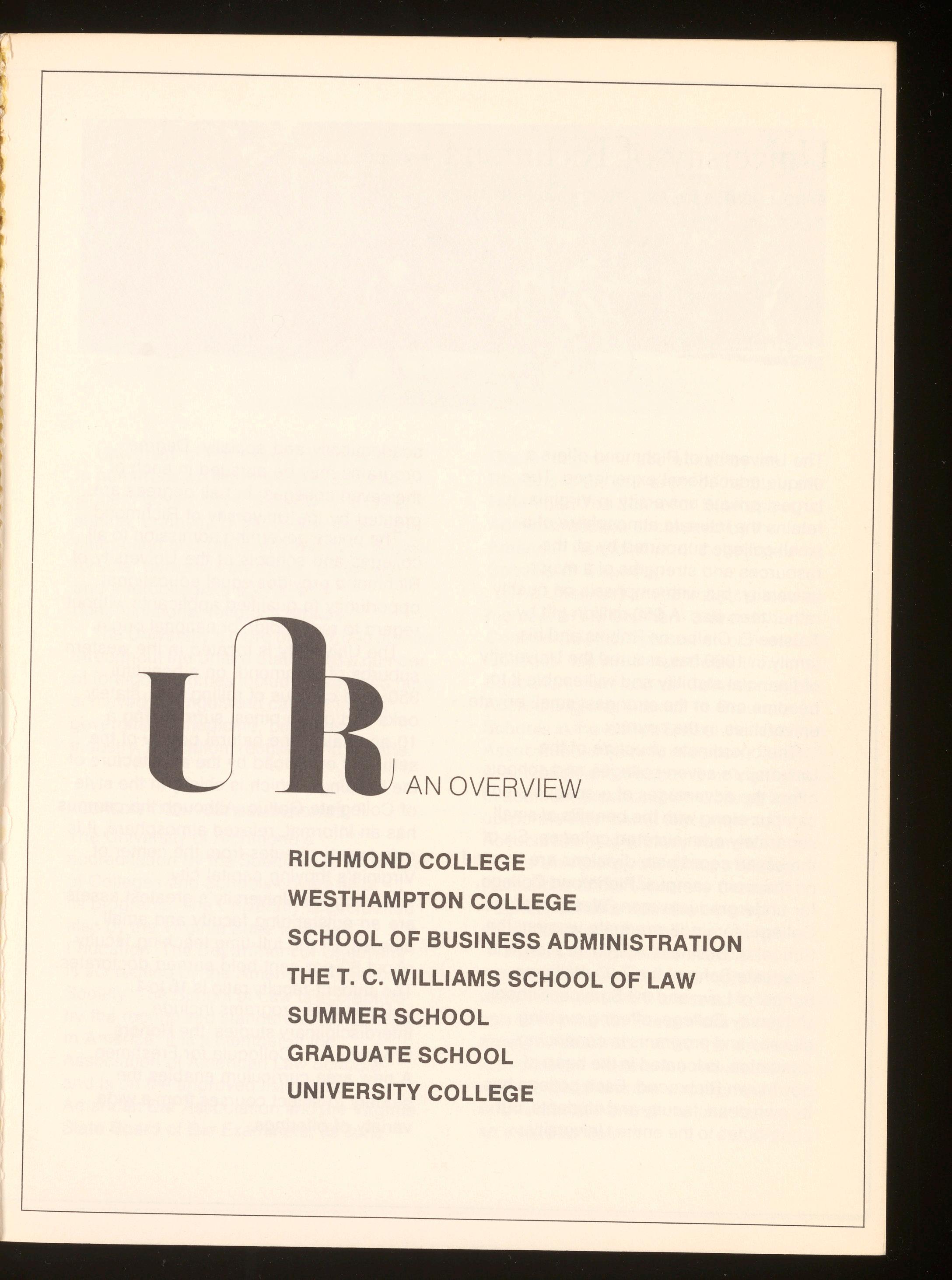 Learning is the reason for a university. The road to learning is the reason for this catalogue. You will discover in these pages the purpose of the University of Richmond, some of its history, and an overview of the seven divisions of the University. In addition, there is detailed information on Richmond College, Westhampton College, and the School of Business Administration: the requirements for admission and graduation, the courses and programs offered, student services and student activities, and other information, including the qualifications of the faculty. But much that is important in spirit, tradition, atmosphere and environment cannot actually be recorded here.