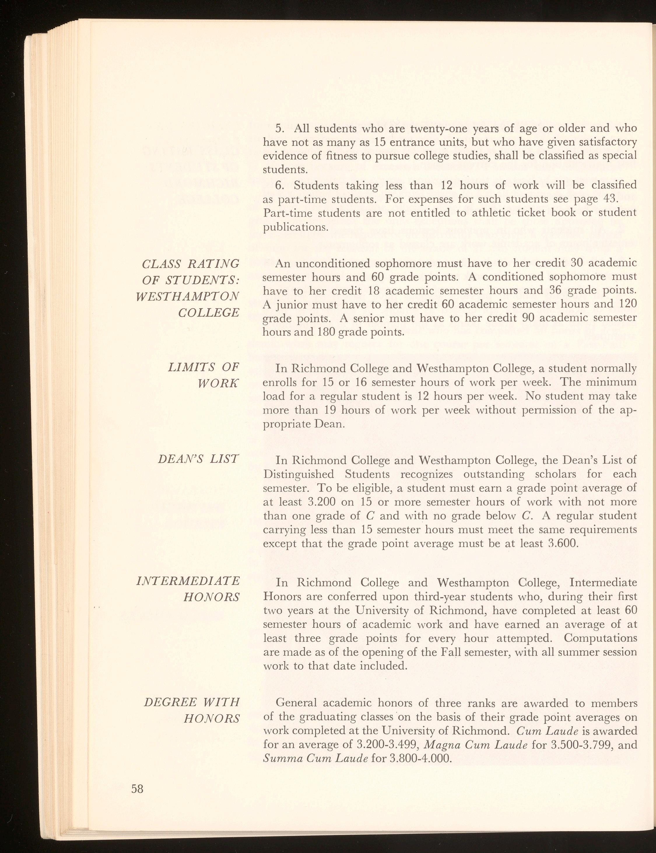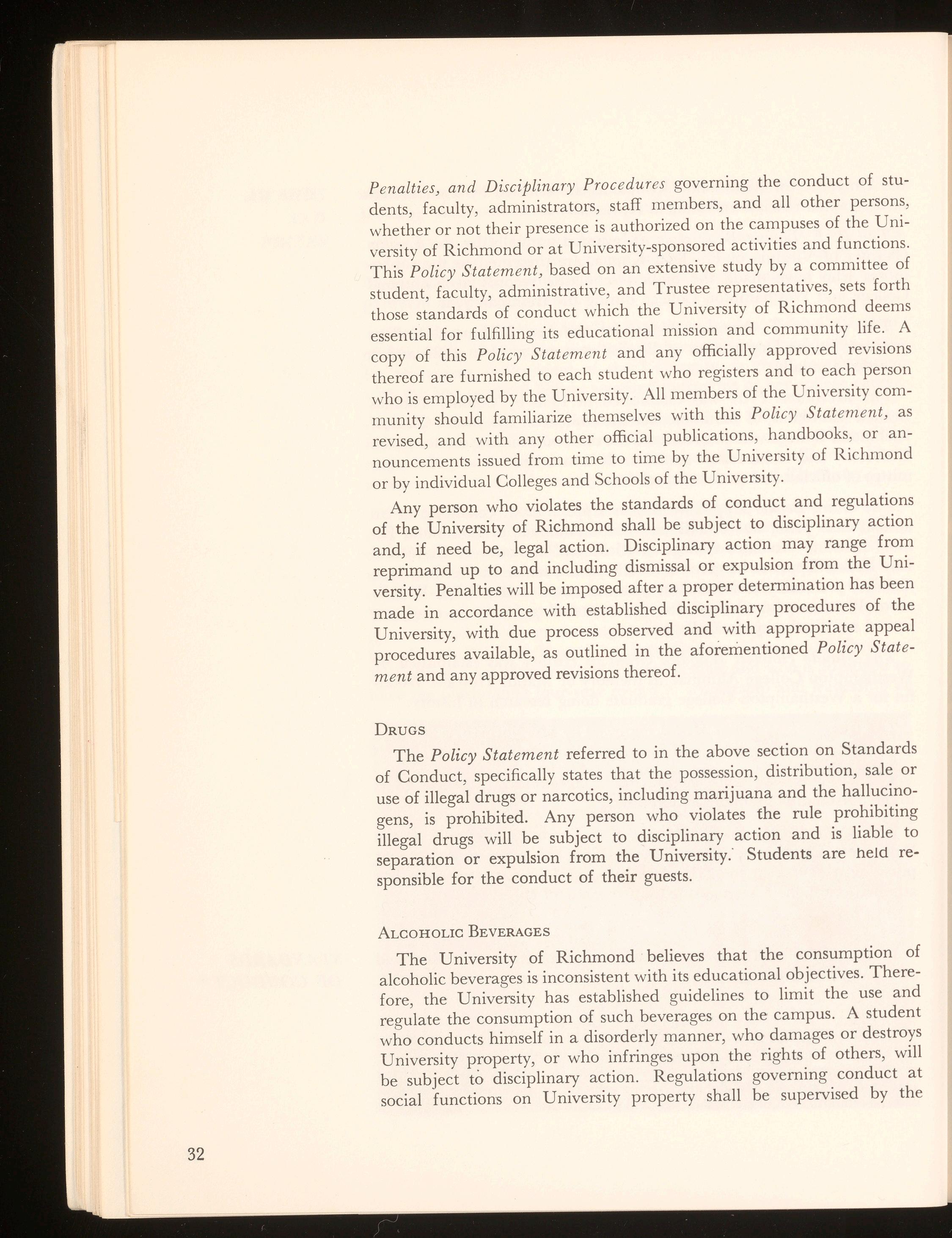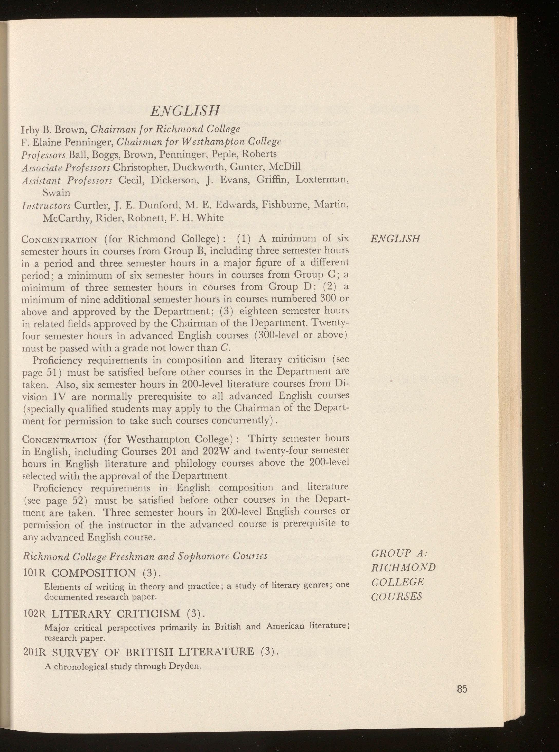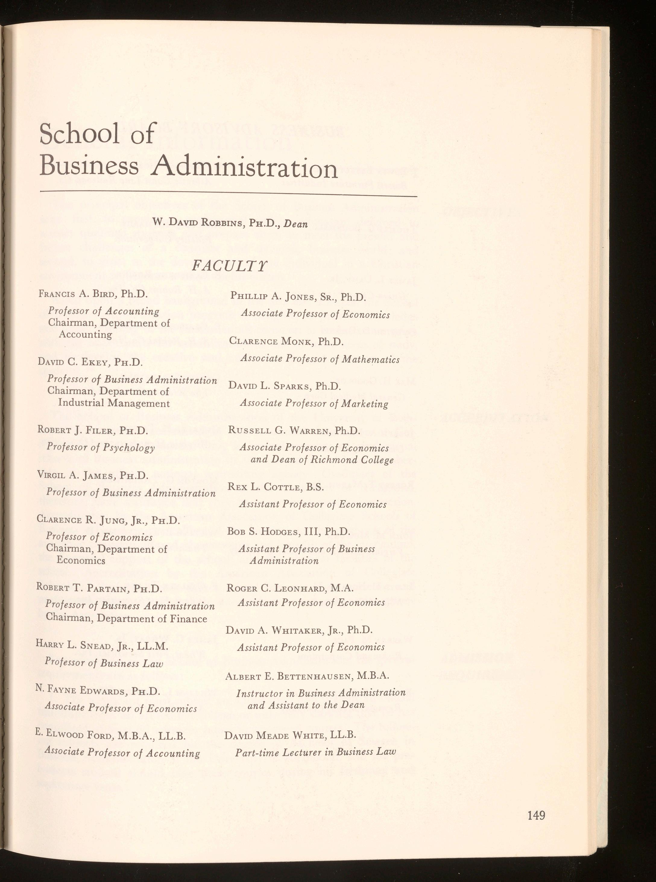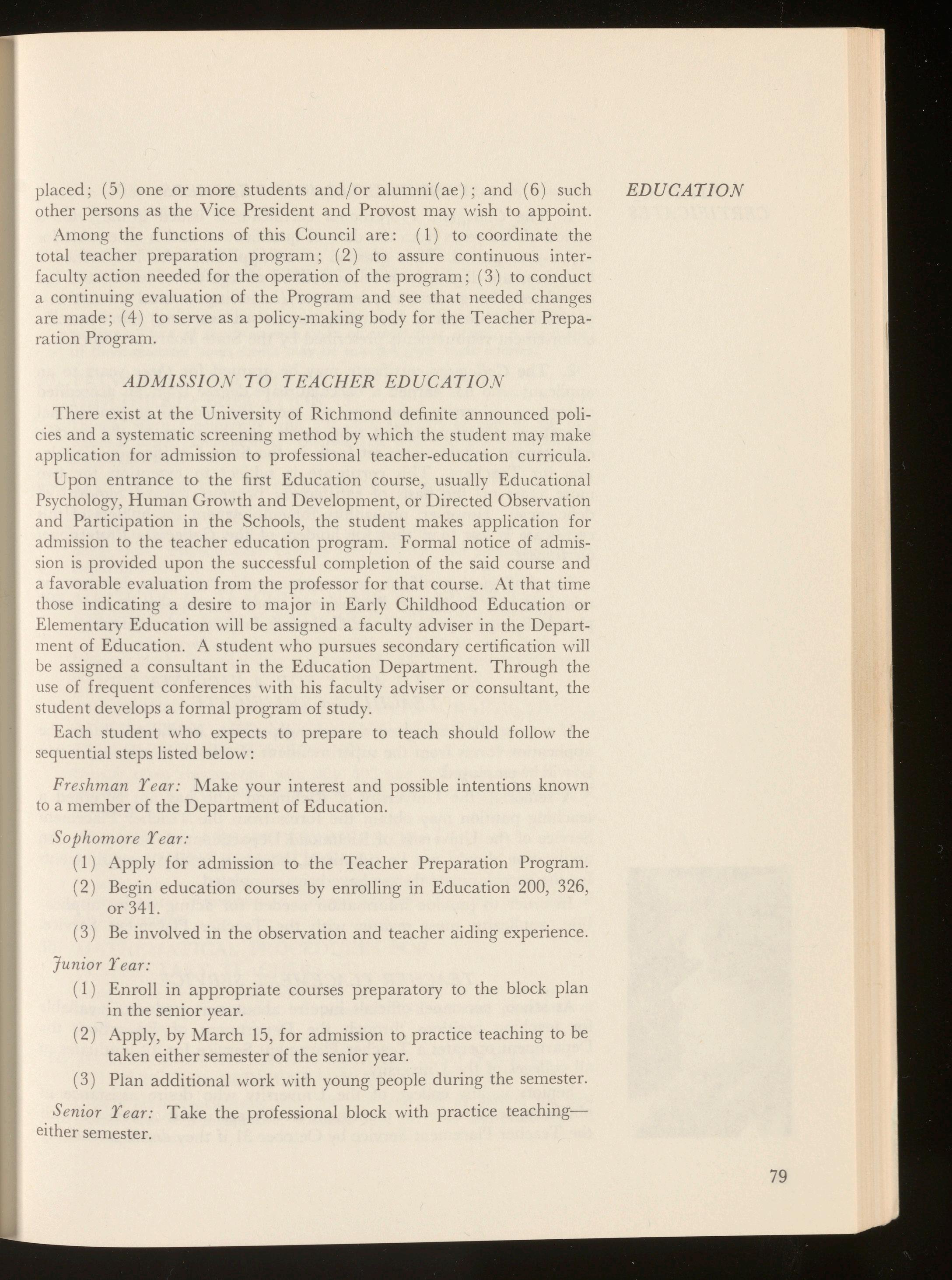 Learning is the reason for a university. The road to learning is the reason for this catalogue. You will discover in these pages the purpose of the University of Richmond, some of its history, and an overview of the seven divisions of the University. In addition, there is detailed information on Richmond College, Westhampton College, and the School of Business Administration: the requirements for admission and graduation, the courses and programs offered, student services and student activities, and other information, including the qualifications of the faculty. But much that is important in spirit, tradition, atmosphere and environment cannot actually be recorded here.