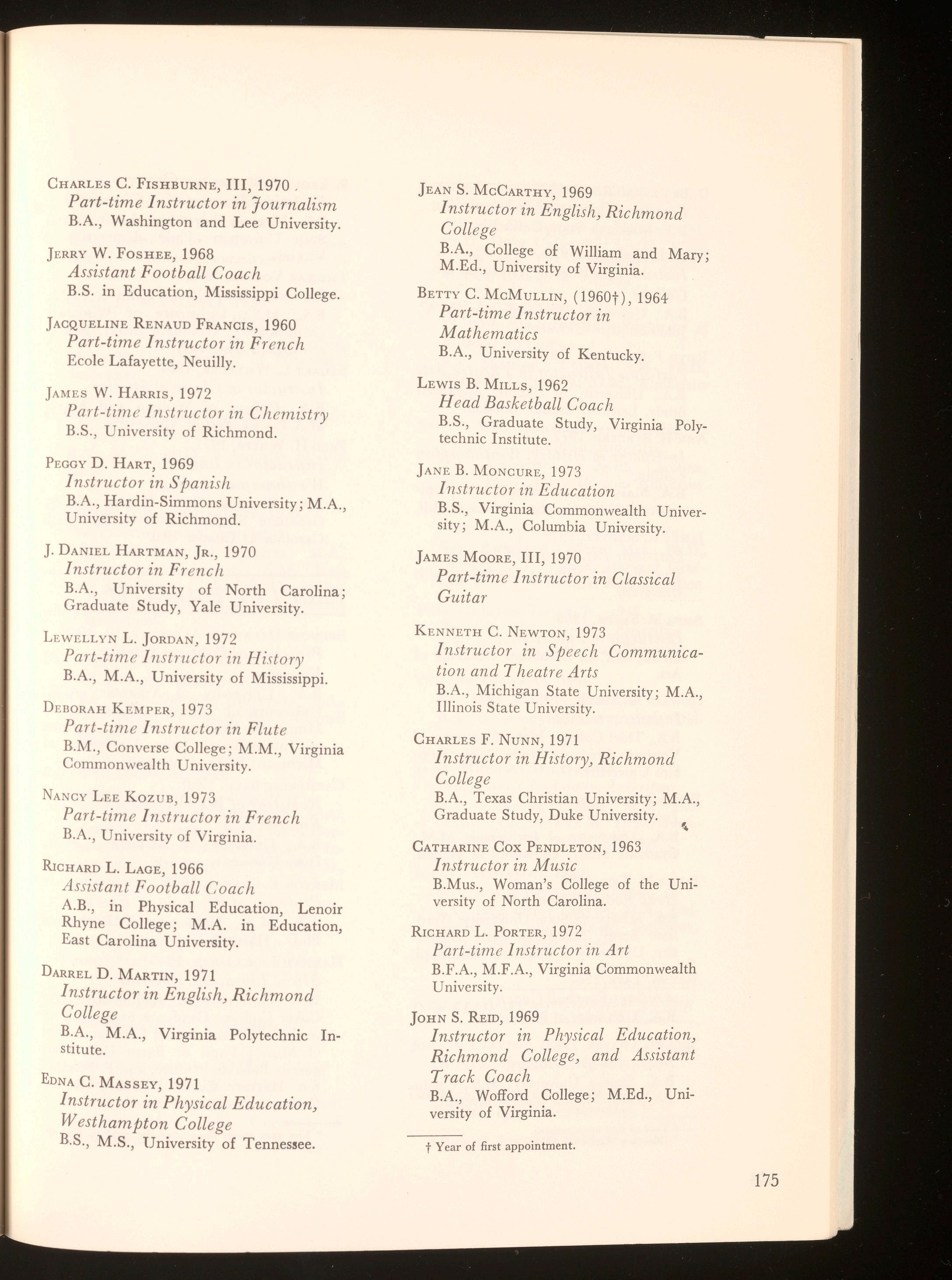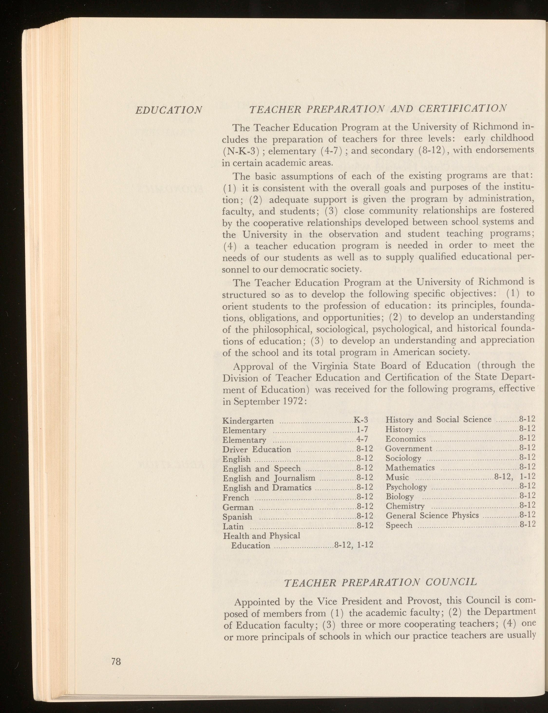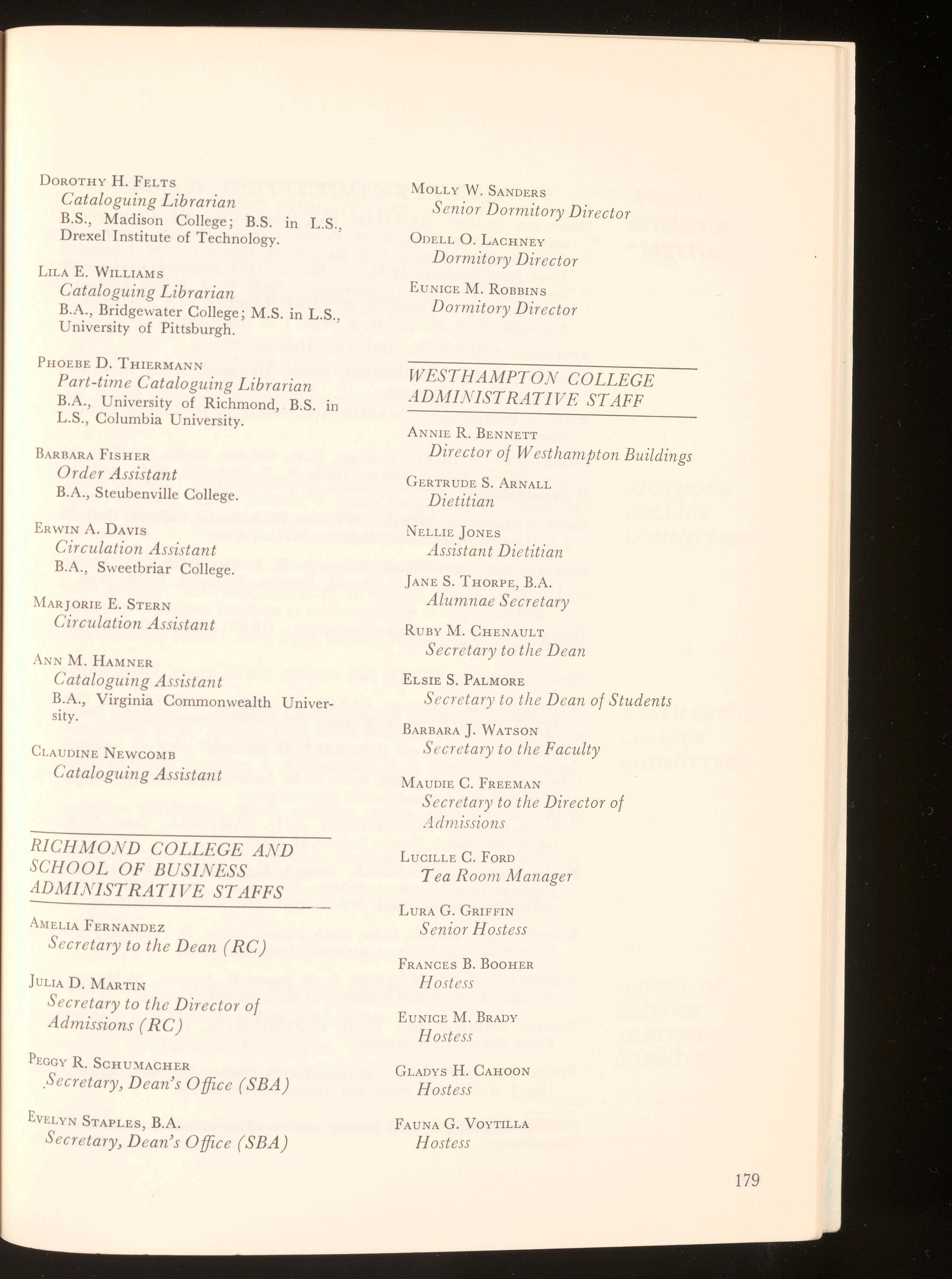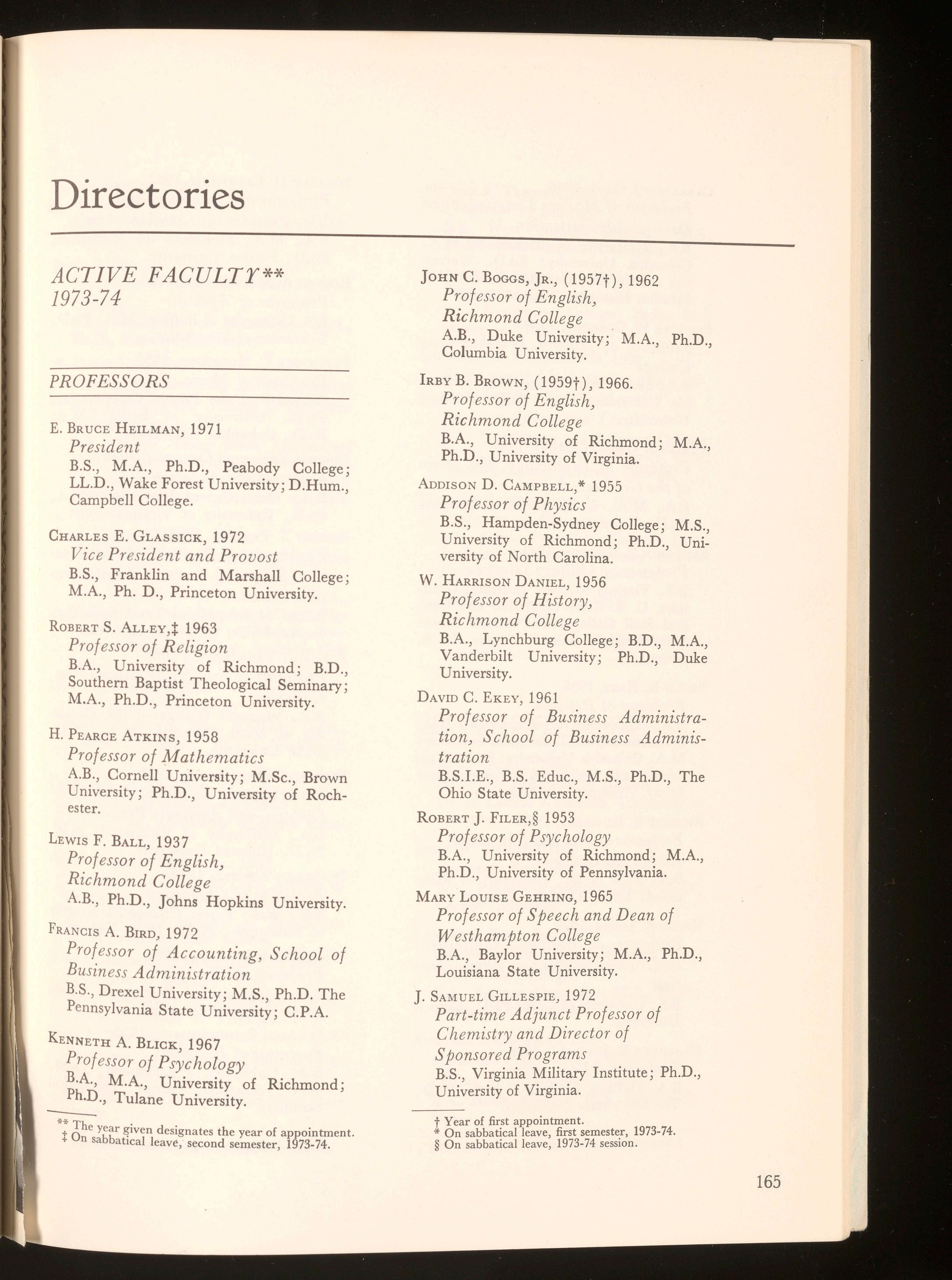 Learning is the reason for a university. The road to learning is the reason for this catalogue. You will discover in these pages the purpose of the University of Richmond, some of its history, and an overview of the seven divisions of the University. In addition, there is detailed information on Richmond College, Westhampton College, and the School of Business Administration: the requirements for admission and graduation, the courses and programs offered, student services and student activities, and other information, including the qualifications of the faculty. But much that is important in spirit, tradition, atmosphere and environment cannot actually be recorded here.