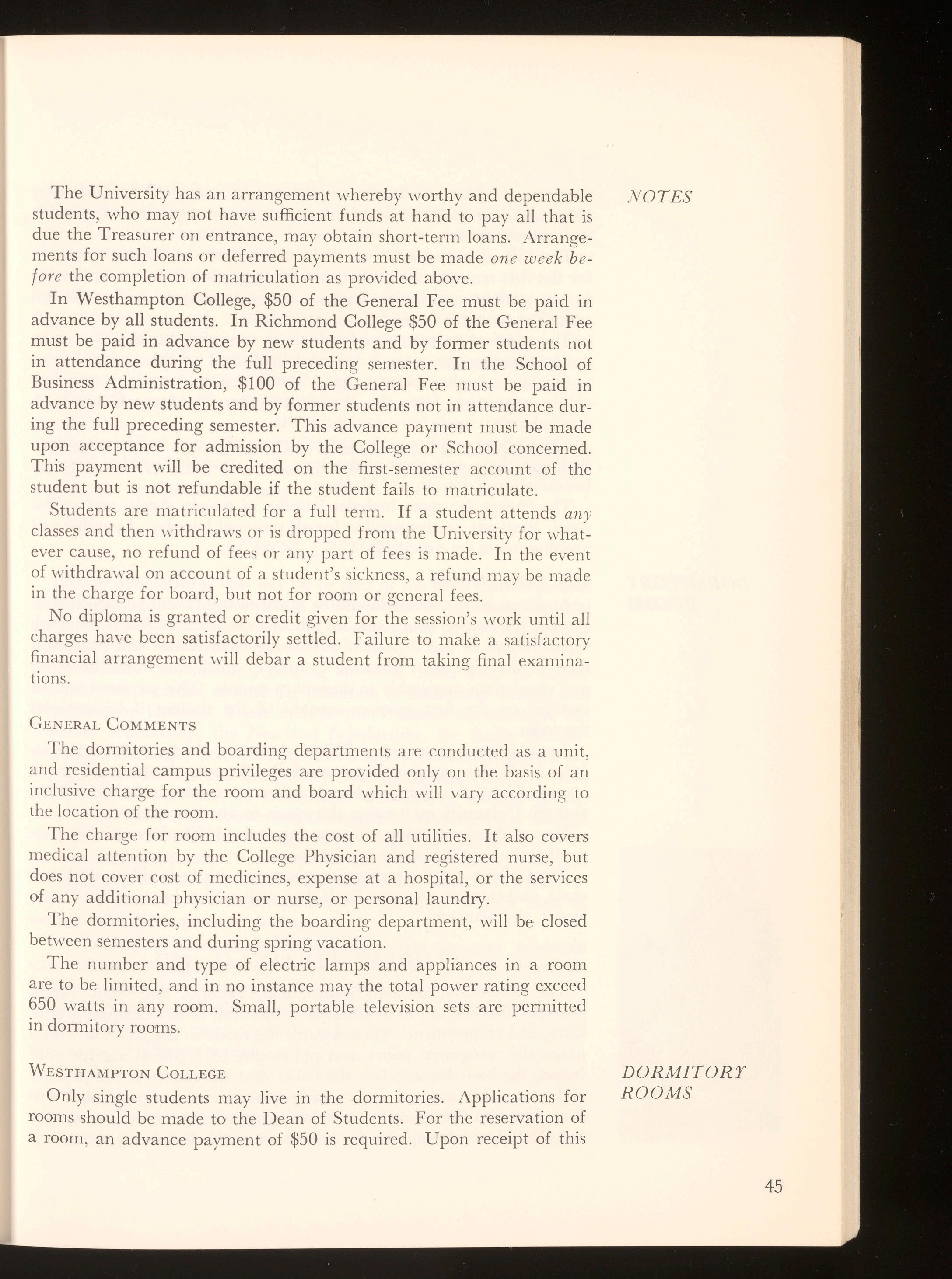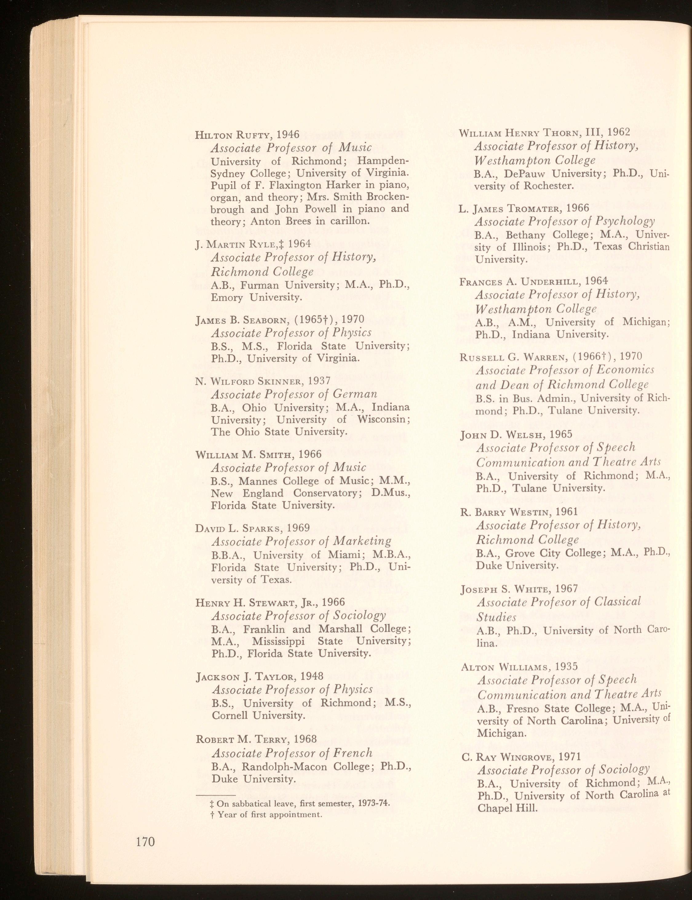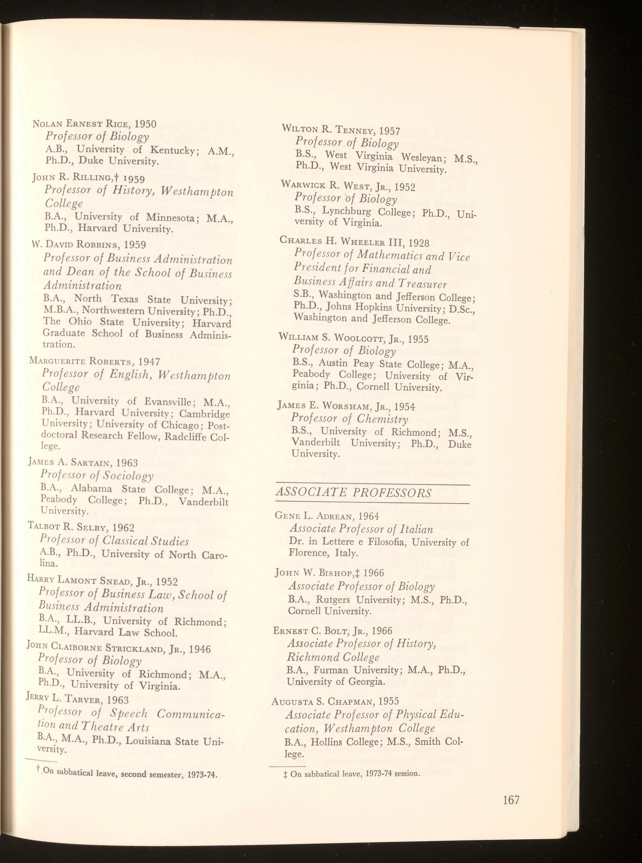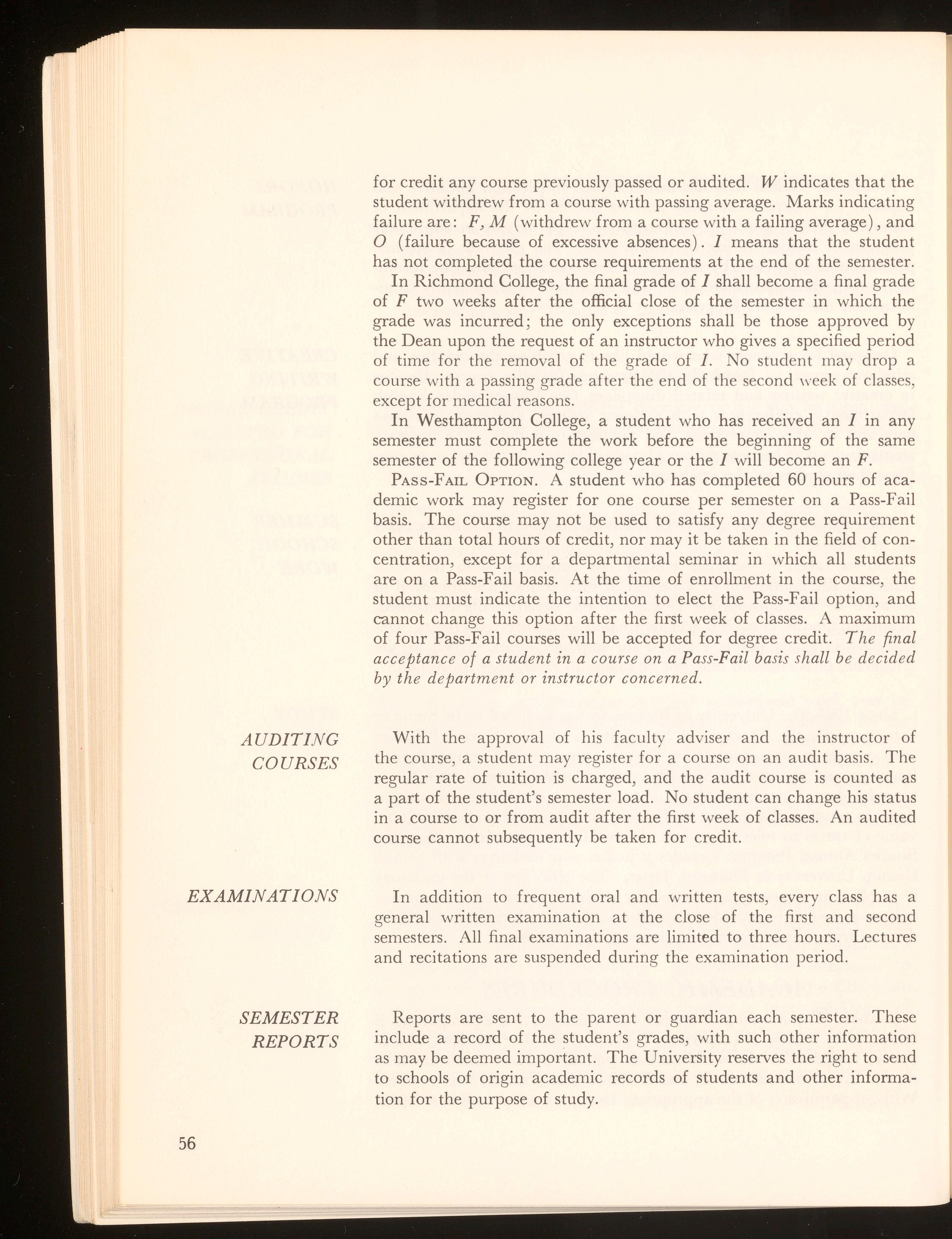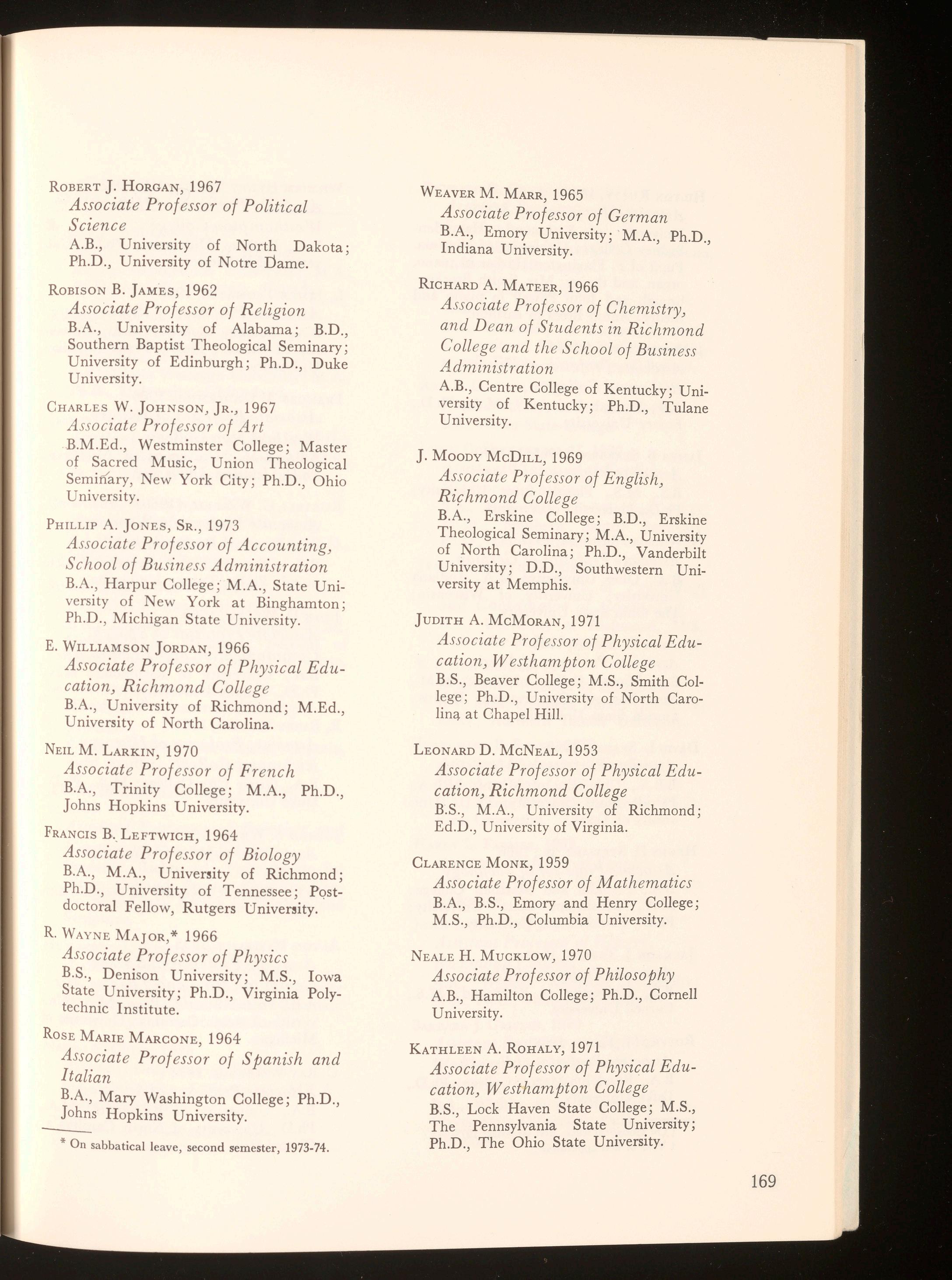 Learning is the reason for a university. The road to learning is the reason for this catalogue. You will discover in these pages the purpose of the University of Richmond, some of its history, and an overview of the seven divisions of the University. In addition, there is detailed information on Richmond College, Westhampton College, and the School of Business Administration: the requirements for admission and graduation, the courses and programs offered, student services and student activities, and other information, including the qualifications of the faculty. But much that is important in spirit, tradition, atmosphere and environment cannot actually be recorded here.