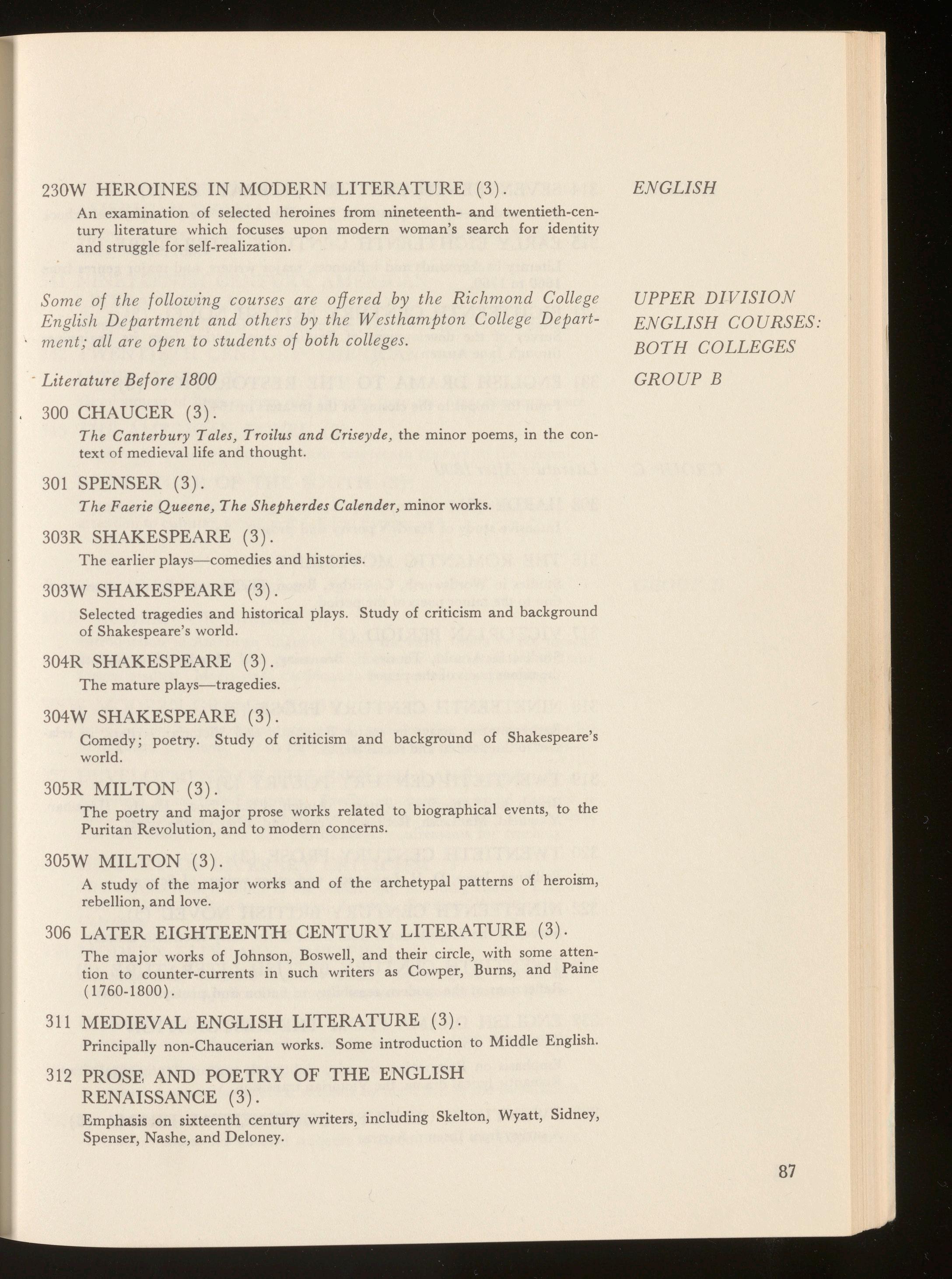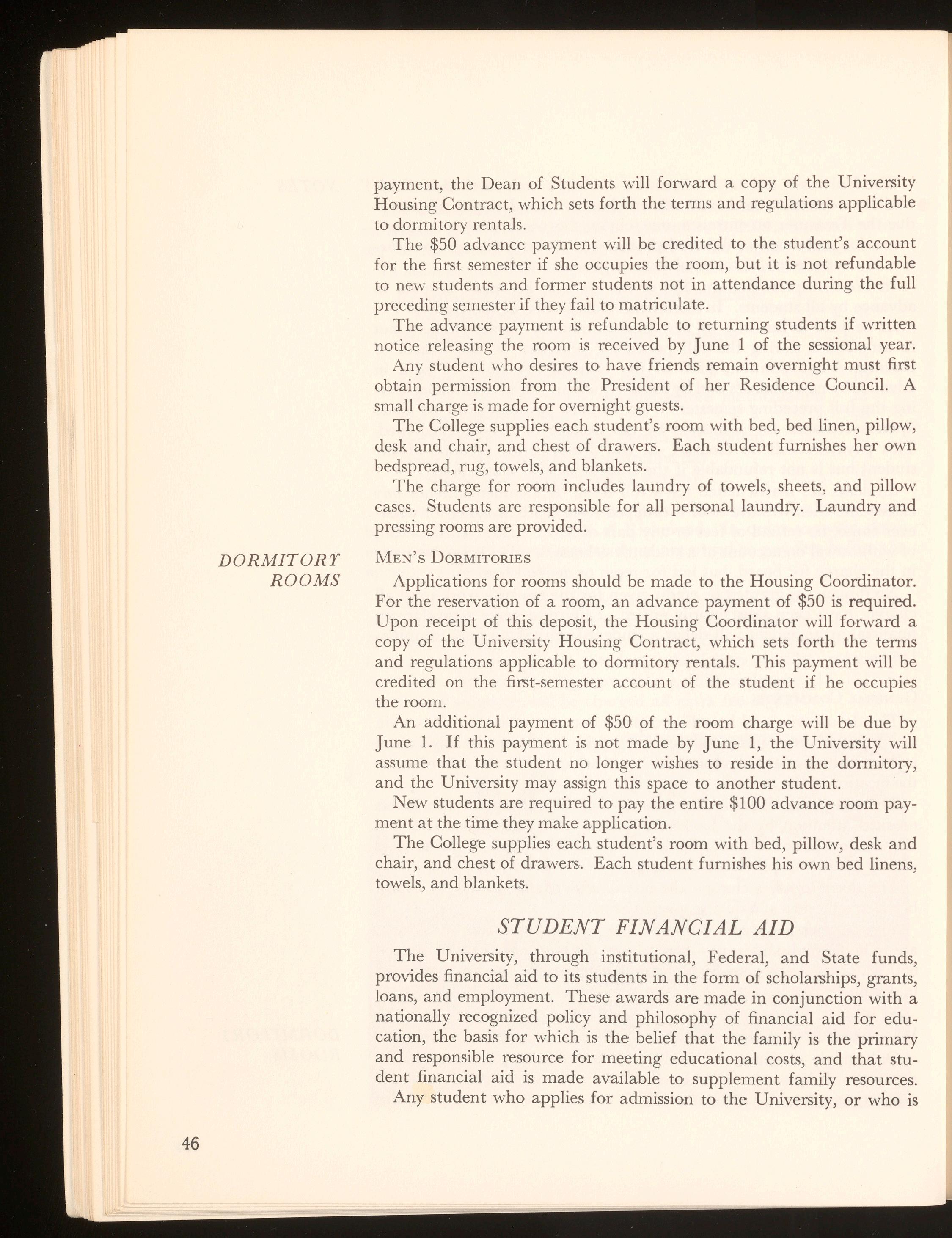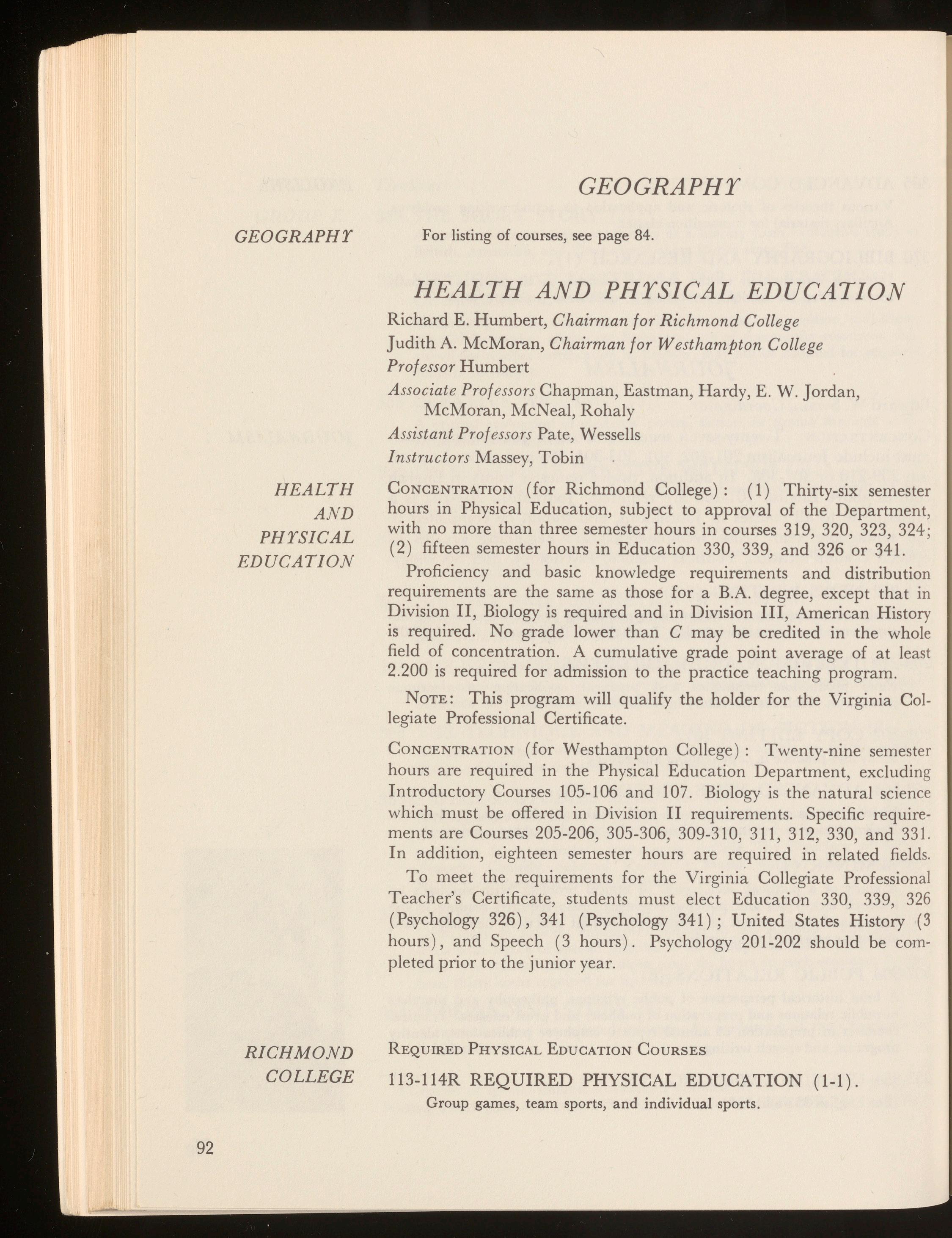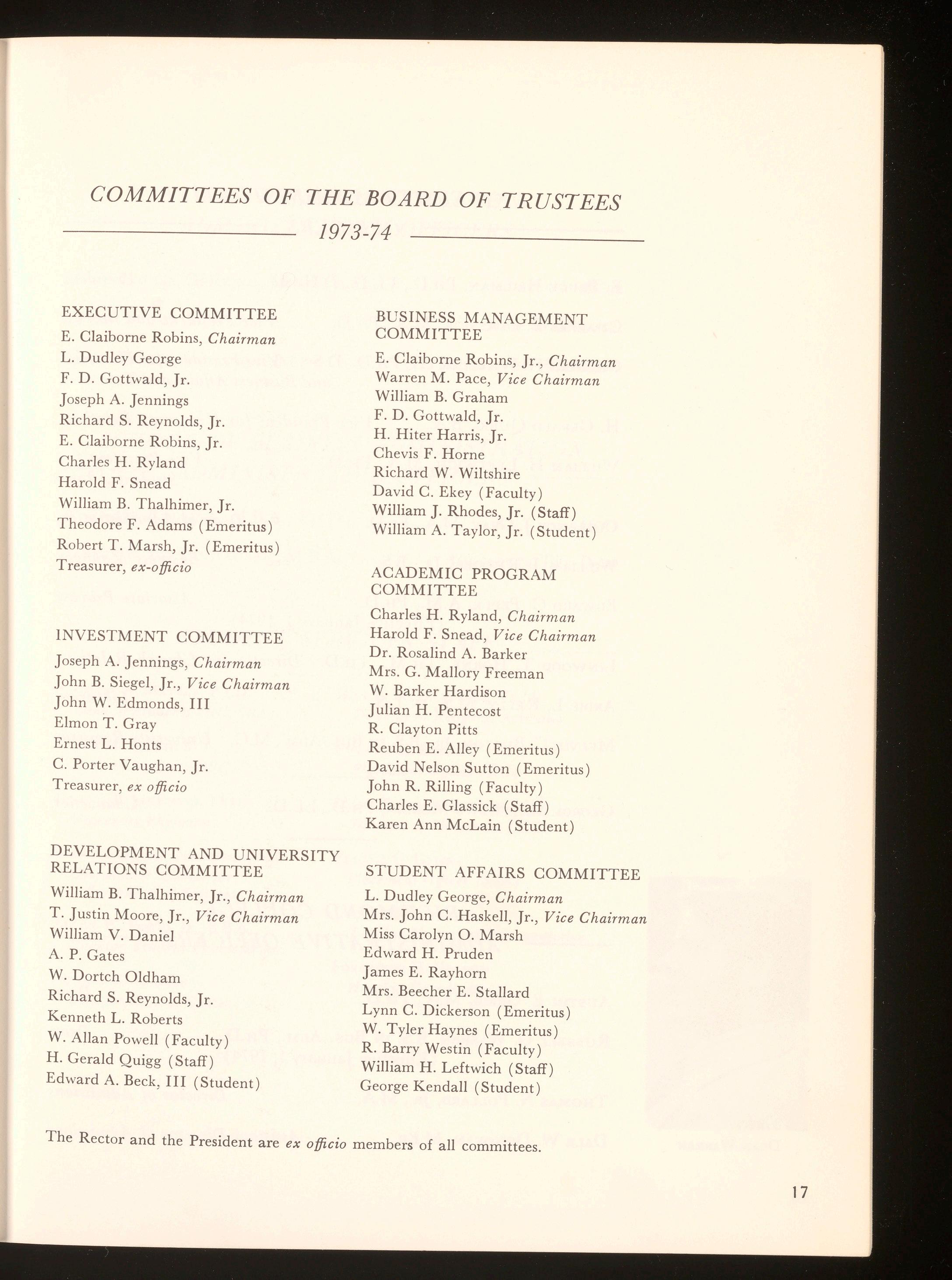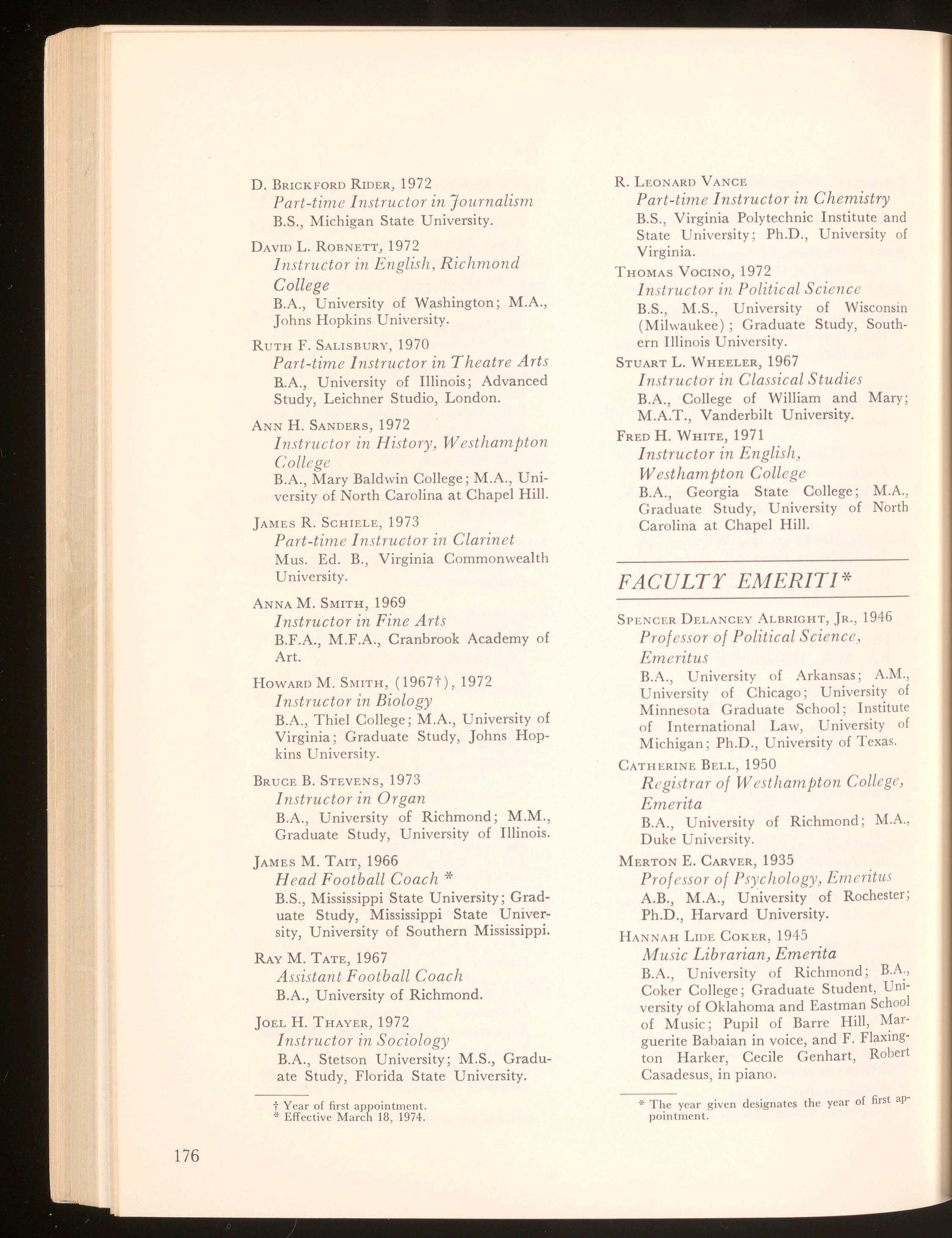 Learning is the reason for a university. The road to learning is the reason for this catalogue. You will discover in these pages the purpose of the University of Richmond, some of its history, and an overview of the seven divisions of the University. In addition, there is detailed information on Richmond College, Westhampton College, and the School of Business Administration: the requirements for admission and graduation, the courses and programs offered, student services and student activities, and other information, including the qualifications of the faculty. But much that is important in spirit, tradition, atmosphere and environment cannot actually be recorded here.