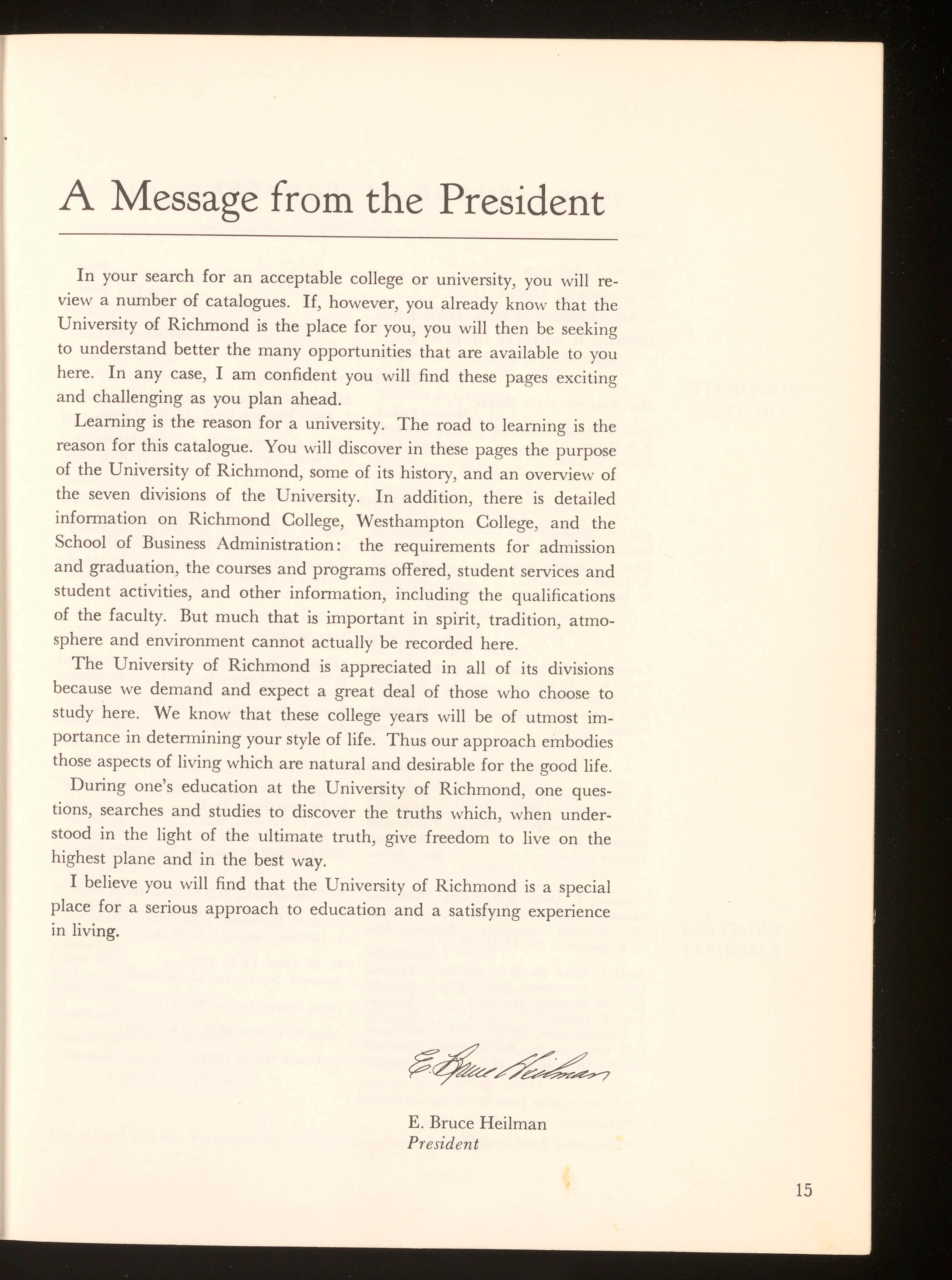 In your search for an acceptable college or university, you will review a number of catalogues. If, however, you already know that the University of Richmond is the place for you, you will then be seeking to understand better the many opportunities that are available to you here. In any case, I am confident you will find these pages exciting and challenging as you plan ahead.