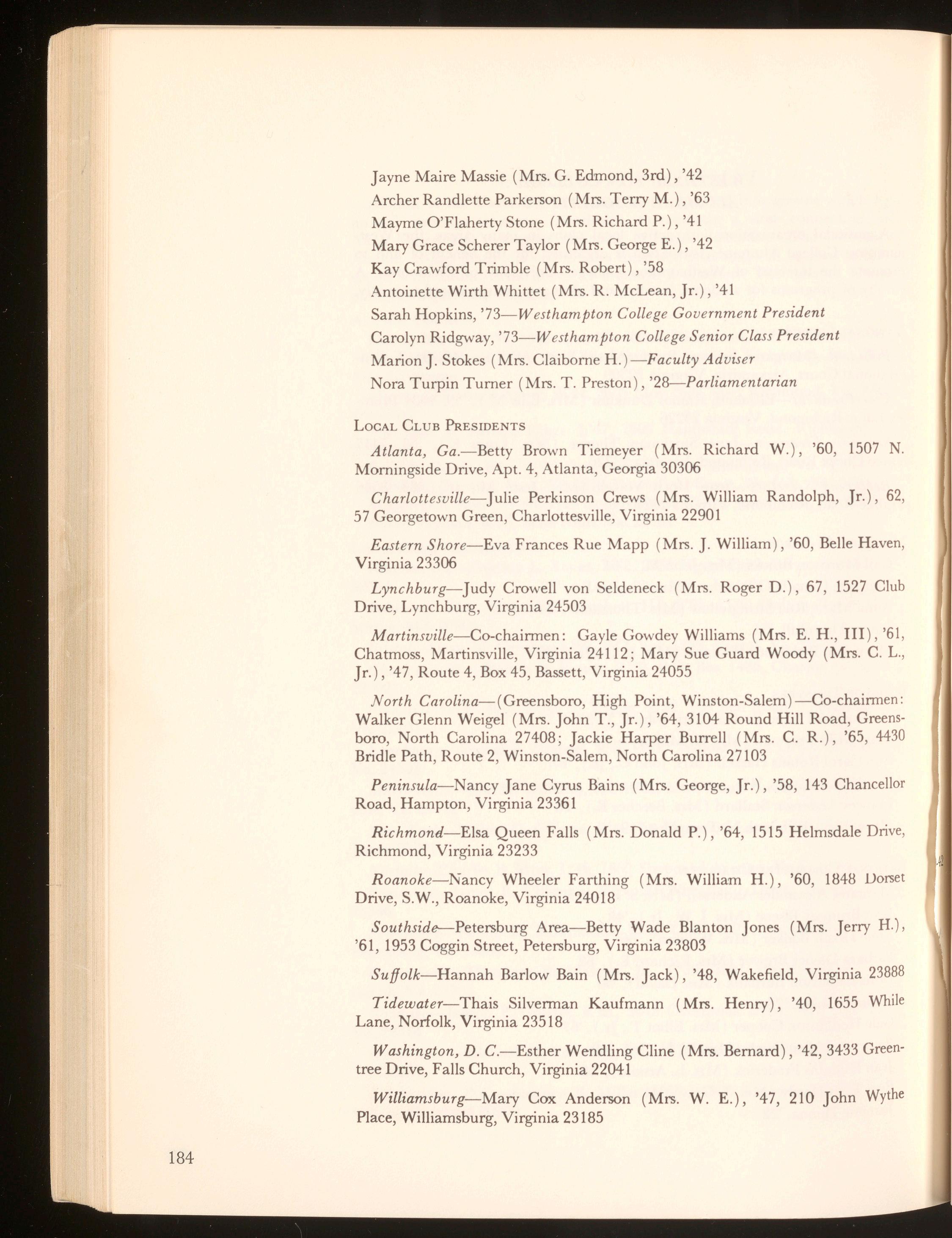 Martinsville-Co-chairmen : Gayle Gowdey Williams (Mrs. E. H ., III ), '61, Chatmoss, Martinsville, Virginia 24112; Mary Sue Guard Woody (Mrs. C . L., Jr.), '47, Route 4, Box 45, Bassett, Virginia 24055