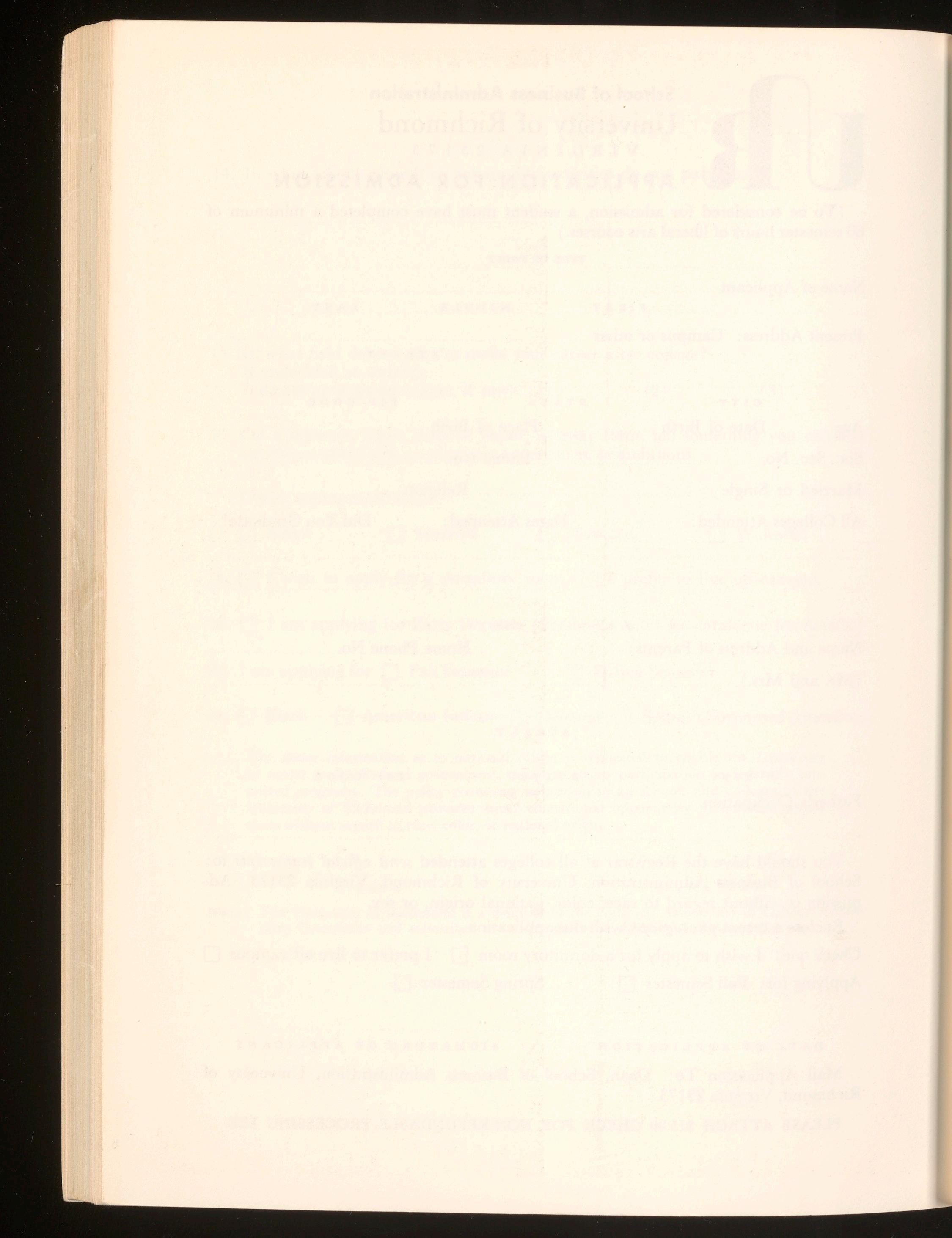 The above information as to national origin is requested to enable the University to report to the Federal government, minority group participation in federally supported programs. The policy governing admission to all schools and colleges of the University of Richmond provides equal educational opportunity to qualified applicants without regard to race, color, or national origin.