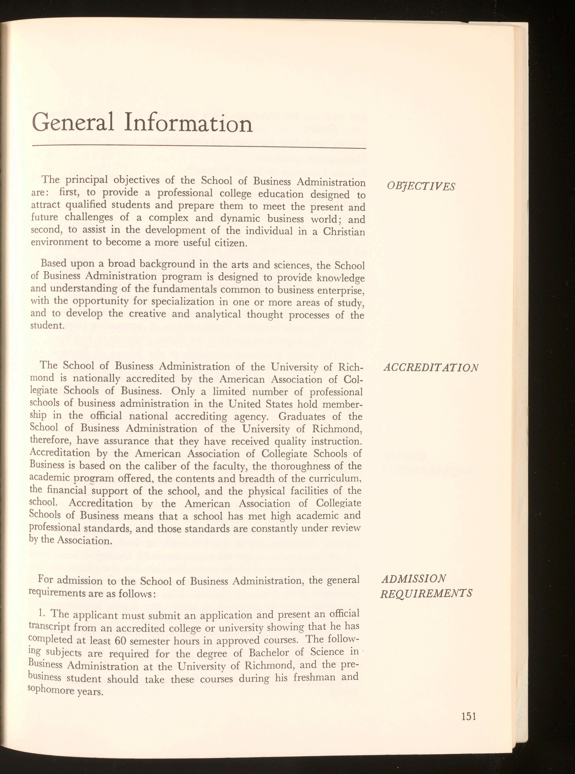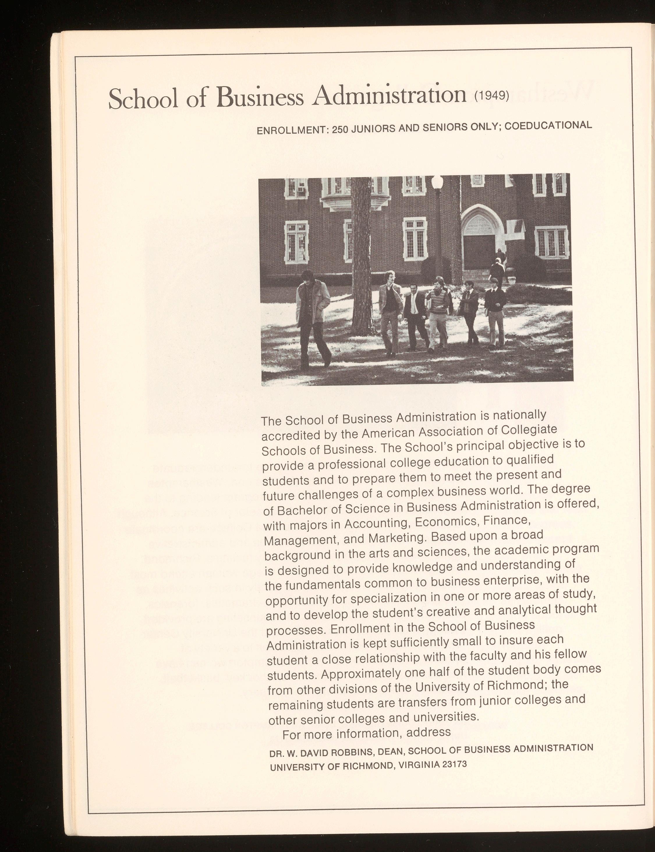 The School of Business Administration is nationally accredited by the American Association of Collegiate Schools of Business. The School's principal objective is to provide a professional college education to qualified students and to prepare them to meet the present and future challenges of a complex business world . The degree of Bachelor of Science in Business Administration is offered, with majors in Accounting , Economics , Finance, Management , and Marketing Based upon a broad background in the arts and sciences, the academic program is designed to provide knowledge and understanding of the fundamentals common to business enterprise, with the opportunity for specialization in one or more areas of study, and to develop the student's creative and analytical thought processes . Enrollment in the School of Business Administration is kept sufficiently small to insure each student a close relationship with the faculty and his fellow students Approximately one half of the student body comes from other divisions of the University of Richmond; the remaining students are transfers from junior colleges and other senior colleges and universities. For more information, address