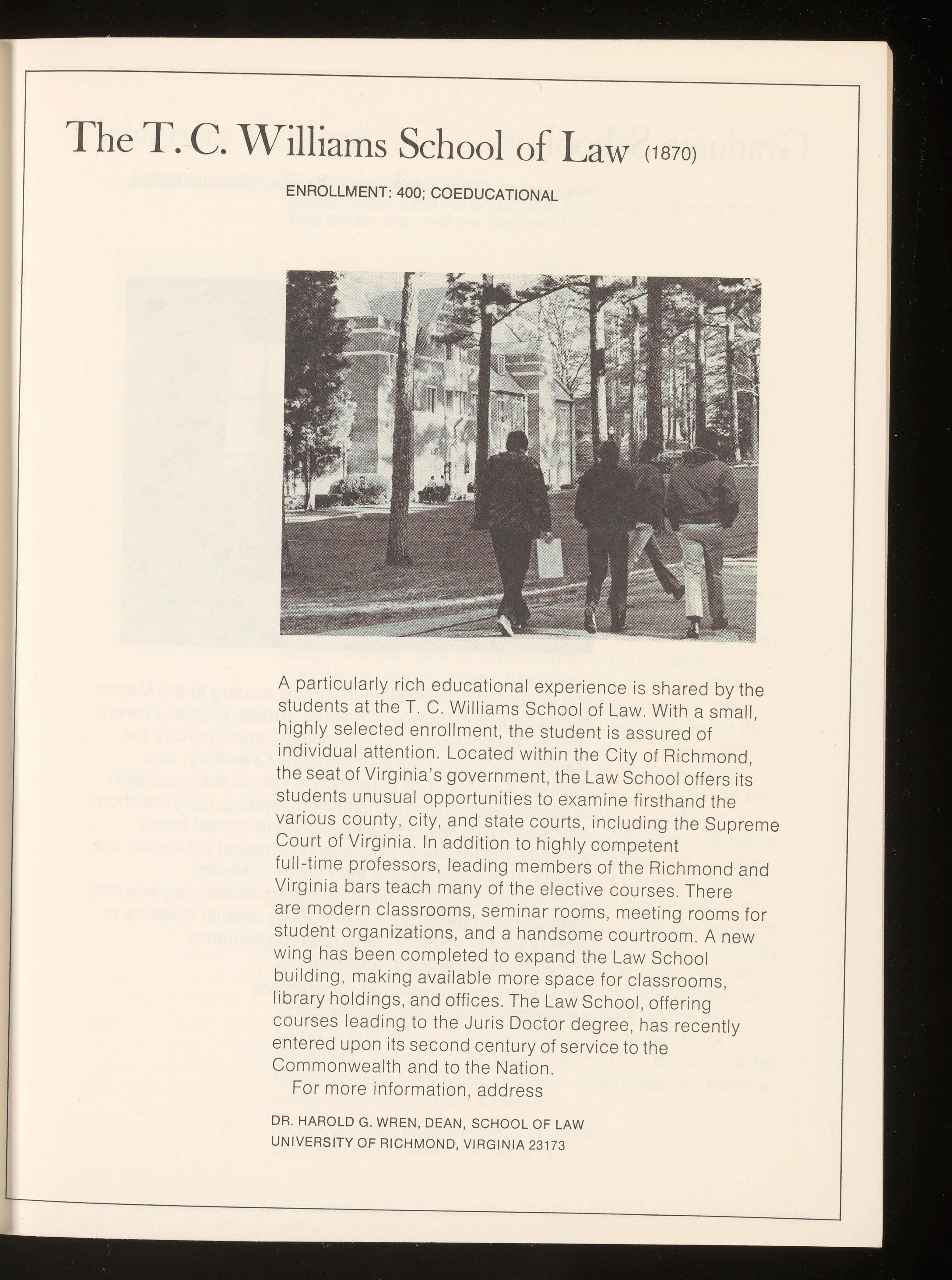 A particularly rich educational experience is shared by the students at the T. C. Williams School of Law. With a small, highly selected enrollment , the student is assured of individual attention. Located within the City of Richmond , the seat of Virginia ' s government , the Law School offers its students unusual opportunities to examine firsthand the various county , city , and state courts, including the Supreme Court of Virginia. In addition to highly competent full-time professors, leading members of the Richmond and Virginia bars teach many of the elective courses. There are modern classrooms, seminar rooms, meeting rooms for student organizations, and a handsome courtroom. A new wing has been completed to expand the Law School building, making available more space for classrooms, library holdings , and offices. The Law School , offering courses leading to the Juris Doctor degree , has recently entered upon its second century of service to the Commonwealth and to the Nation.