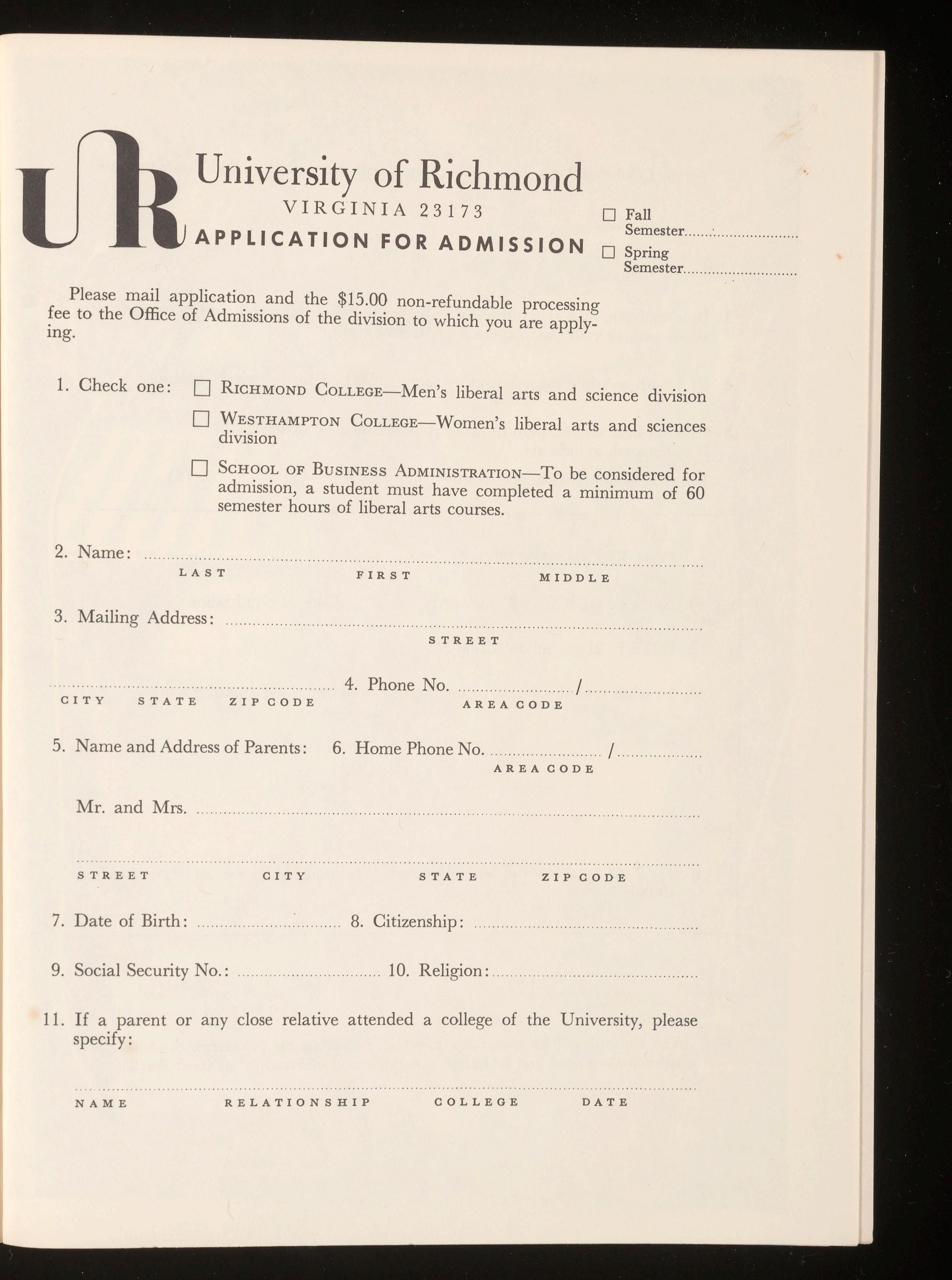 Richmond College, the oldest and largest of the six colleges and schools that make up the University of Richmond, is the coordinate liberal arts and sciences division for undergraduate men. It offers programs that lead to the Bachelor of Arts and Bachelor of Science degrees. Fields of concentration are offered in 21 academic areas. Pre-medical, pre-dental, pre-law, pre-business, and pre-forestry courses are also offered. Twelve national fraternities have chapters on the campus. Students also enjoy the varied social and cultural opportunities available in the City of Richmond. The $10 million Robins Center on the campus provides the most modern facilities for physical education and intercollegiate athletics. Recent additions of an all-weather Chevron track, all-weather tennis courts, and a baseball diamond complement the Center. There is ample opportunity to participate in a variety of cocurricular activities.