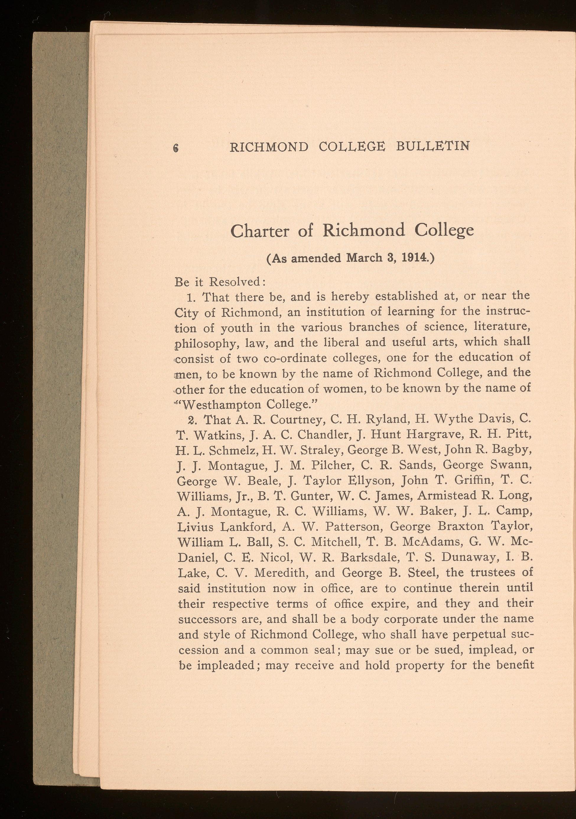 2. That A. R. Courtney, C.H. Ryland, H. Wythe Davis, C. T. Watkins, J. A. C. Chandler, J. Hunt Hargrave, R. H. Pitt, H. L. Schmelz, H. W. Straley, George B. West, John R. Bagby, J. J. Montague, J. M. Pilcher, C. R. Sands, George Swann, George W. Beale, J. Taylor Ellyson, John T. Griffin, T. C. Williams, Jr., B. T. Gunter, W. C. James, Armistead R. Long, A. J. Montague, R. C. Williams, W. W. Baker, J. L. Camp, Livius Lankford, A. W. Patterson, George Braxton Taylor, William L. Ball, S. C. Mitchell, T. B. McAdams, G. W. McDaniel, C. E. Nicol, W. R. Barksdale, T. S. Dunaway, I. B. Lake, C. V. Meredith, and George B. Steel, the trustees of said institution now in office, are to continue therein until their respective terms of office expire, and they and their successors are, and shall be a body corporate under the name and style of Richmond College, who shall have perpetual succession and a common seal; may sue or be sued, implead, or be impleaded; may receive and hold property for the benefit