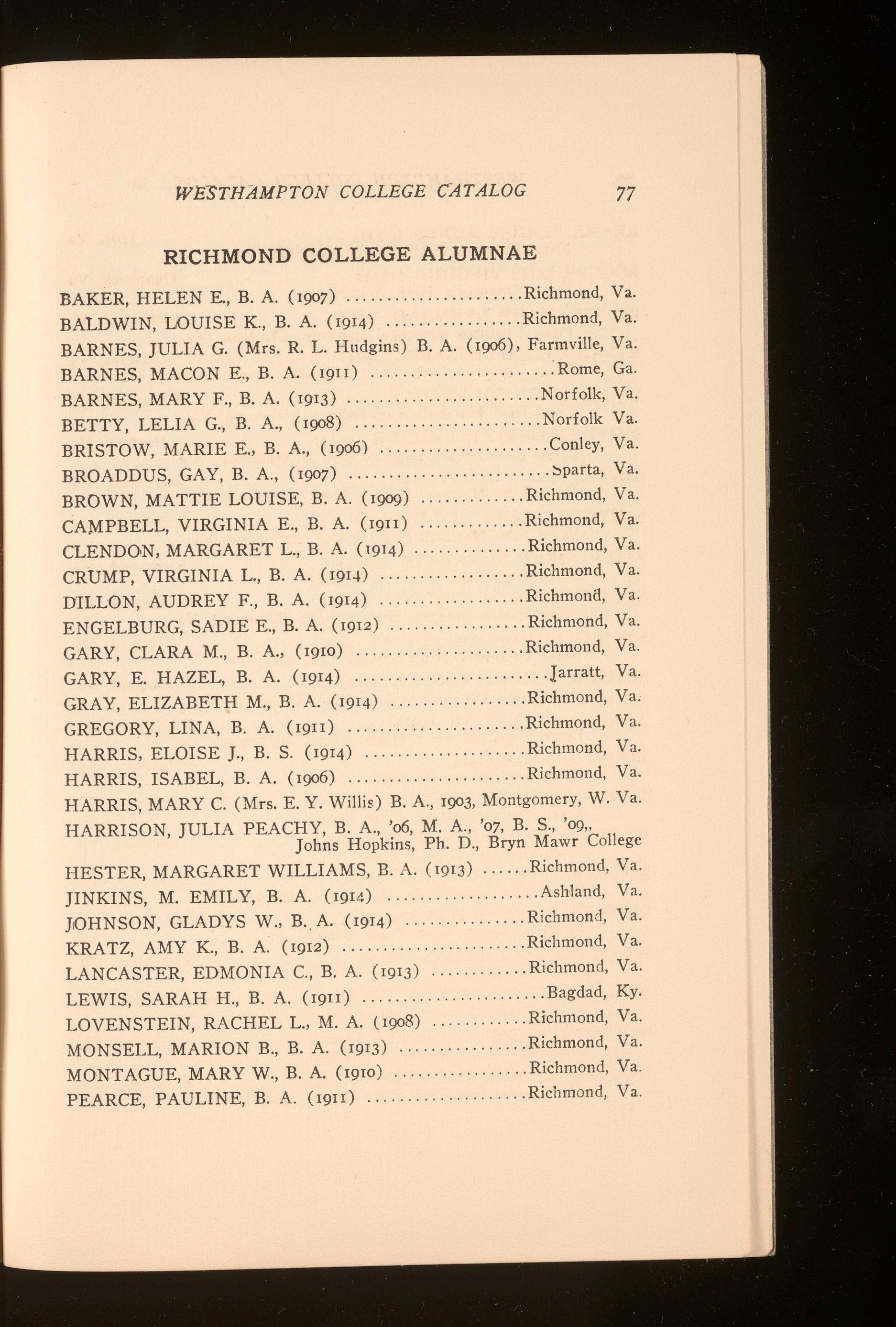 TREVVETT, LILLY F., B. A. (1909) ........ Johns Hopkins University TYLER, MARY HAWES, B. A. (1907) ............... Gwathmey, Va. WALKER, ISABELL., B. A. (1908) ................... Richmond , Va. WARE, VIRGINIA I. (Mrs. Goodwin Frazer) B. A. ( 1910) Locust Dale, Va. WILLIAMS, BERTHA B., B. A. (1903) ... ........... Richmond, Va. WILLIAMS, E. WIRT (Mrs. B. D. Gaw) B. A. (1903) Washington, D. C. WINSTON, LULIE G., B. S. (1899), Johns Hopkins, Ph.D., Farmville, Va. WOOD, JESSIE MANSFIELD, B. A. (1912) .... Westhampton College