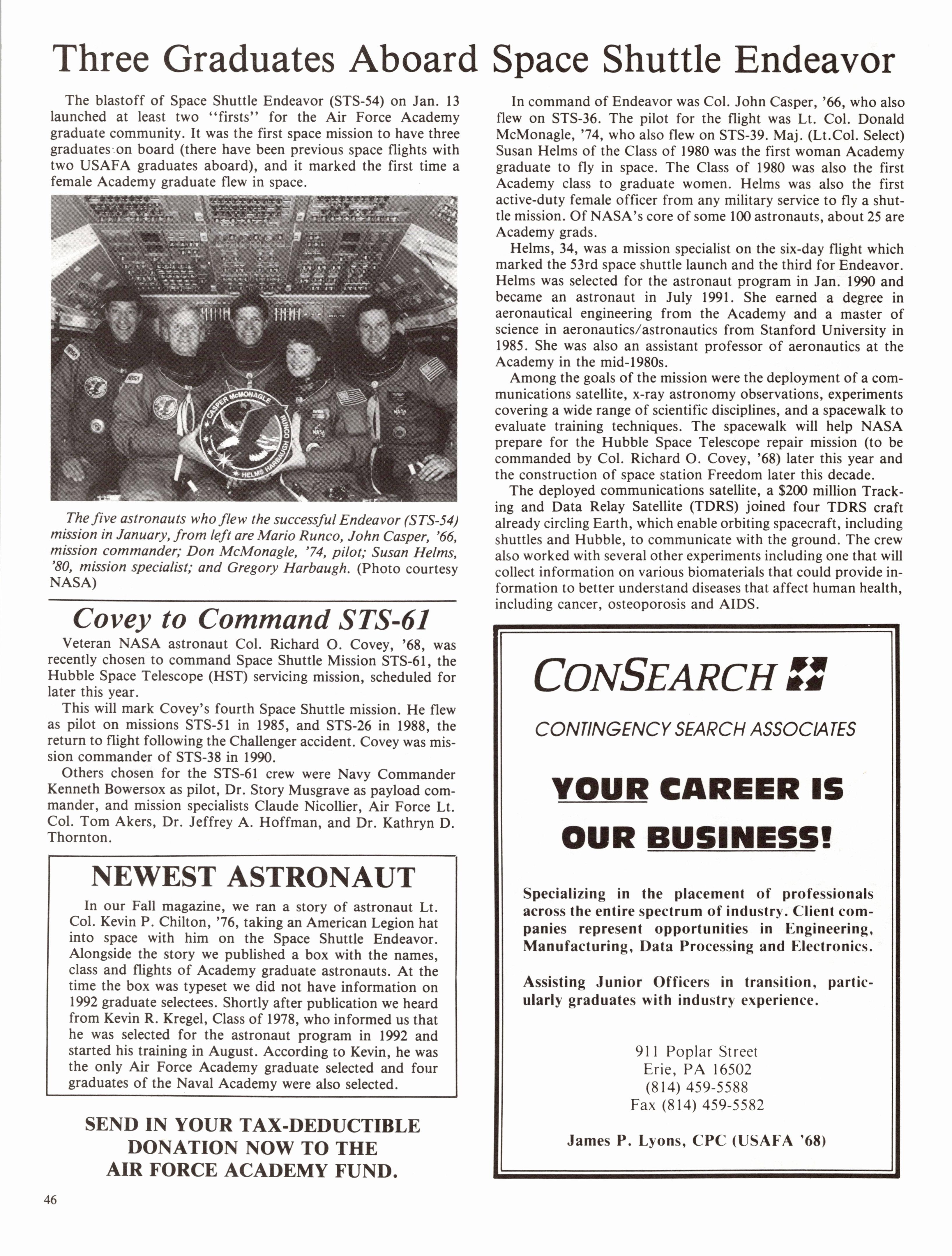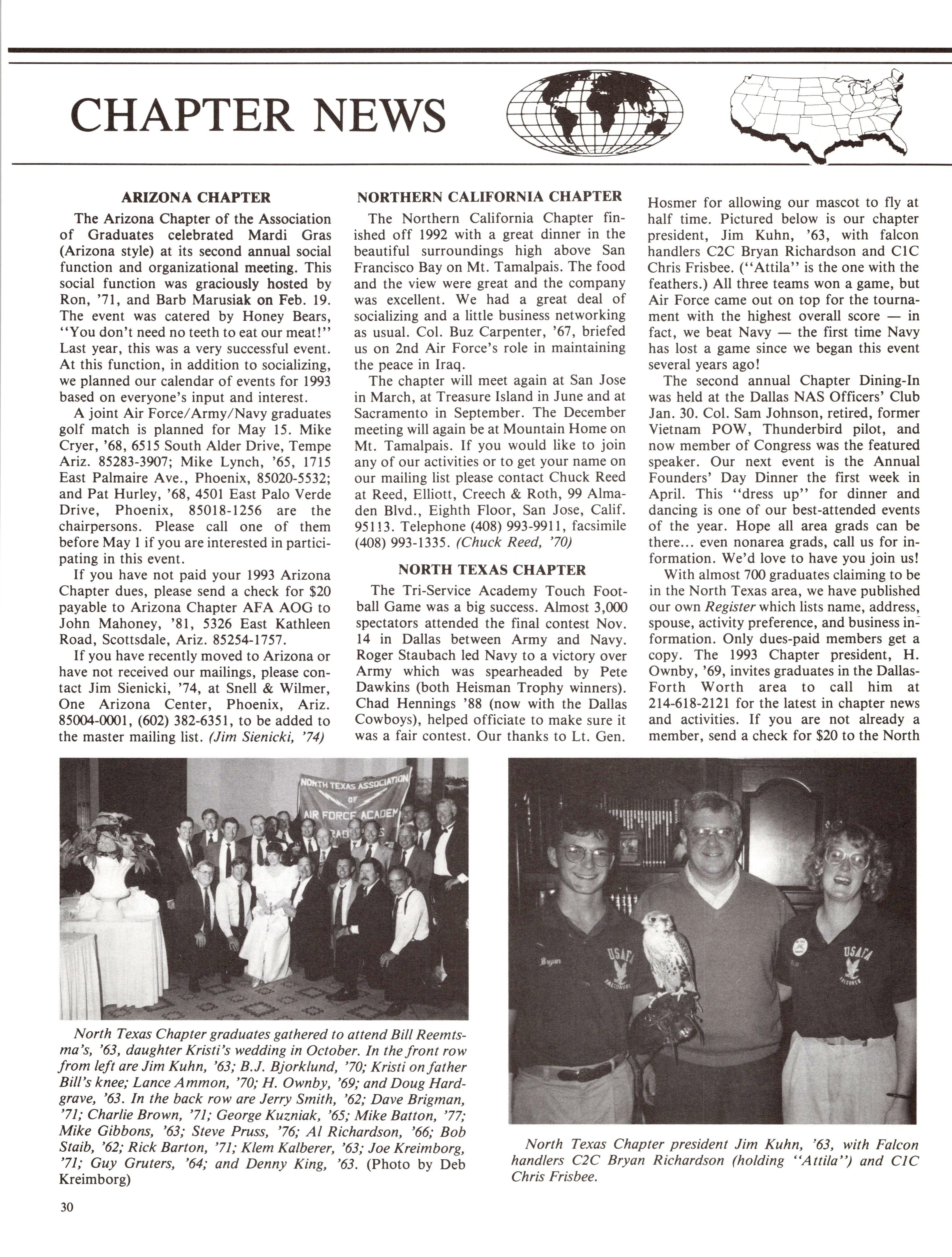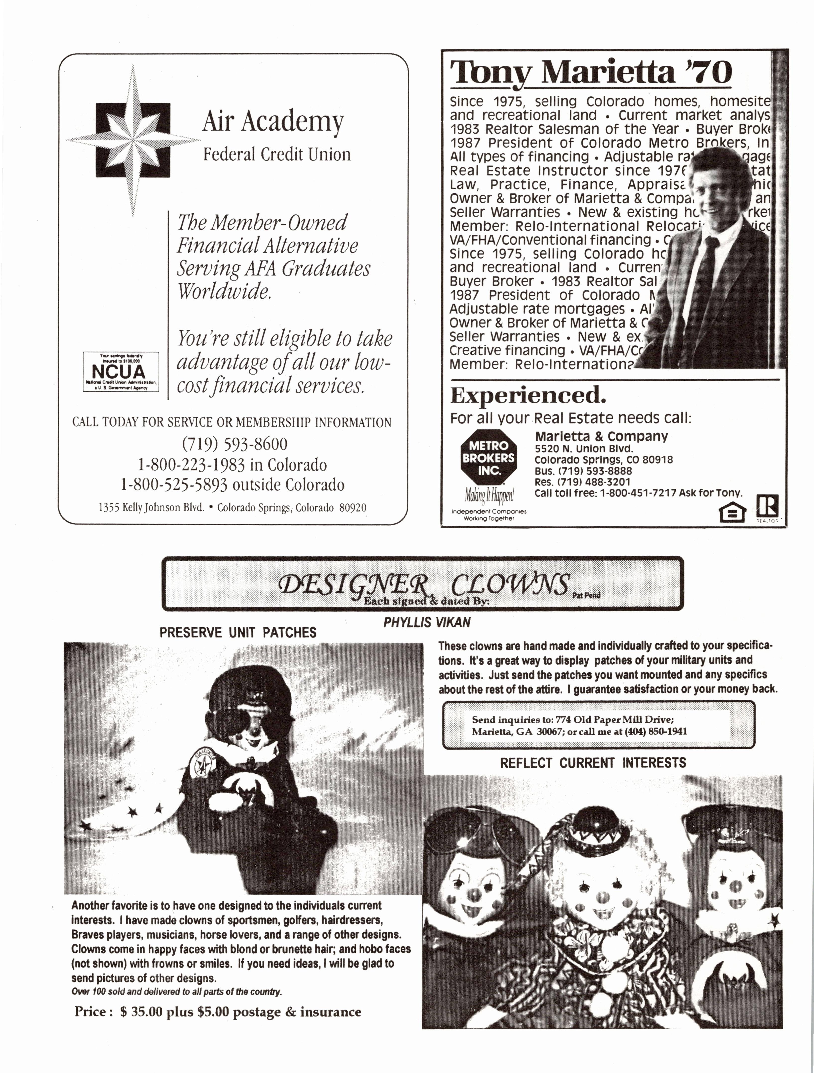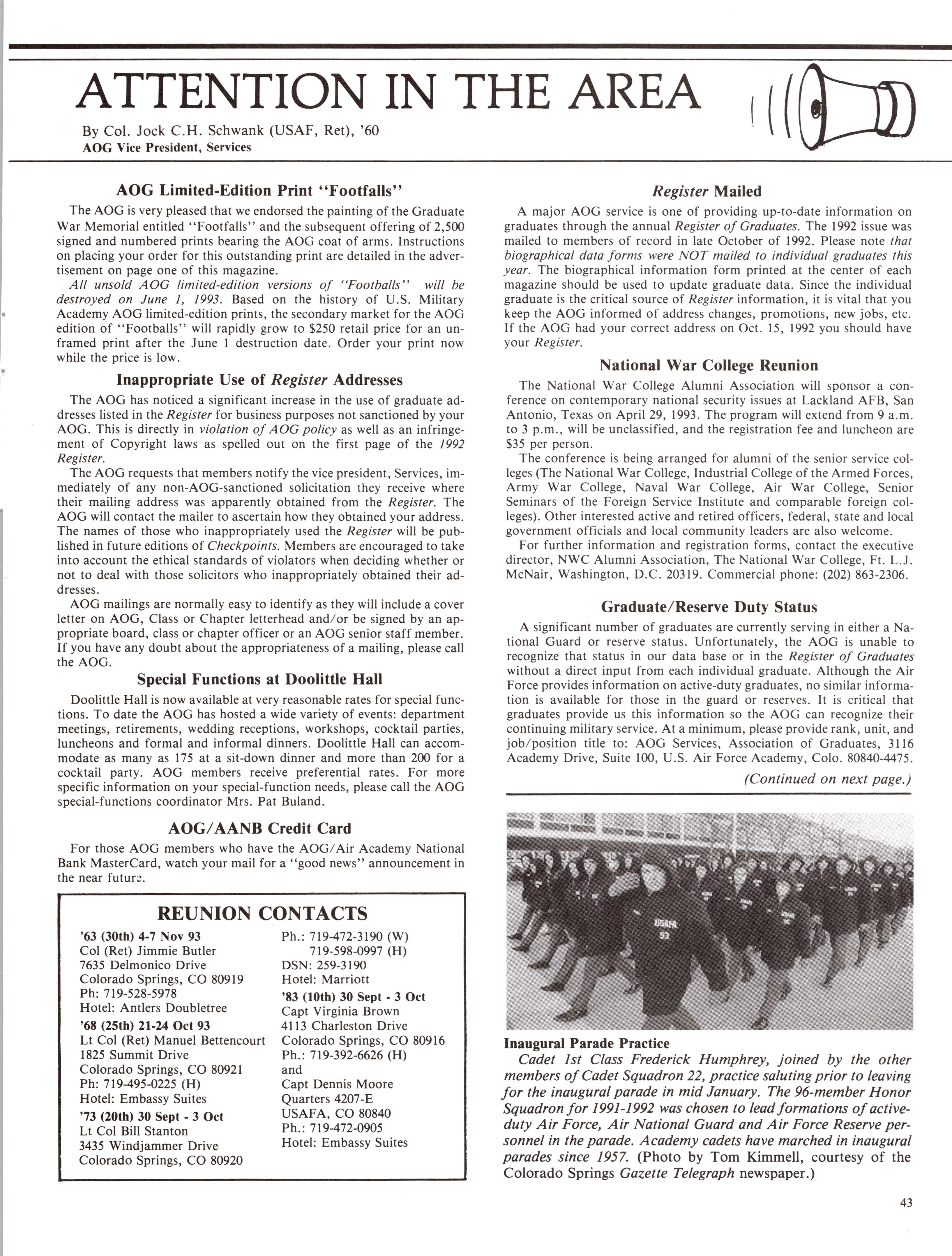 Opinions expressed in this magazine are those of the authors. They do not necessarily reflect the opinions, policy or attitude of the Association of Graduates, its officers or the editorial staff. The appearance of advertisements in this publication does not constitute an endorsement by the Association of Graduates of the products or services advertised. Copyright, Association of Graduates of the U.S. Air Force Academy, Winter 1992-93.