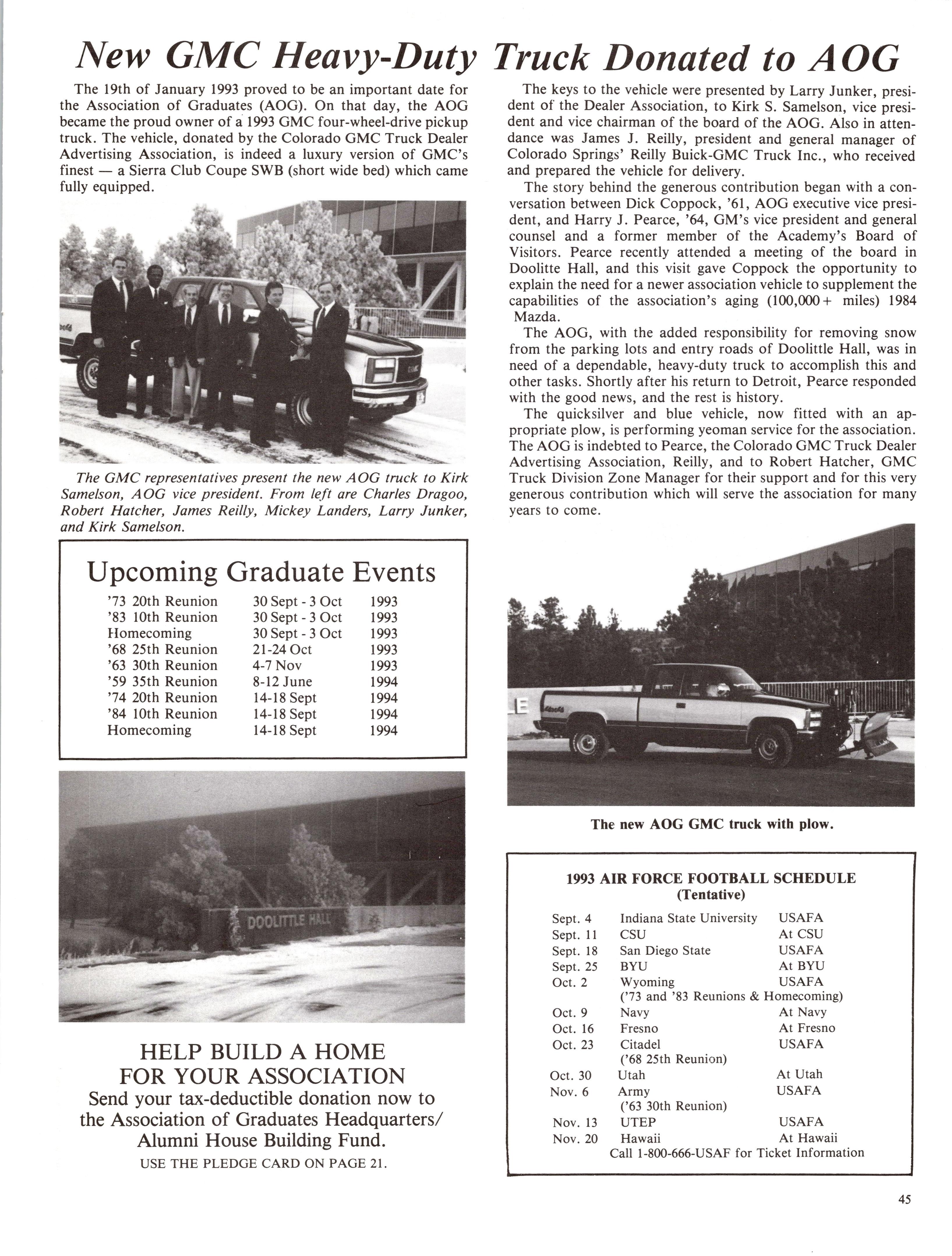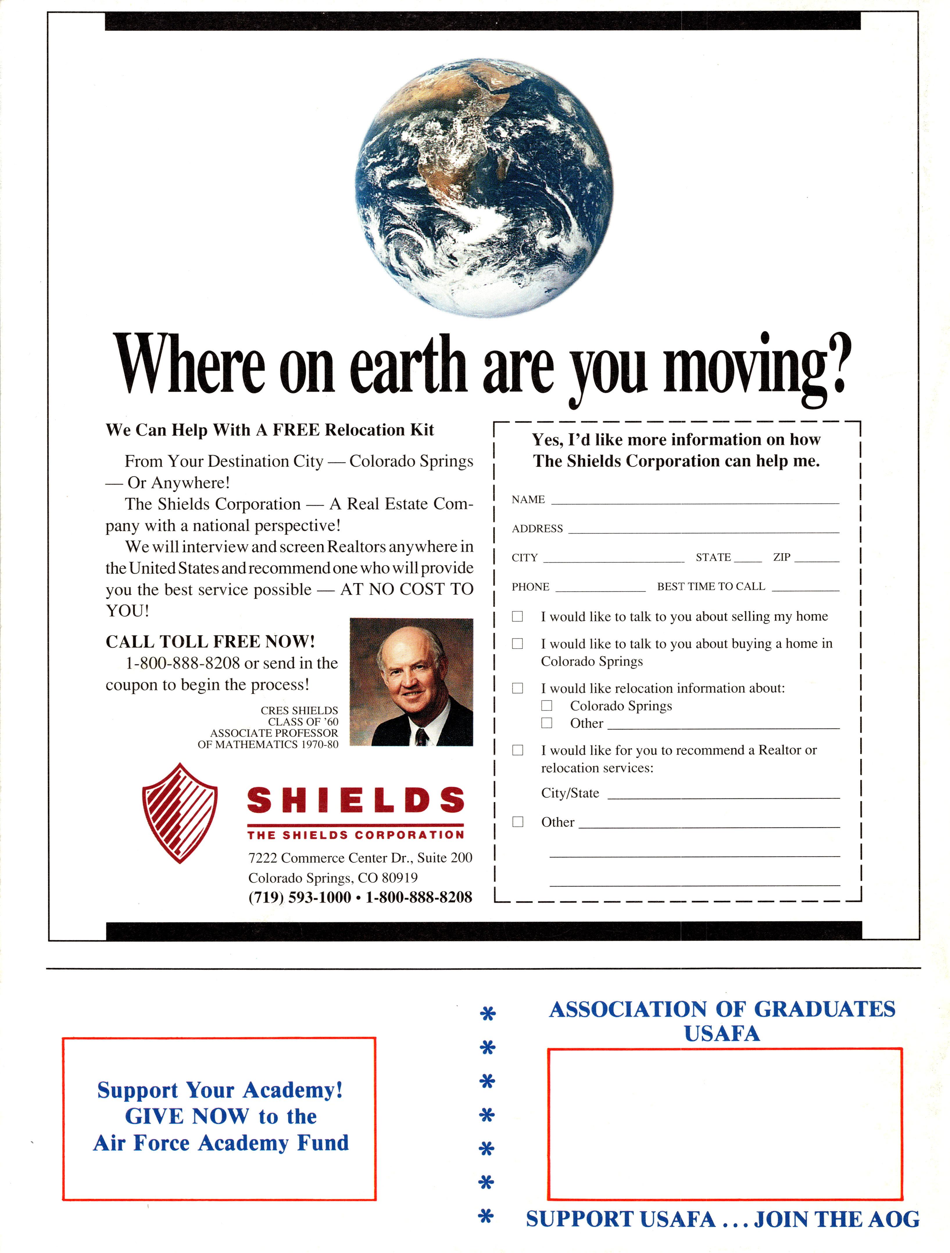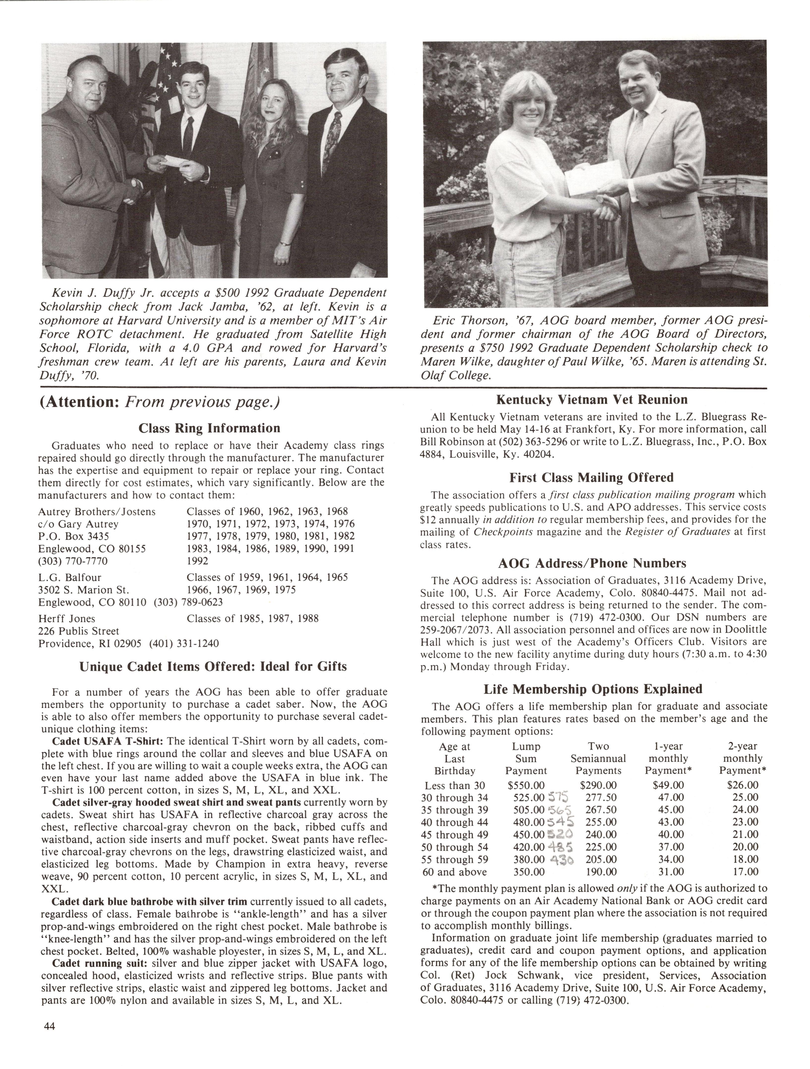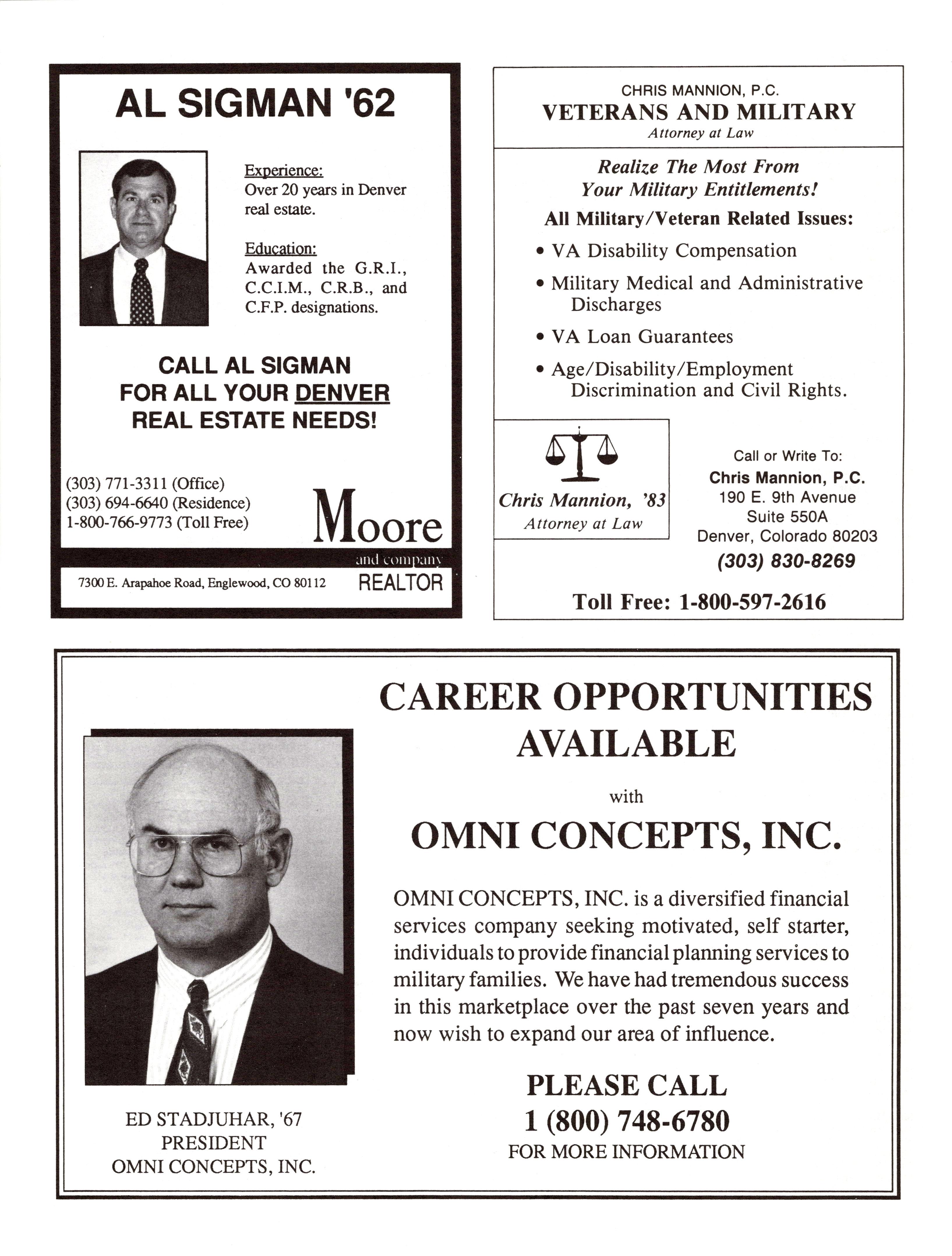 Opinions expressed in this magazine are those of the authors. They do not necessarily reflect the opinions, policy or attitude of the Association of Graduates, its officers or the editorial staff. The appearance of advertisements in this publication does not constitute an endorsement by the Association of Graduates of the products or services advertised. Copyright, Association of Graduates of the U.S. Air Force Academy, Winter 1992-93.