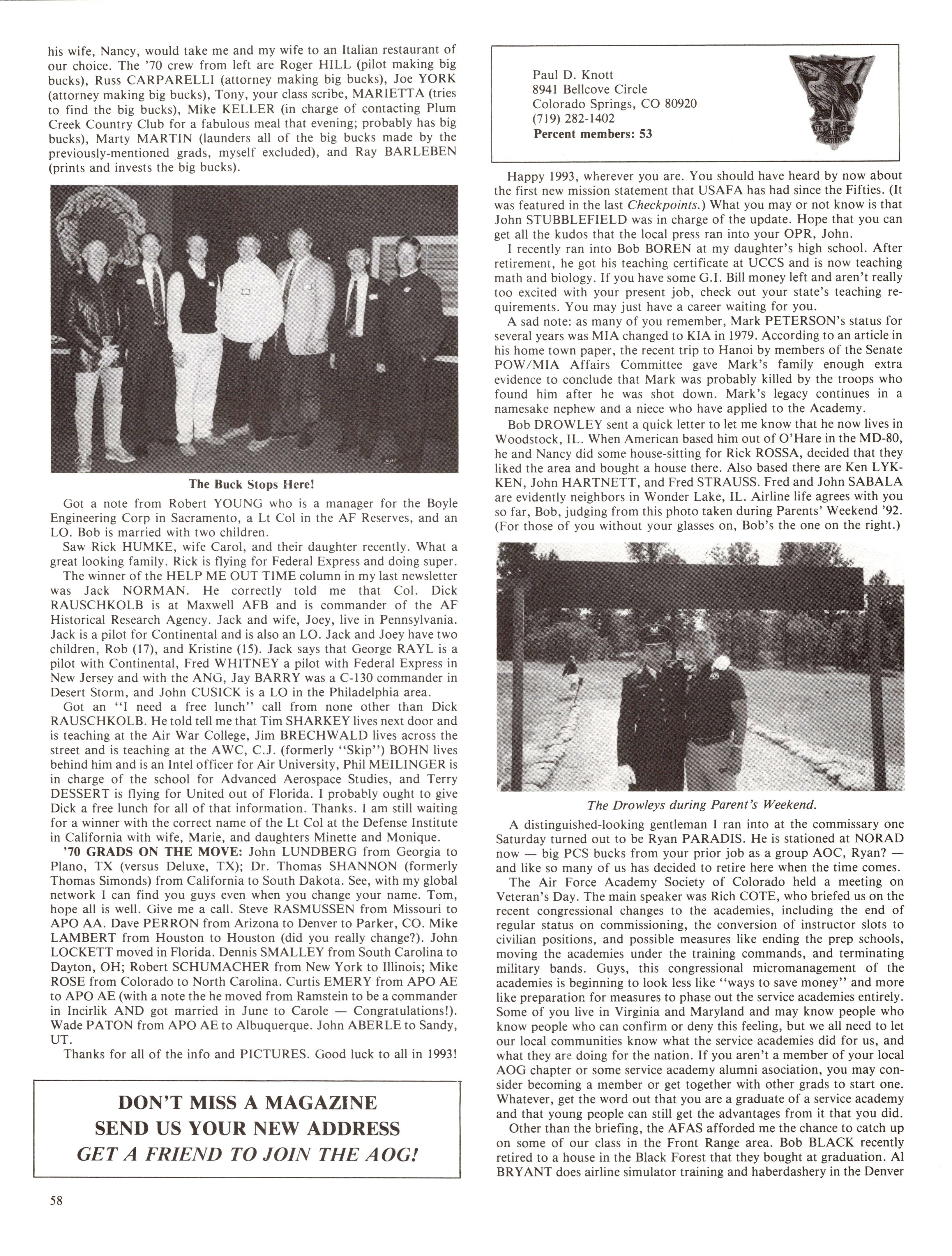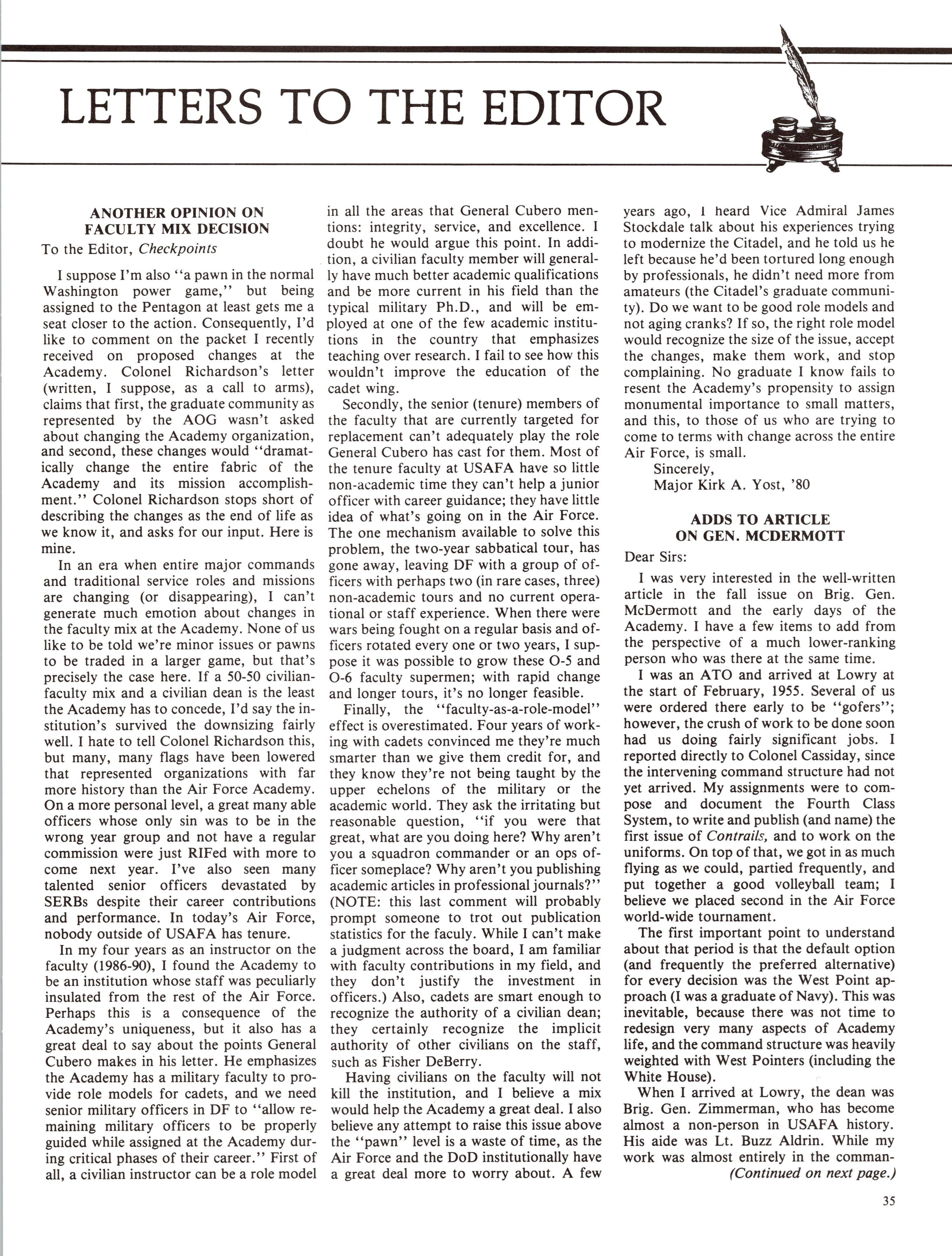 Some graduates and friends of the Academy have taken the time to express concern over some of the thoughts I put forth in past issues of Checkpoints. Some feel I have an excessively positive view of the future of the Air Force Academy while others voiced concern with my approach especially in contrast to the “Call to Arms” speech delivered by the AOG president at the Jabara Banquet in September 1992 in which graduates were asked to take an active interest in the recent directives levied by Congress.