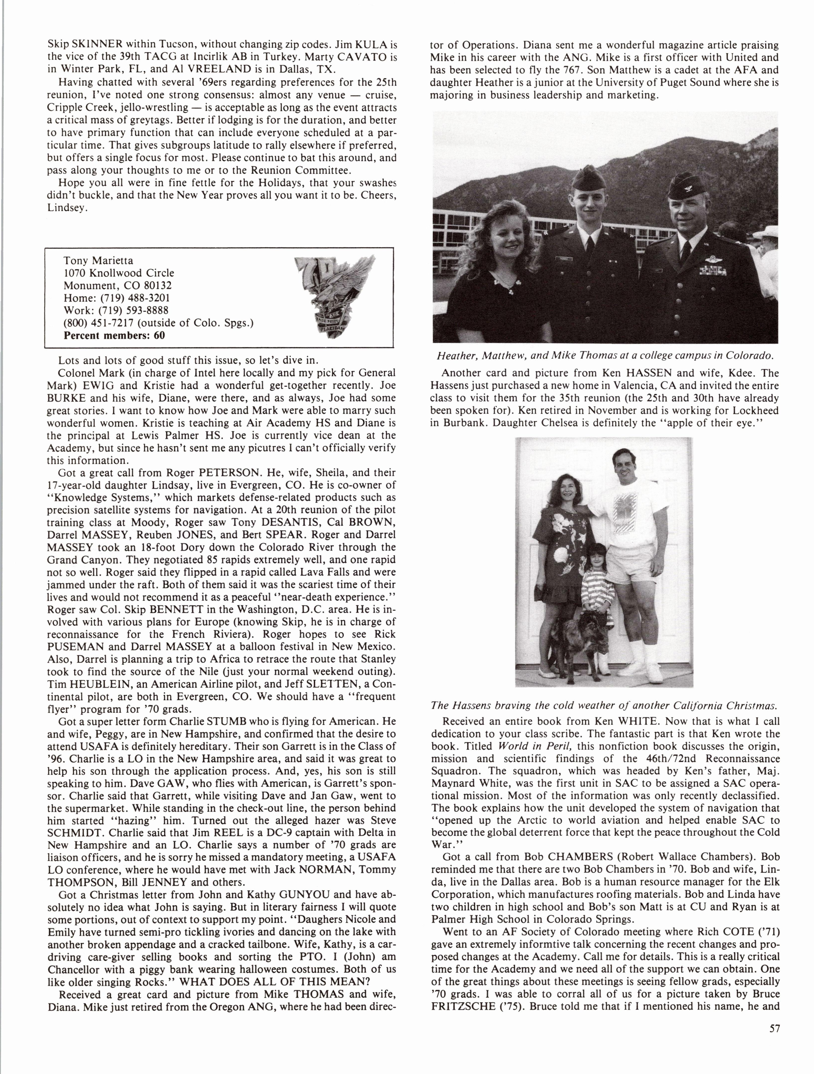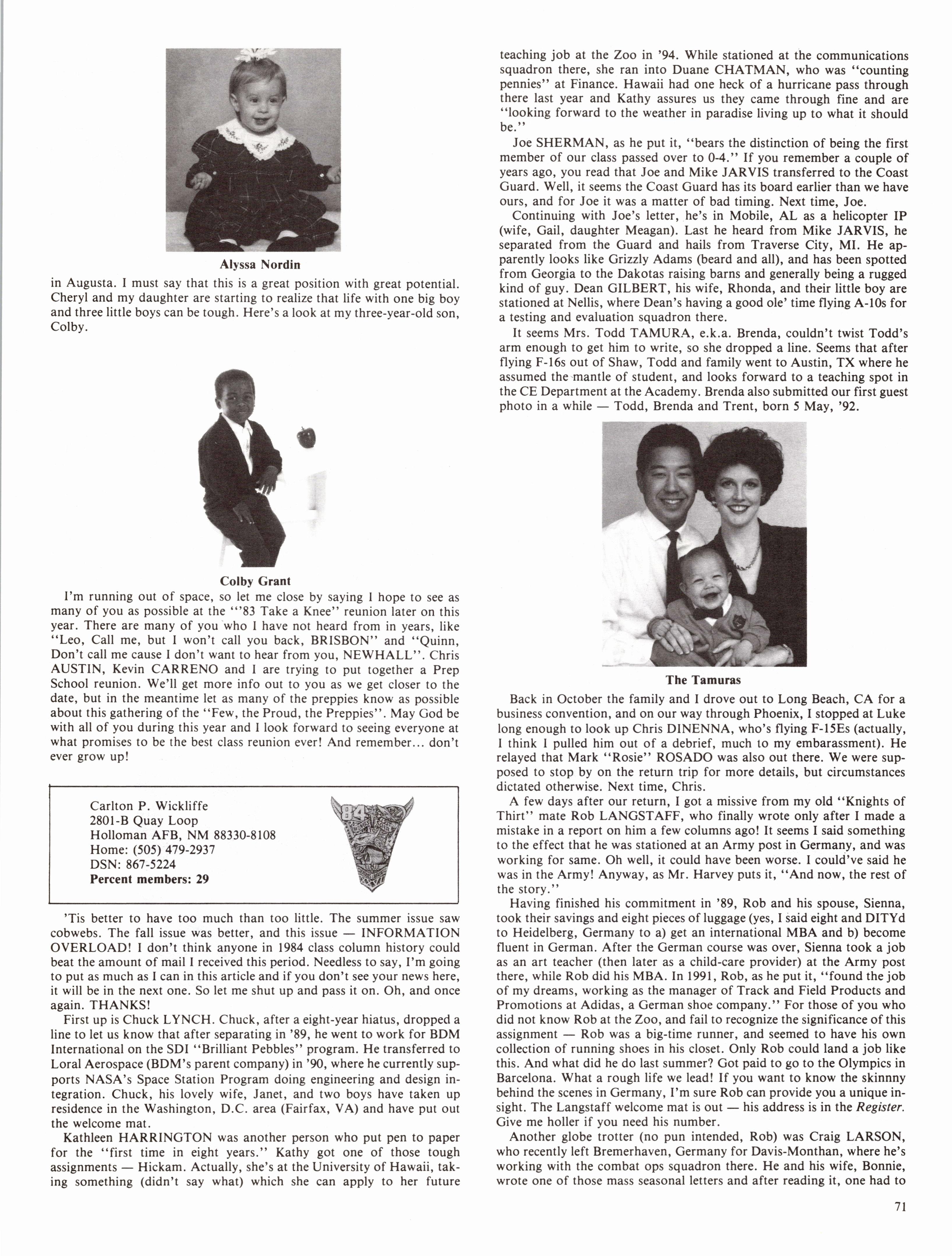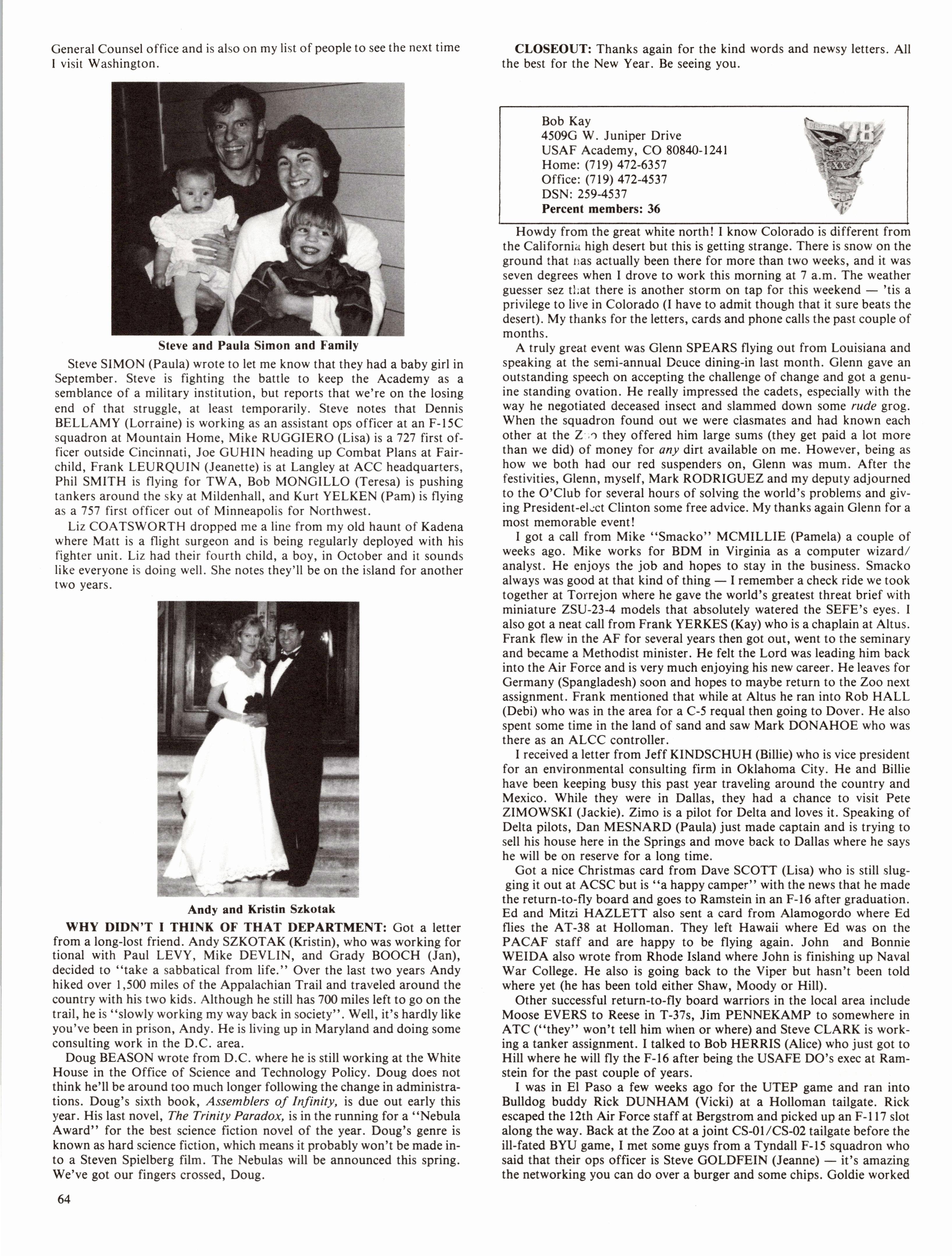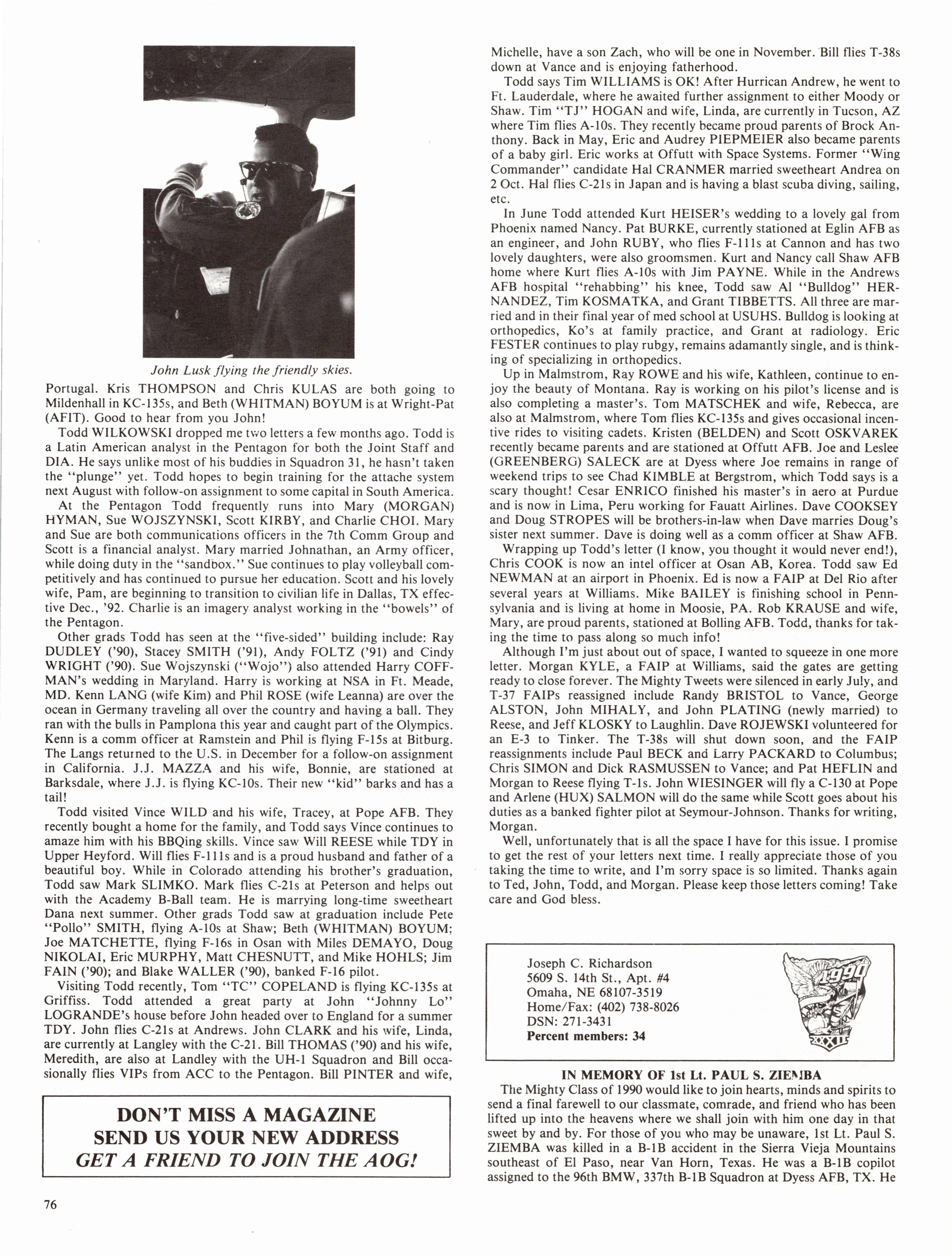 Todd visited Vince WILD and his wife, Tracey, at Pope AFB. They recently bought a home for the family, and Todd says Vince continues to amaze him with his BBQing skills. Vince saw Will REESE while TDY in Upper Heyford. Will flies F-l 1 Is and is a proud husband and father of a beautiful boy. While in Colorado attending his brother’s graduation, Todd saw Mark SLIMKO. Mark flies C-21s at Peterson and helps out with the Academy B-Ball team. He is marrying long-time sweetheart Dana next summer. Other grads Todd saw at graduation include Pete “Polio” SMITH, flying A-lOs at Shaw; Beth (WHITMAN) BOYUM: Joe MATCHETTE, flying F-16s in Osan with Miles DEMAYO, Doug NIKOLAI, Eric MURPHY, Matt CHESNUTT, and Mike HOHLS; Jim FAIN (’90); and Blake WALLER (’90), banked F-16 pilot.
