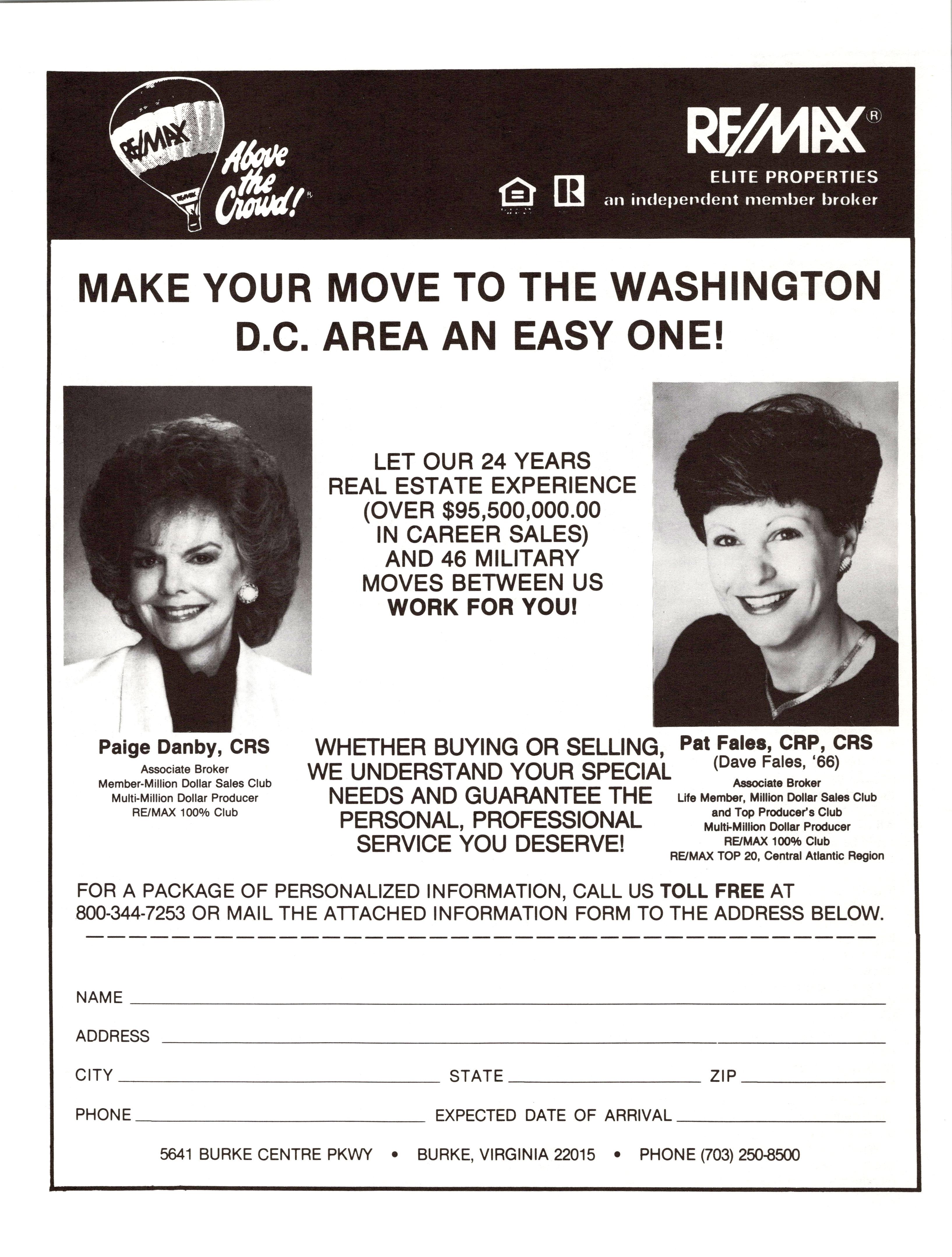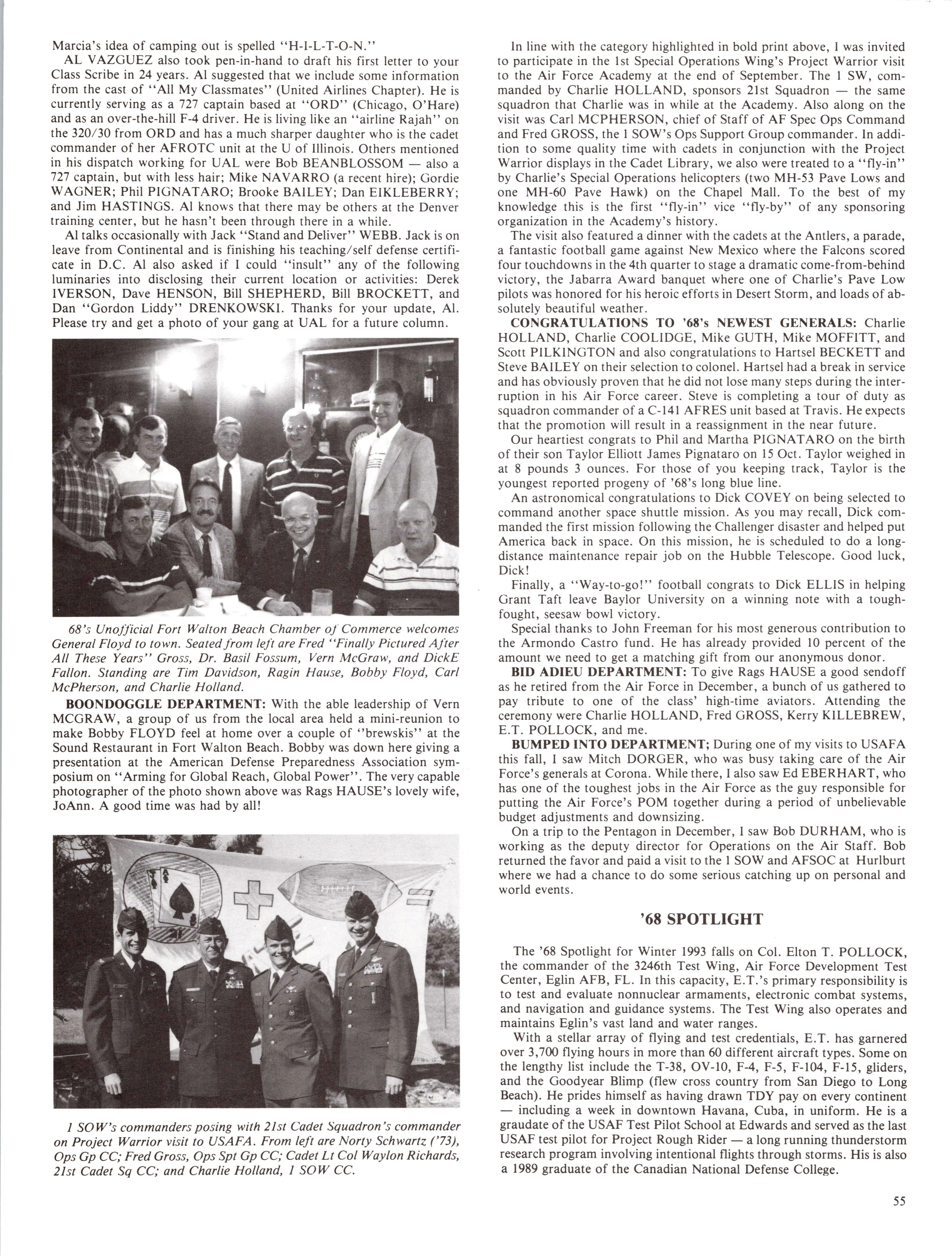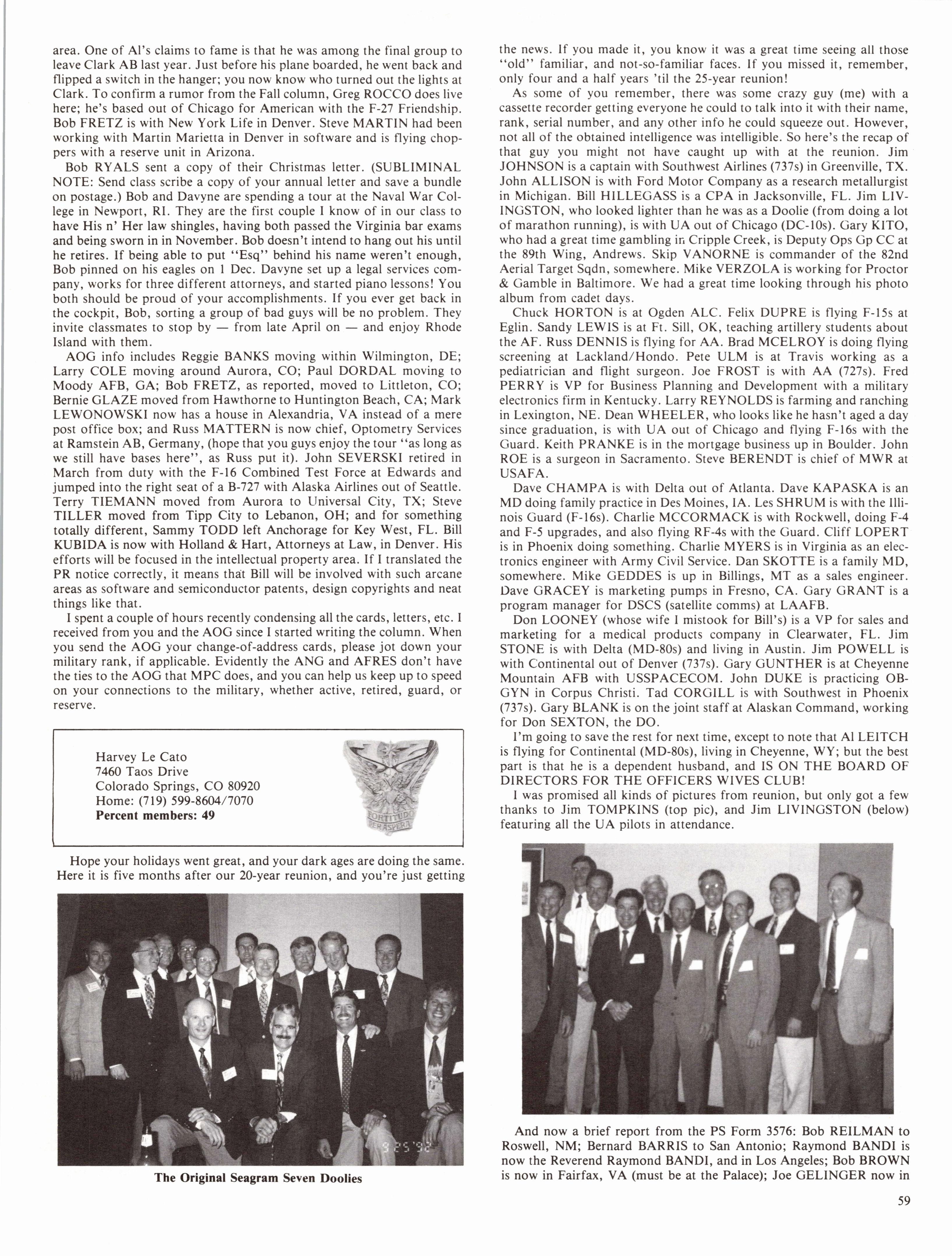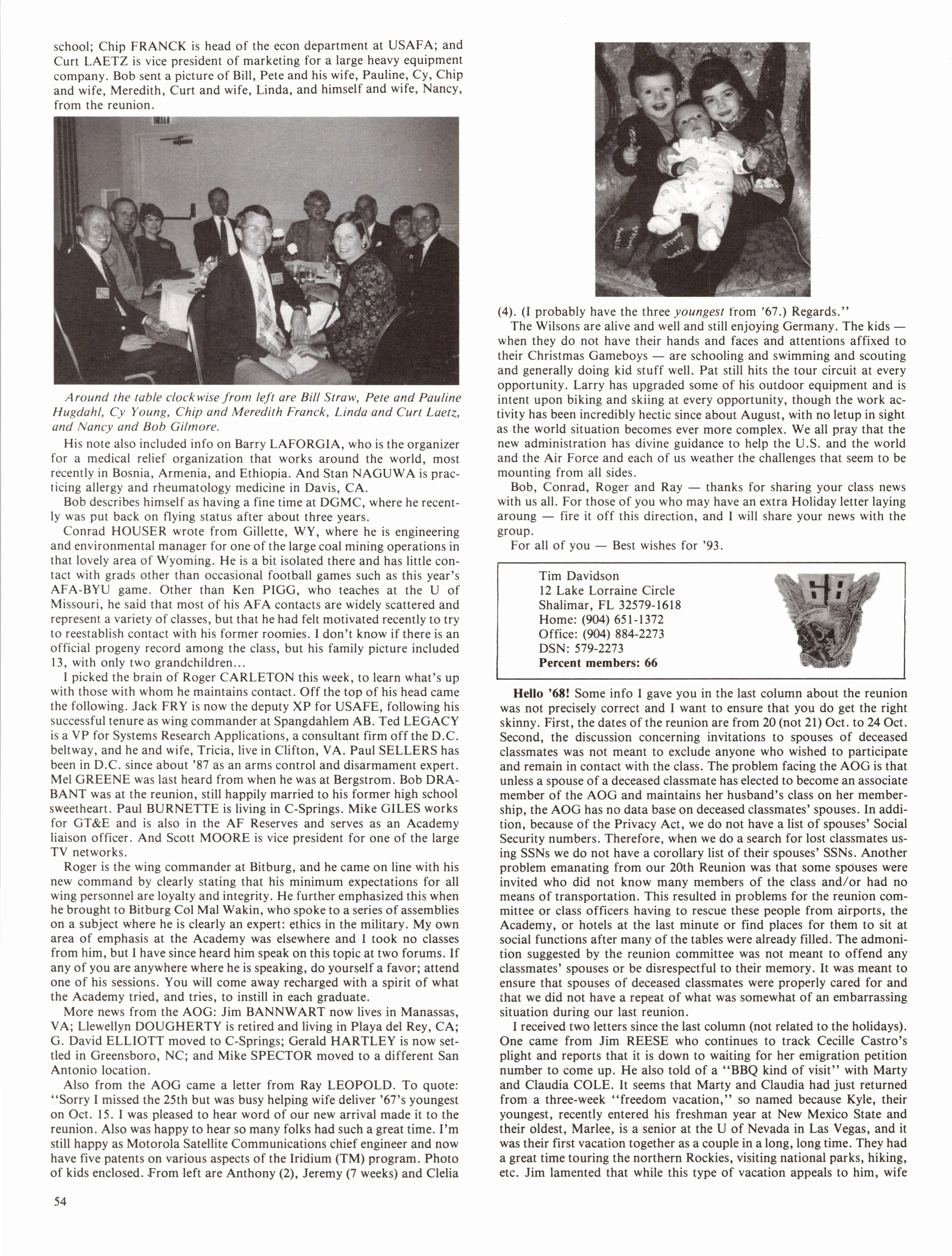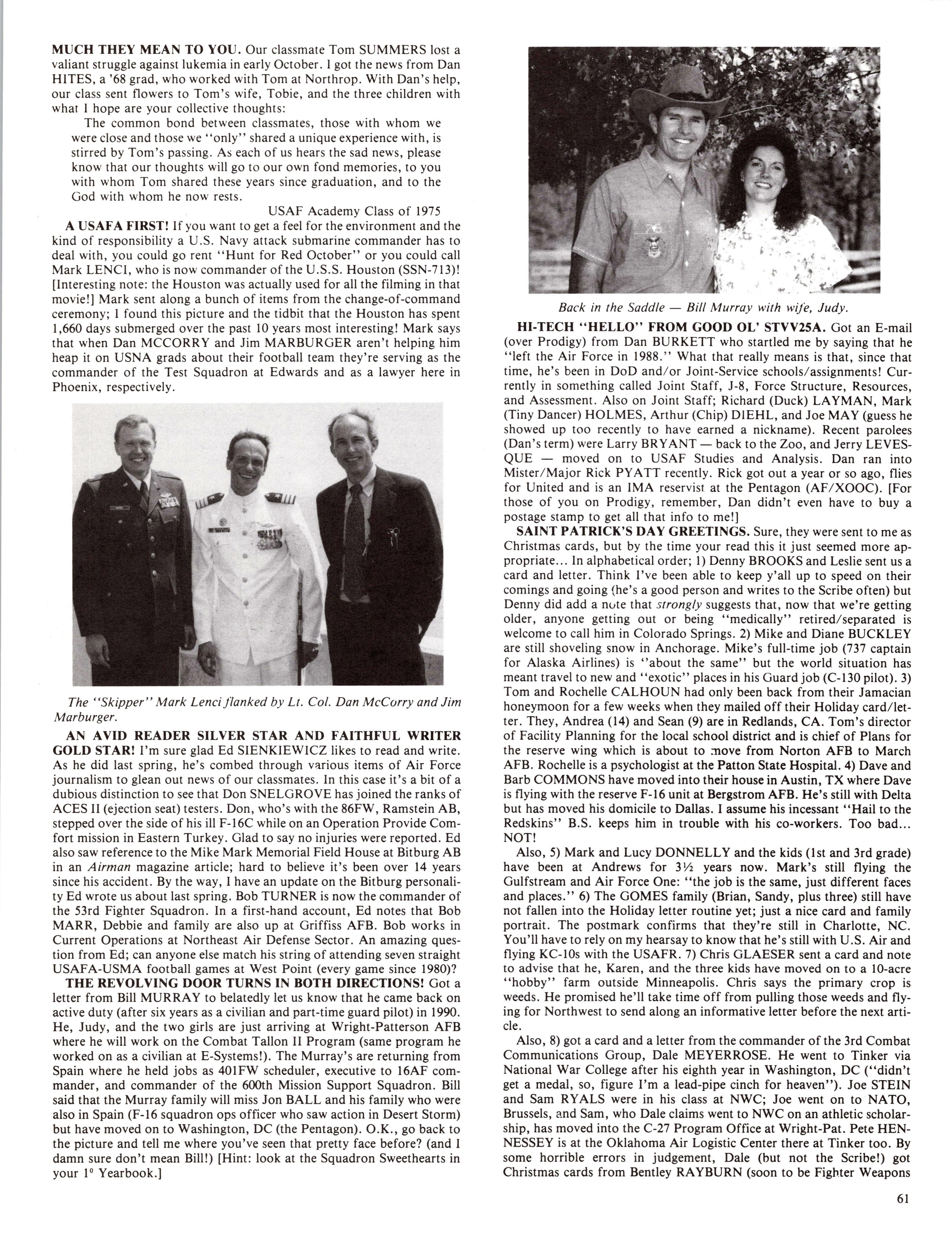Todd visited Vince WILD and his wife, Tracey, at Pope AFB. They recently bought a home for the family, and Todd says Vince continues to amaze him with his BBQing skills. Vince saw Will REESE while TDY in Upper Heyford. Will flies F-l 1 Is and is a proud husband and father of a beautiful boy. While in Colorado attending his brother’s graduation, Todd saw Mark SLIMKO. Mark flies C-21s at Peterson and helps out with the Academy B-Ball team. He is marrying long-time sweetheart Dana next summer. Other grads Todd saw at graduation include Pete “Polio” SMITH, flying A-lOs at Shaw; Beth (WHITMAN) BOYUM: Joe MATCHETTE, flying F-16s in Osan with Miles DEMAYO, Doug NIKOLAI, Eric MURPHY, Matt CHESNUTT, and Mike HOHLS; Jim FAIN (’90); and Blake WALLER (’90), banked F-16 pilot.