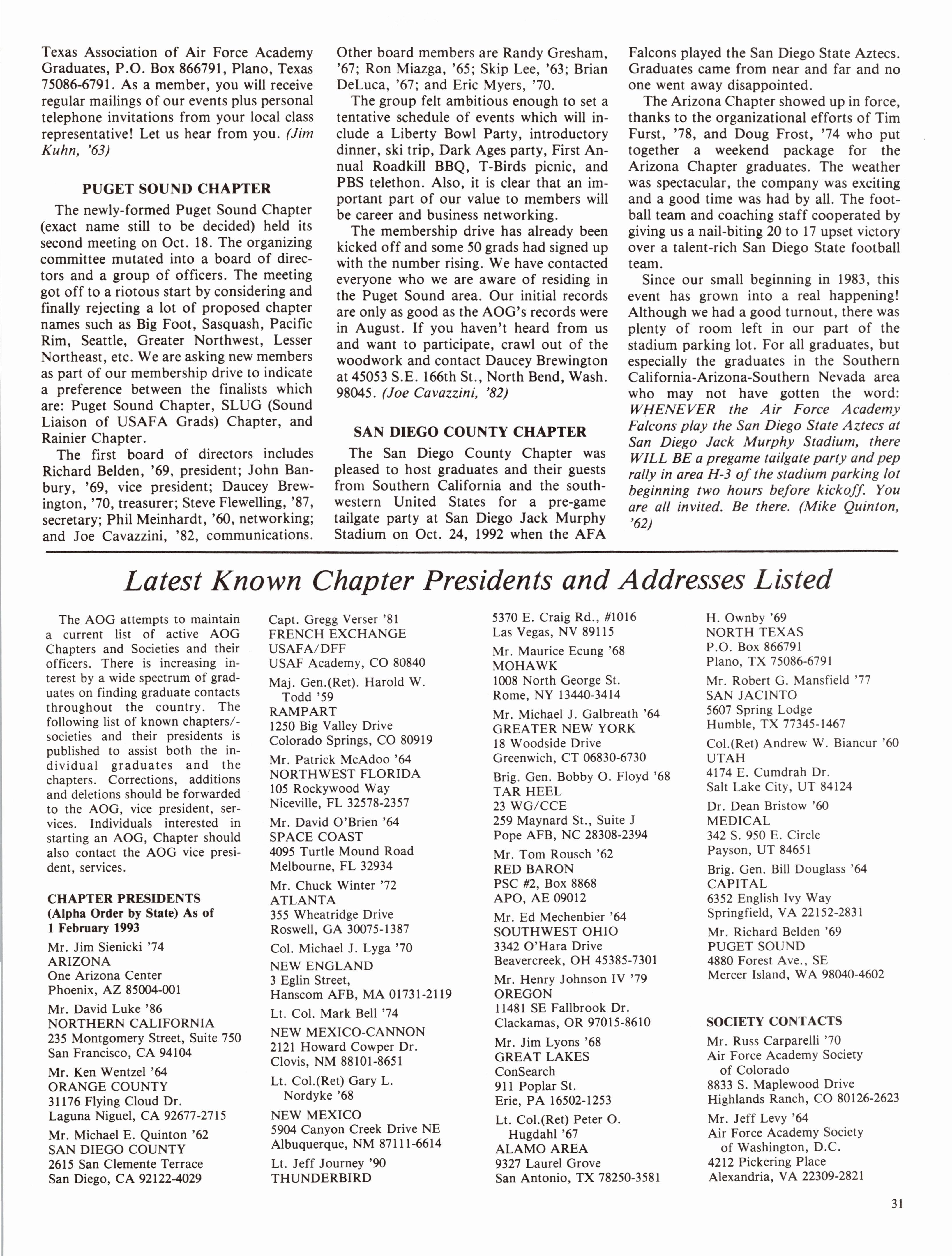 The AOG forwarded the following change of address info: Steve and Jill HARRISON, formerly at Columbus AFB, are now at SeymourJohnson. Phil HATTEMER is now at Fairchild AFB. Chris LOWE recently returned from Kunsan and is now in Wilmington, NC. Tim MOTT is in Dayton, OH. Robb RENNER is at Elmendorf in the F-15. Robert SULLIVAN has moved to Mt. Pleasant, SC. Anne CHINNERY, Brian YOO, and Randy WHITE are attending AFIT in residence at Wright-Patterson. Randy was married in October to Joy McGrath. As of August, 1992, Jim WANG is the weapons director for the 963rd AWACS at Tinker. Nathan WATANABE is now at Eielson AFB, just outside of Fairbanks, Alaska. Lastly, in early December my brother David switched accounting and finance offices from Hickam to Howard AFB, Panama. Since lots of our family lives in Panama, he’s really enjoying his new assignment. Write!