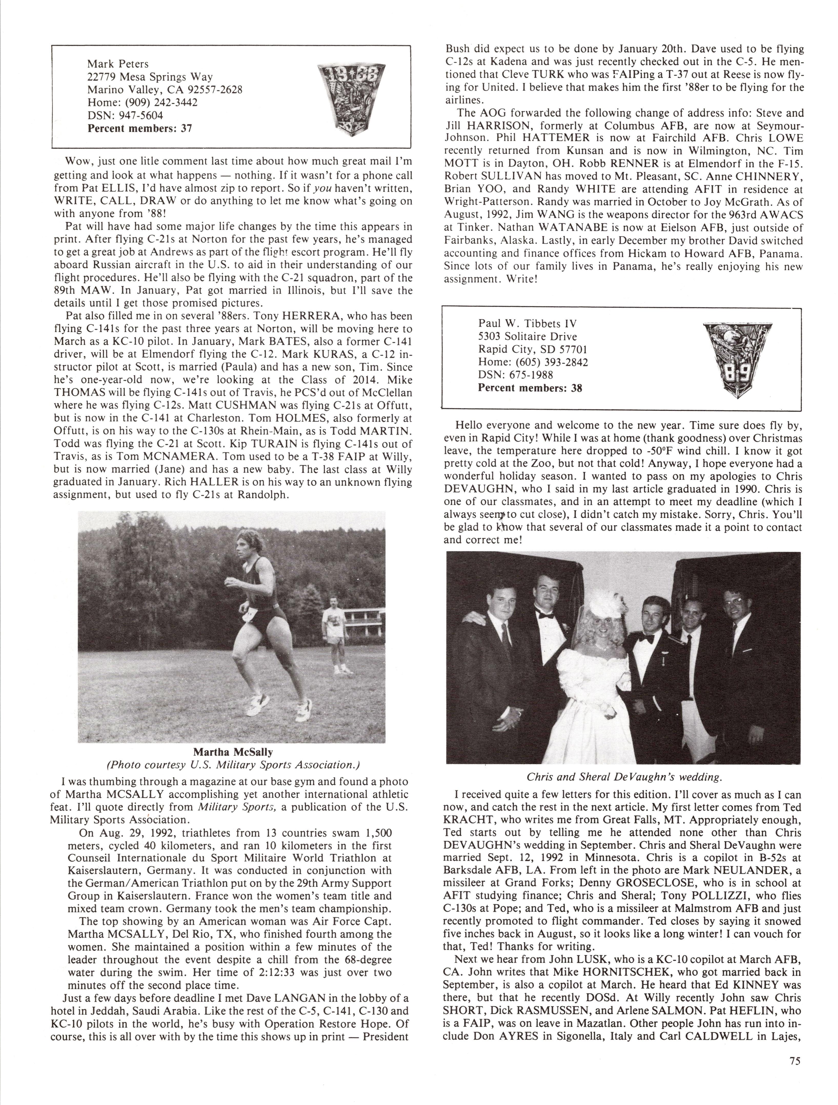 I received quite a few letters for this edition. I’ll cover as much as I can now, and catch the rest in the next article. My first letter comes from Ted KRACHT, who writes me from Great Falls, MT. Appropriately enough, Ted starts out by telling me he attended none other than Chris DEVAUGHN’s wedding in September. Chris and Sheral DeVaughn were married Sept. 12, 1992 in Minnesota. Chris is a copilot in B-52s at Barksdale AFB, LA. From left in the photo are Mark NEULANDER, a missileer at Grand Forks; Denny GROSECLOSE, who is in school at AFIT studying finance; Chris and Sheral; Tony POLLIZZI, who flies C-130s at Pope; and Ted, who is a missileer at Malmstrom AFB and just recently promoted to flight commander. Ted closes by saying it snowed five inches back in August, so it looks like a long winter! I can vouch for that, Ted! Thanks for writing.