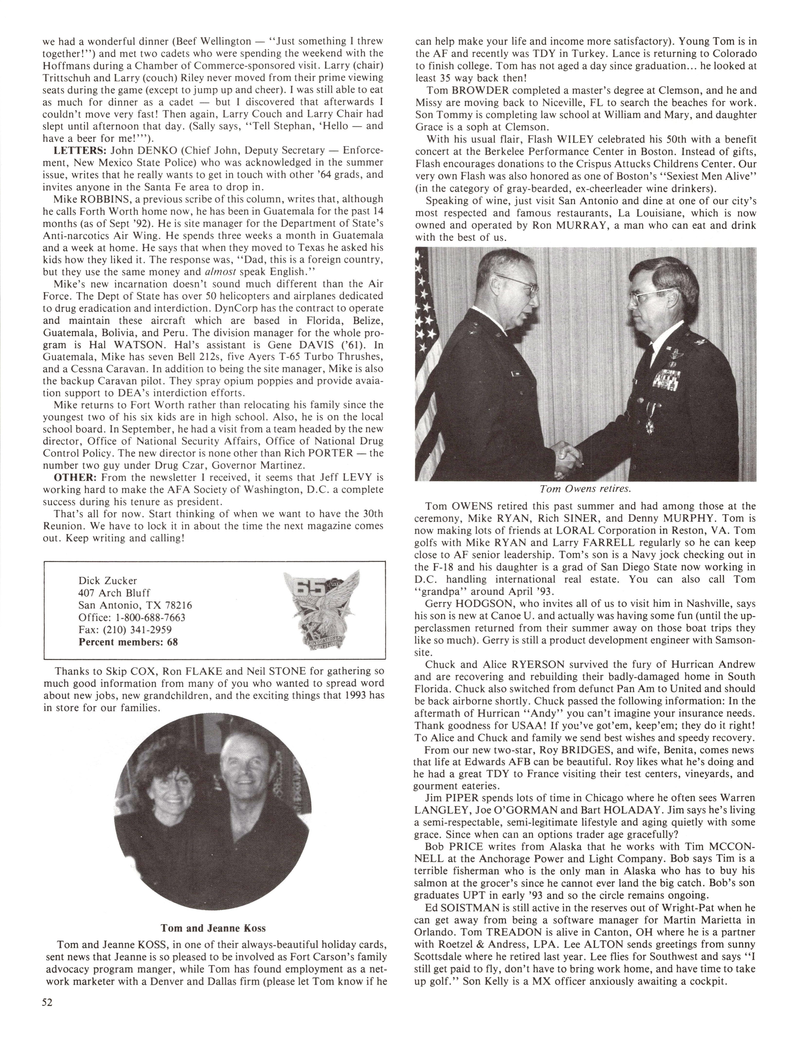 Todd says Tim WILLIAMS is OK! After Hurrican Andrew, he went to Ft. Lauderdale, where he awaited further assignment to either Moody or Shaw. Tim “TJ” HOGAN and wife, Linda, are currently in Tucson, AZ where Tim flies A-lOs. They recently became proud parents of Brock Anthony. Back in May, Eric and Audrey PIEPMEIER also became parents of a baby girl. Eric works at Offutt with Space Systems. Former “Wing Commander” candidate Hal CRANMER married sweetheart Andrea on 2 Oct. Hal flies C-21s in Japan and is having a blast scuba diving, sailing, etc.