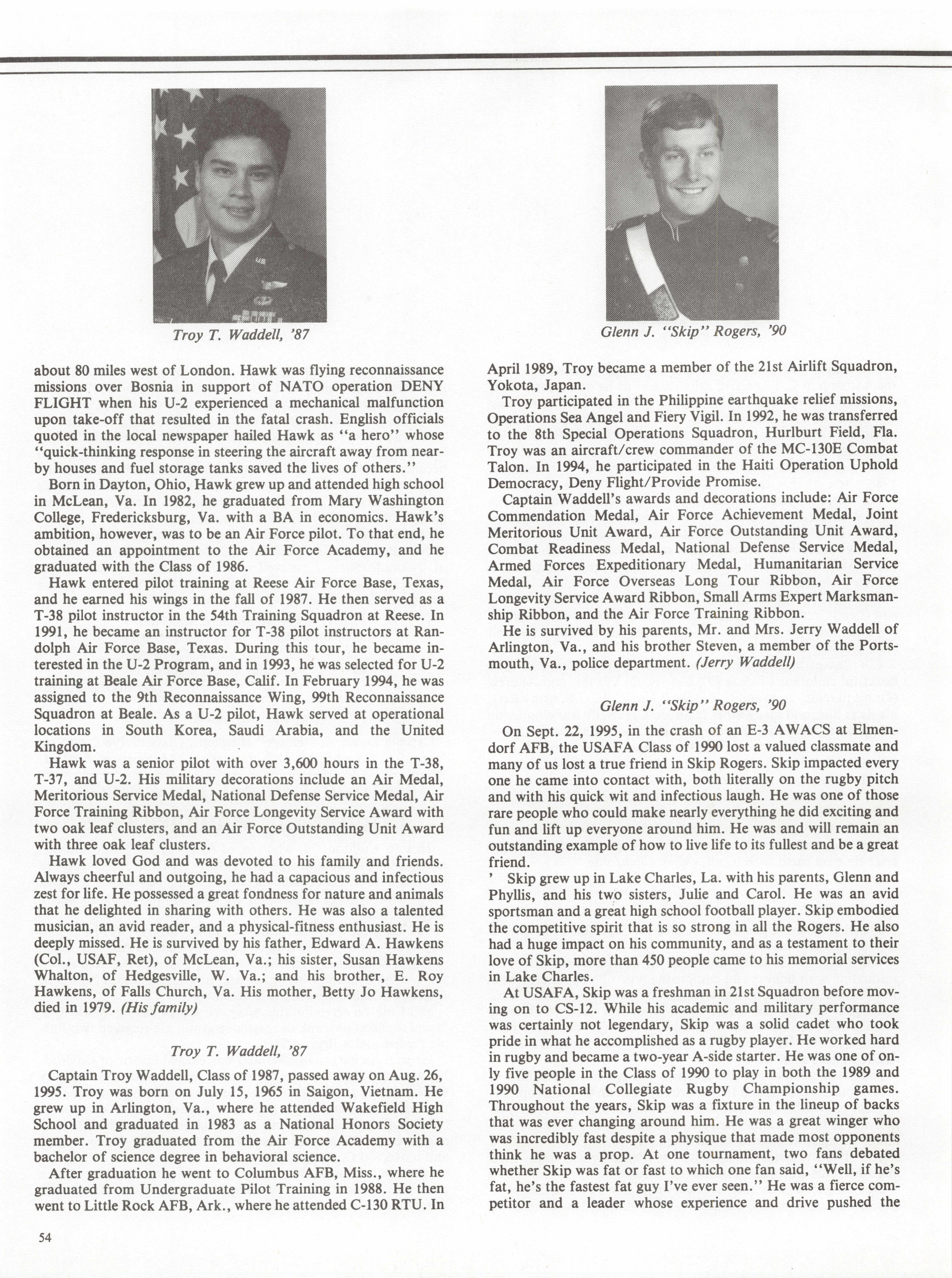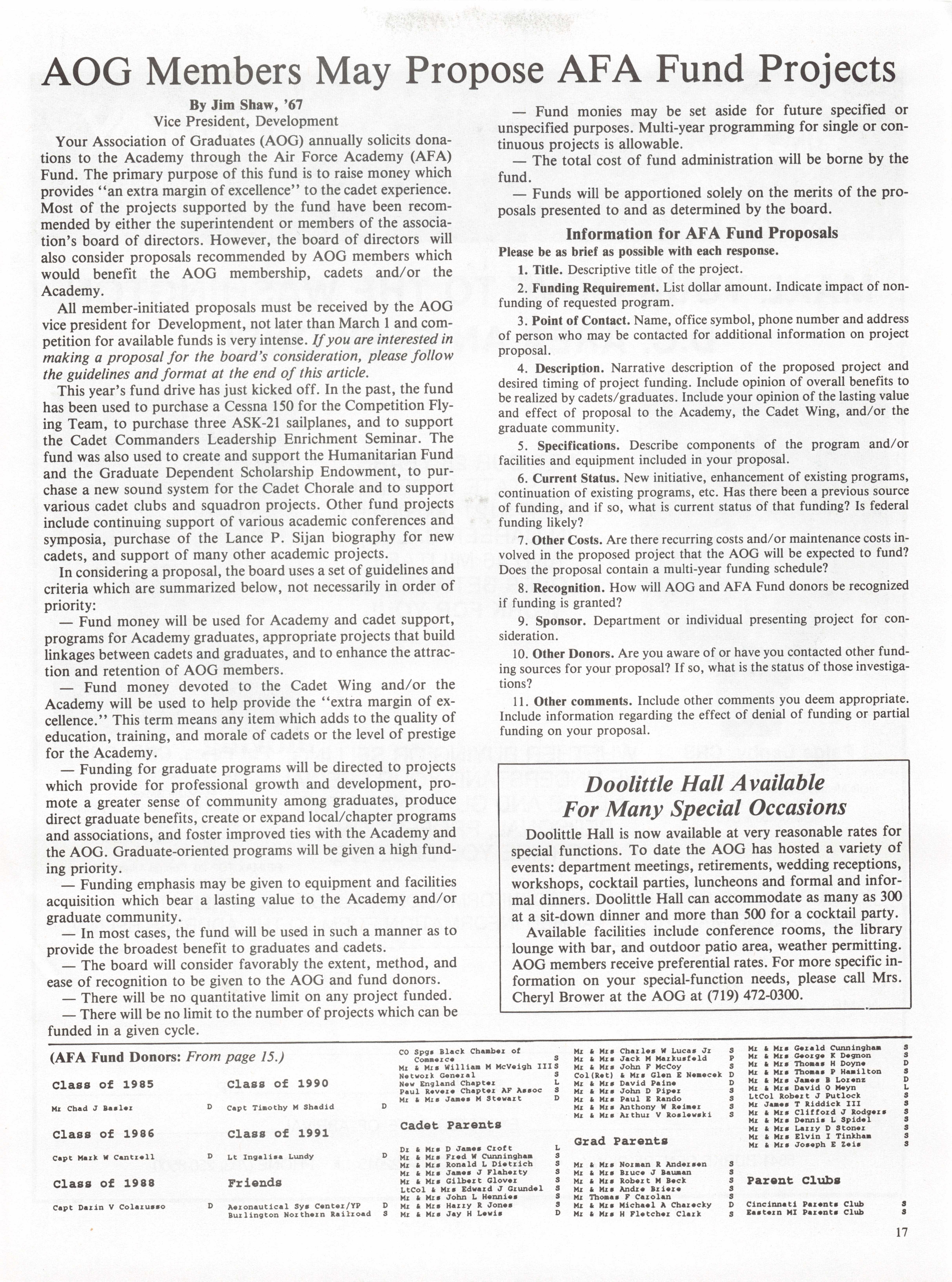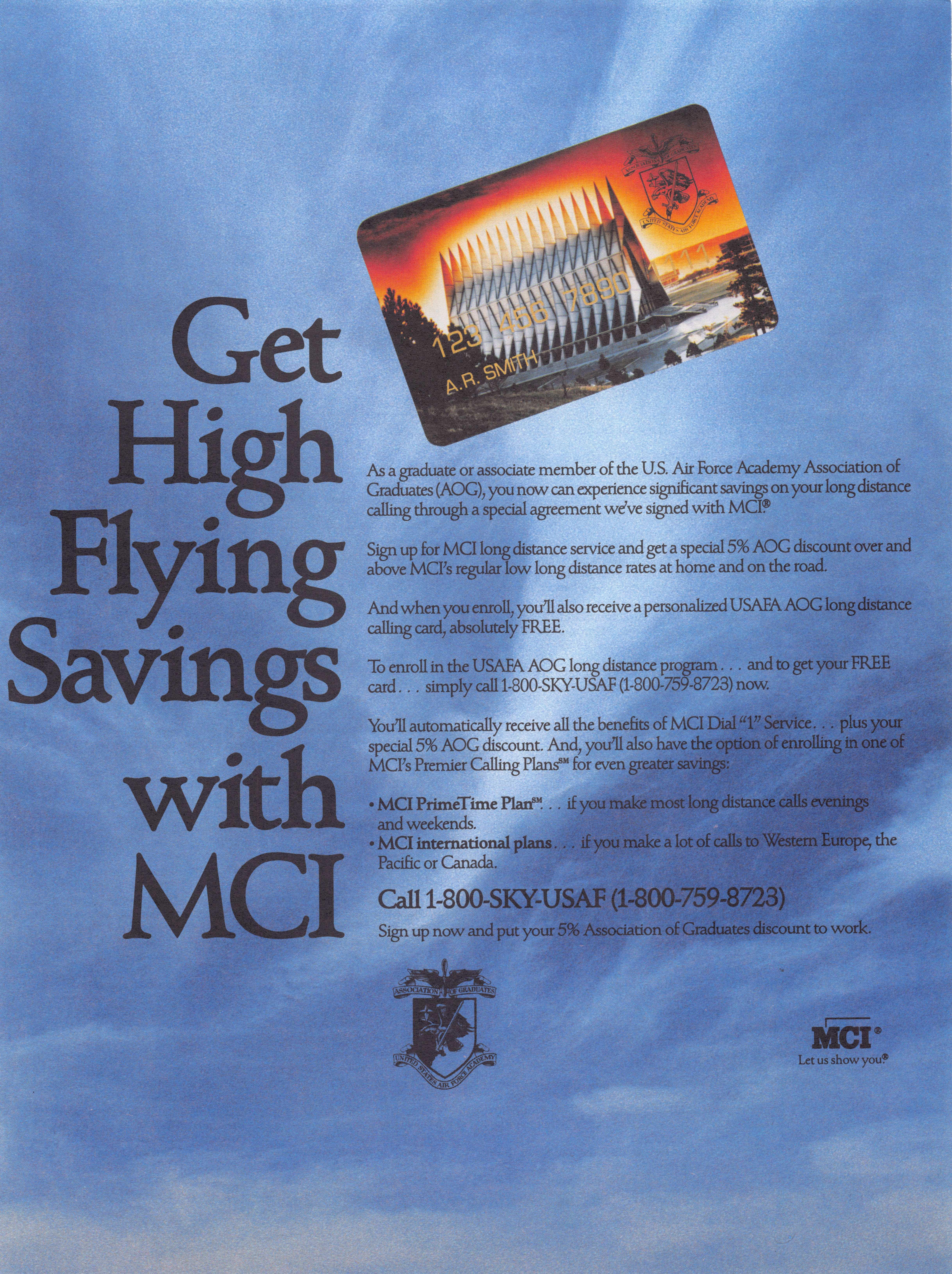Membership Privileges Equal BENEFITS! Now, take advantage of this Great Bene fi t! Air Academy National Bank’s (up to $100,000) Havel Insurance at NO additional cost, plus a$1,000 Hospital Indemnity Pkin. MasterCard issued exclusively for Members of the Emergency Cash—24 hours aday, 7days aweek, at any PLUS System® ATM. Association of Graduates. (There are thousands of locations worldwide). SPECIAL FEATURES: No Annual Fee Low Variable Annual Percentage Rate Pre-Approved $5,000 Credit Line. (Approval subject to credit history verification). A25-Day Grace Period on Purchases. Additional Card at NO extra cost. Discount at Car Rentals. (Hertz and National Car Rental). Call or write today for your Association of Graduates MasterCard application... You’ll be glad you did! 1-800-365-5890 Air Academy National Bank— The "Home Bank" of the Air Force. MasterCard Department*Air Academy National Bank Post Office Box 10 ● USAFA, Colorado 80840 Telephone: (719) 598-2933 Association of Graduates United States Air Force Academy USAF Academy, CO 80840 3 Note: Continuing AOG membership is aprerequisite for card issue and renewal.