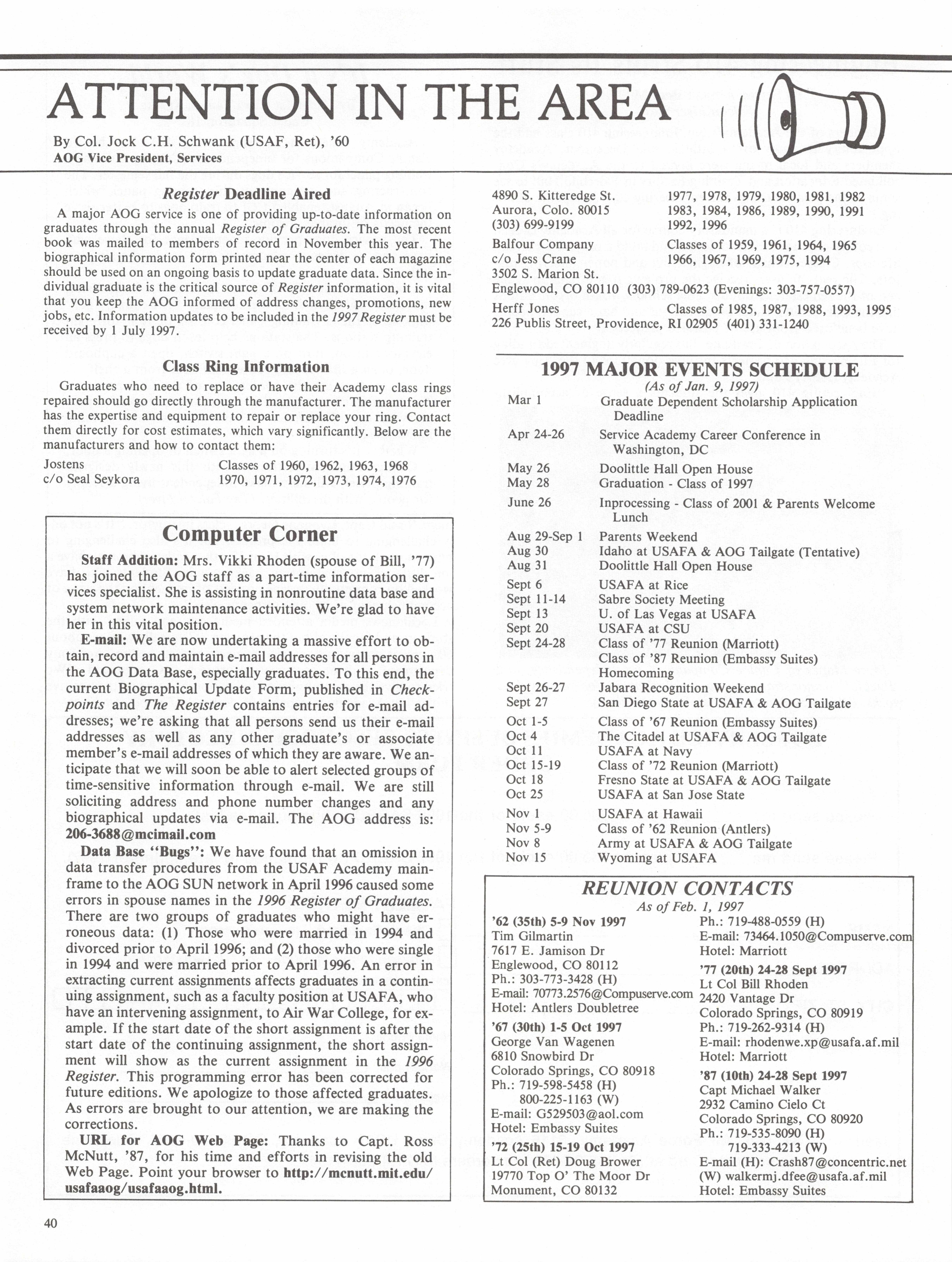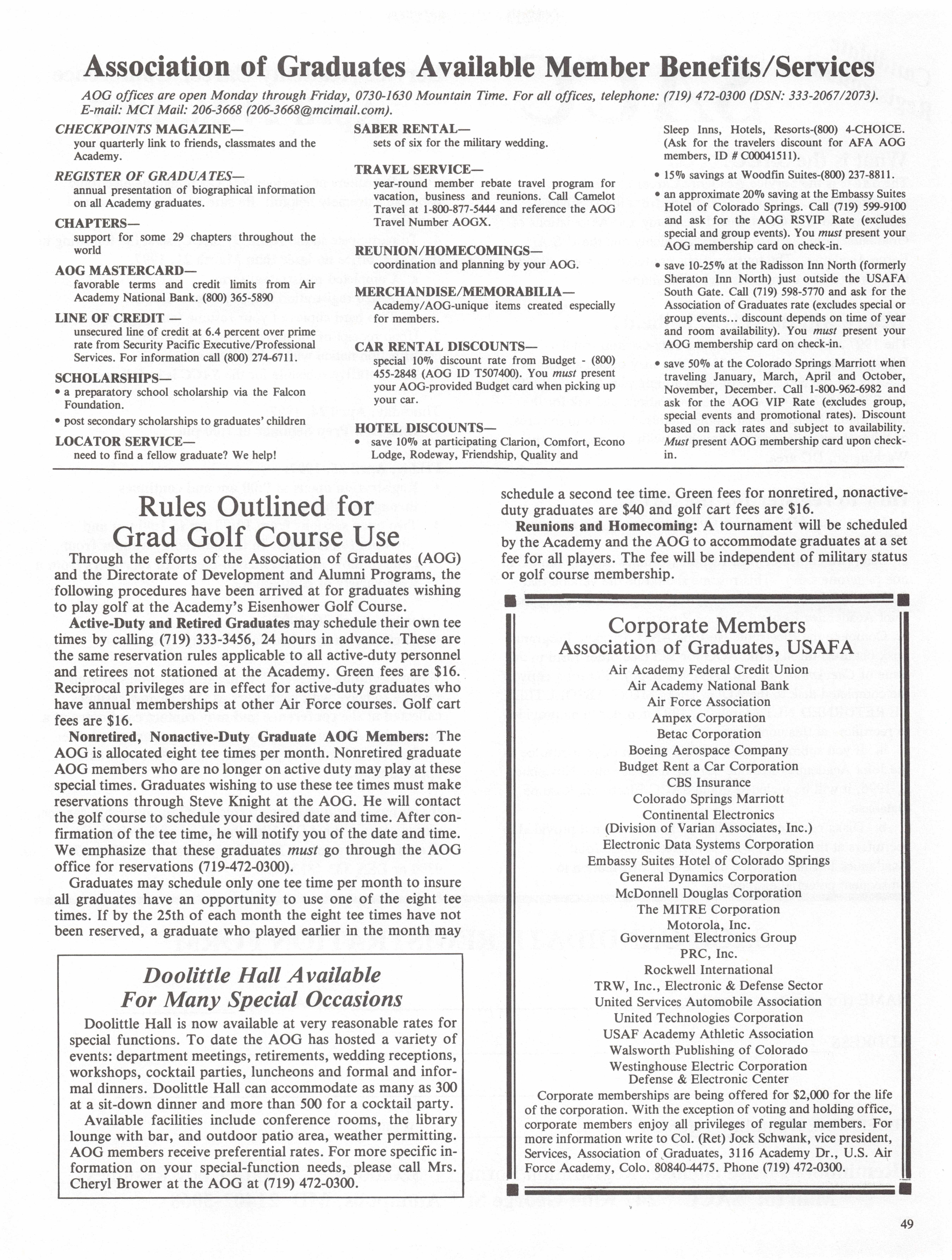 CHECKPOINTS (ISSN 0274-7391) (USPS 898-080) is published quarterly in February, May, August and November by the Association of Graduates, U.S. Air Force Academy. (Phone 719-472-0300, DSN: 333-2067. FAX: 719-333-4194.) It is provided as part of amembership package of which the magazine subscription annually accounts for $10. Single copies of CHECK¬ POINTS for members $2.50. Periodicals postage paid at the U.S. Air Force Academy, Colo. POSTMASTER: Send Form 3579 to CHECKPOINTS, Association of Graduates, Doolittle Hall, 3116 Academy Drive, USAF Academy, Colo. 80840-4475