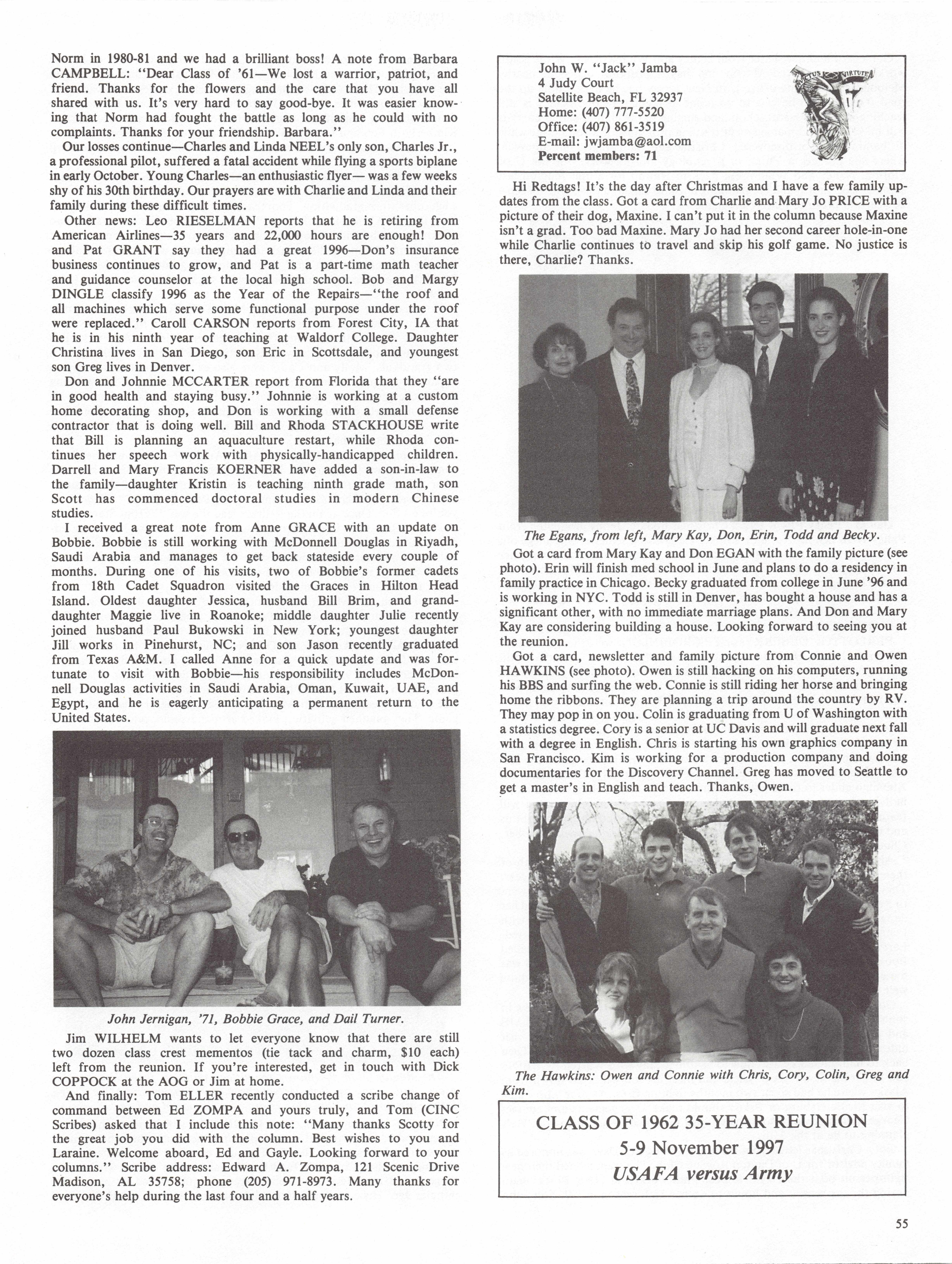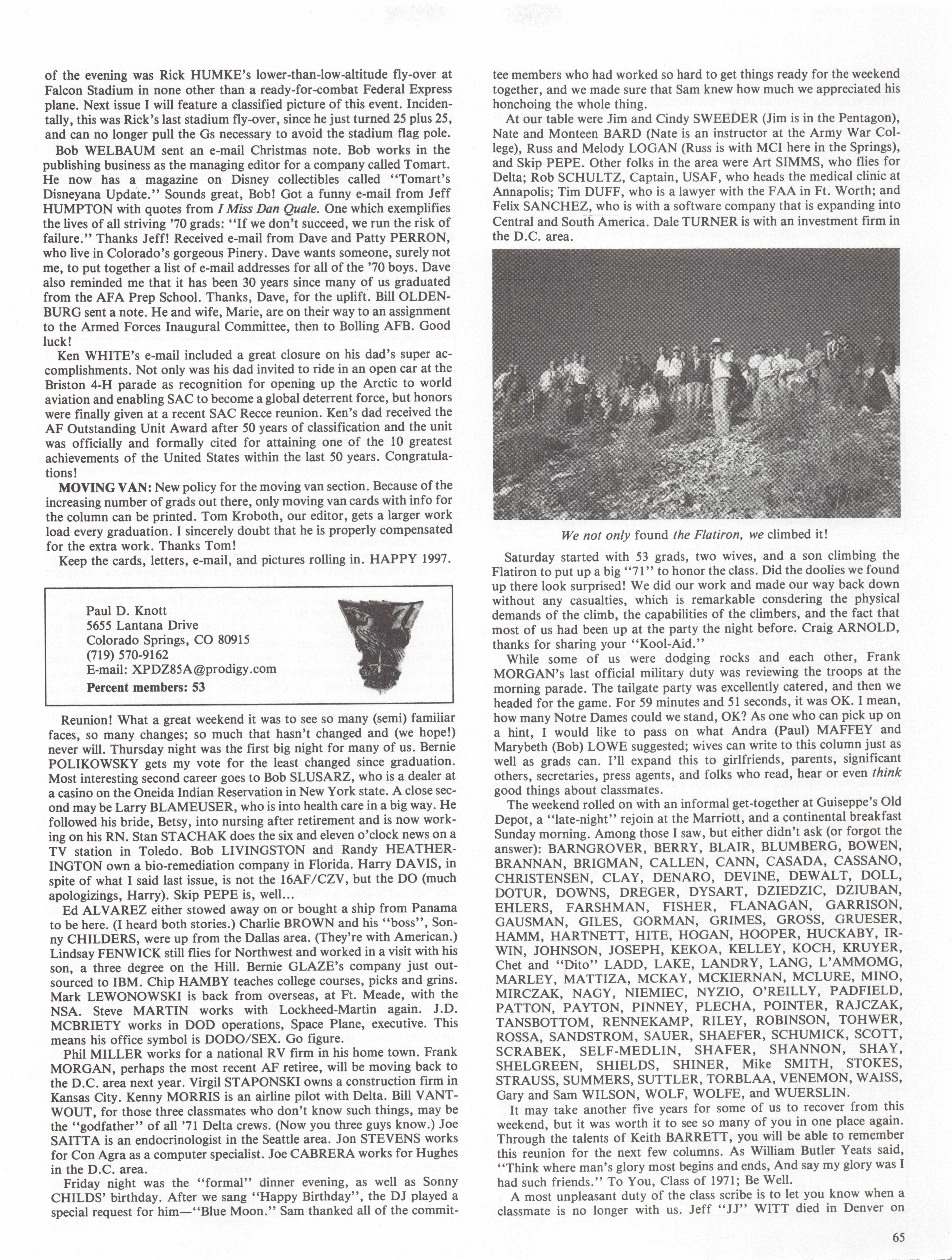 That’s pretty much it for the letters this time...Things here in sunny California couldn’t be better—or busier! Iwent to Louisiana in November to commission Gerry STEWART (Tinker, EE) and then went to Randolph TDY for two weeks. While at the bowling alley there, Iran into Gill NESS and also saw Keri SCHREIBER on the cover of the base newspaper performing as military ambassador. Ireturned in time for Thanksgiving and was thrilled to have Rick SHEFFE (Edwards) join our crowd for dinner. Unfortunately, the weekend celebration was cut short by atragic active-duty death here on base.