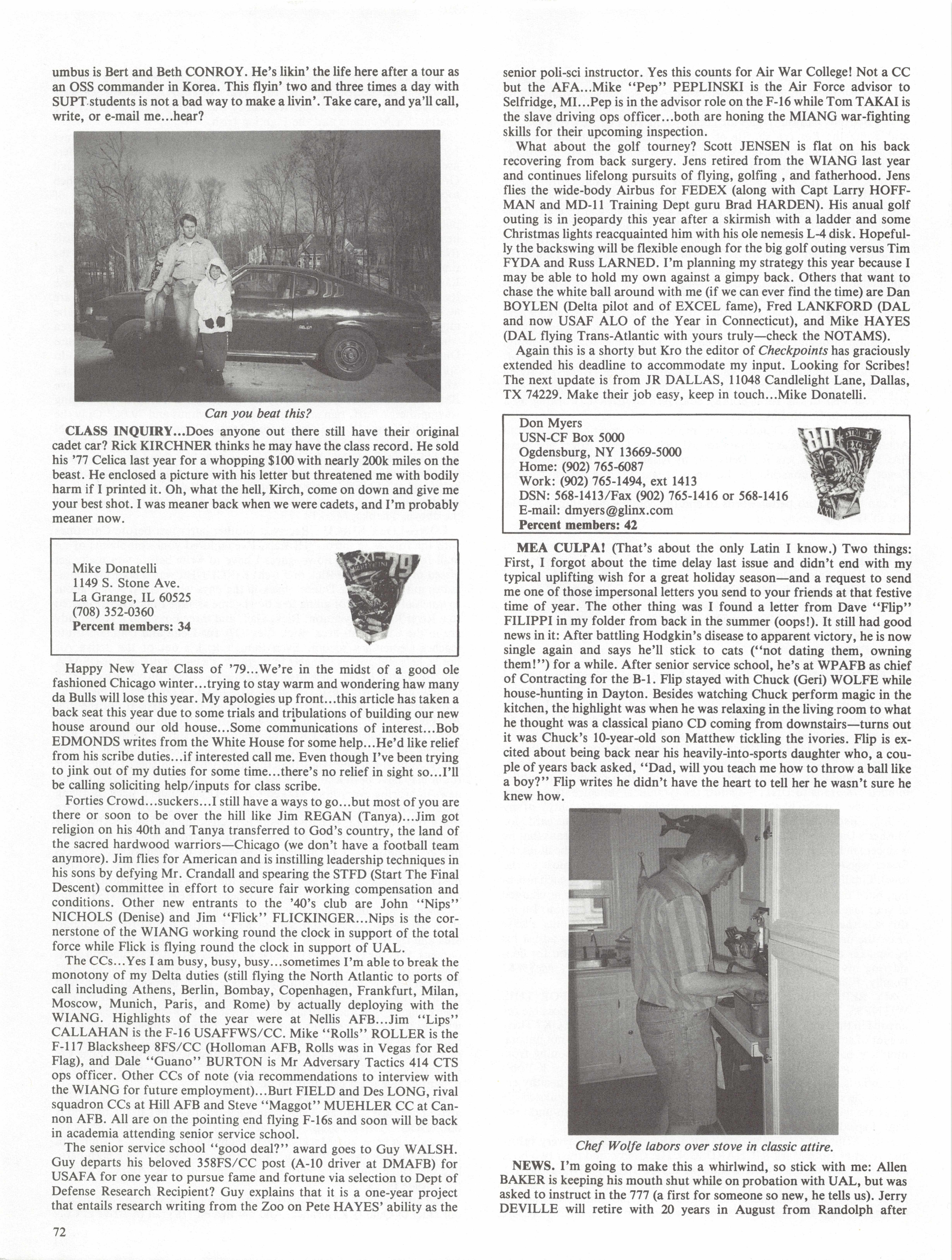 Here Iam in California. (That was fast!) 1got aphone call from Craig WENZ just before leaving D.C. He is at McGuire AFB, flying C-141s, and living near Philadelphia. Iseized the opportunity to pick his brain for some Checkpoints fill. He and Tom RICE (McGuire, intel officer) were getting ready to head out on the town. Here is his quick run-down: Clarence JOHNSON flying T-38s at Columbus (UPT); Brad ROLLER, E-3s at Tinker; Jeff MARKS, Jason WOLF, Brandon LOKEN, and Mike KOONS are all flying ’141s at McGuire. Mike and his wife just had a baby boy. Melissa (JONES) and Andy ROSS are still doing well at McGuire flying ’141s. Vinny TARANTINO is at Lakenheath working in¬ tel; Brian CARBAUGH (Marine Corps) recently got married and is sta¬ tioned in North Carolina; Thad KENNINGER is at Yokota and PCSing to Okinawa to fly his UH-60—Thad and his wife just had ababy boy. John LETSINGER is flying KC-135S at Warner Robins. And Jake “The Snake’ BUSS is flying ’135s at MacDill.