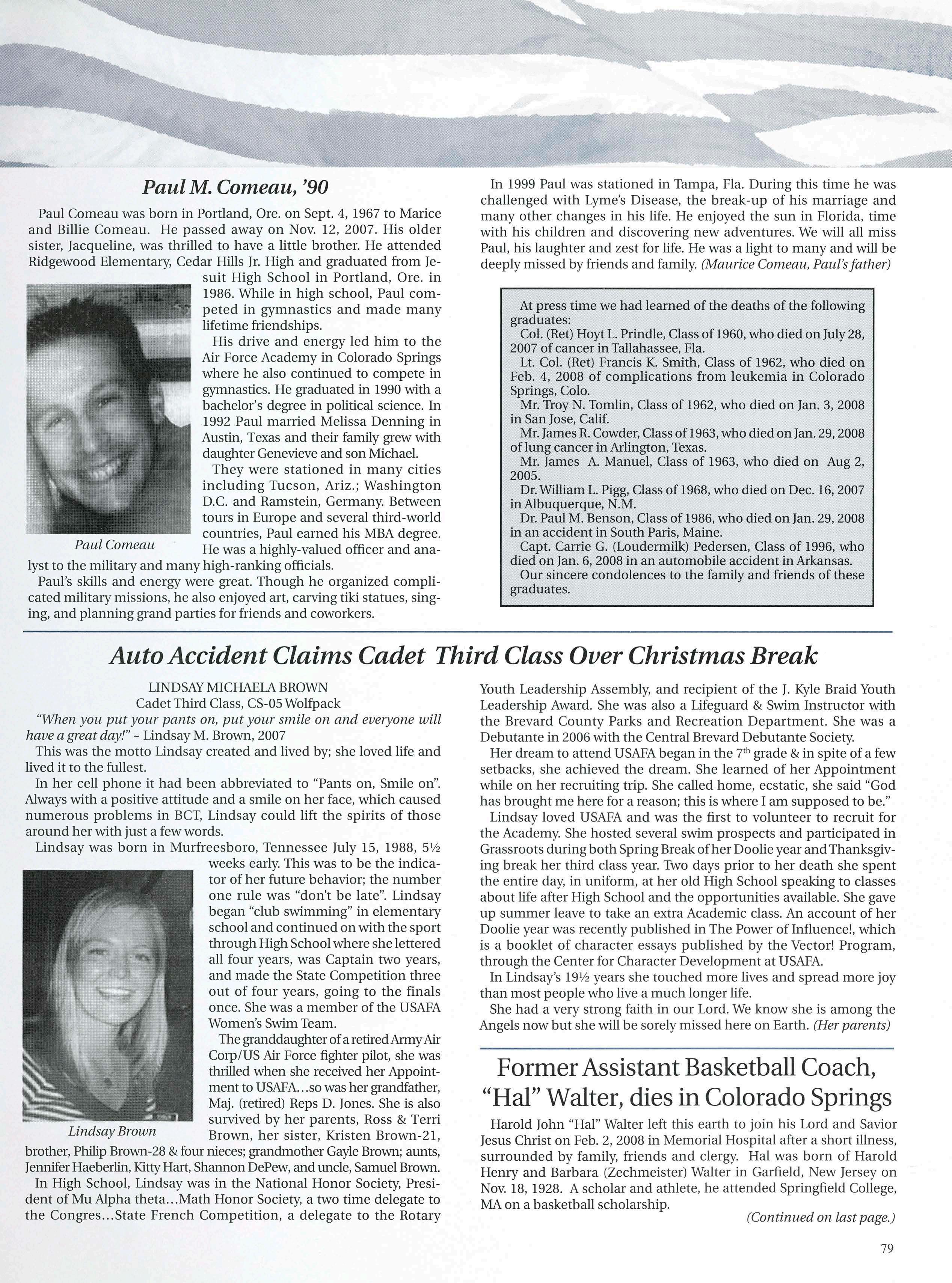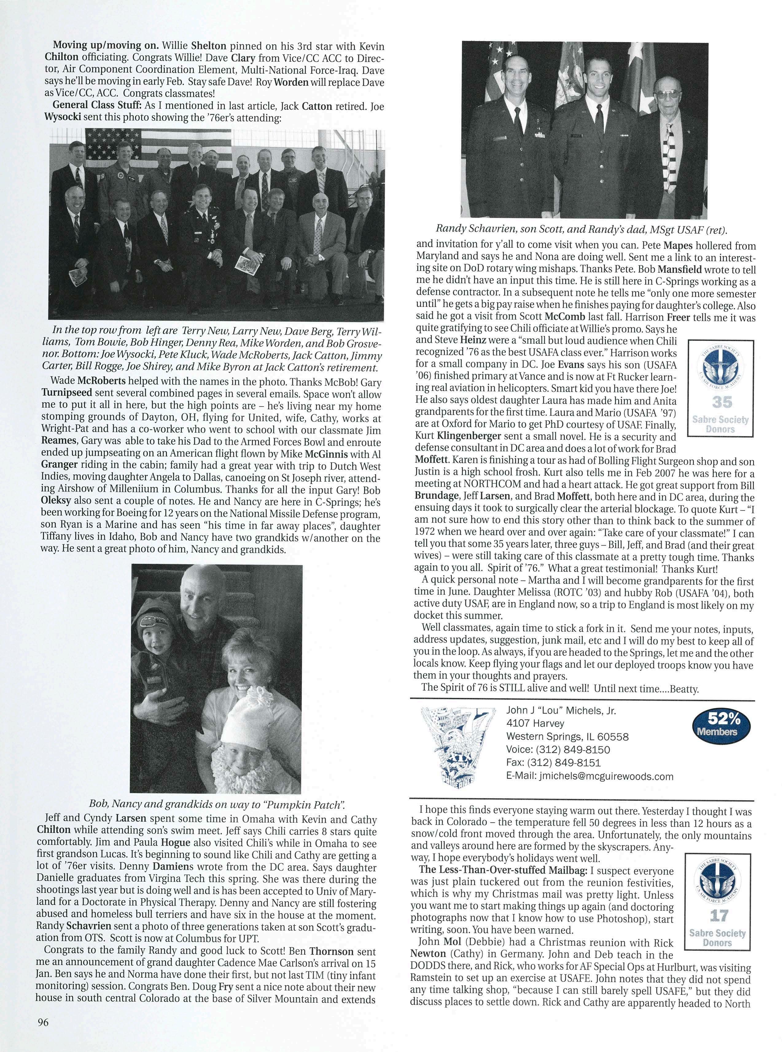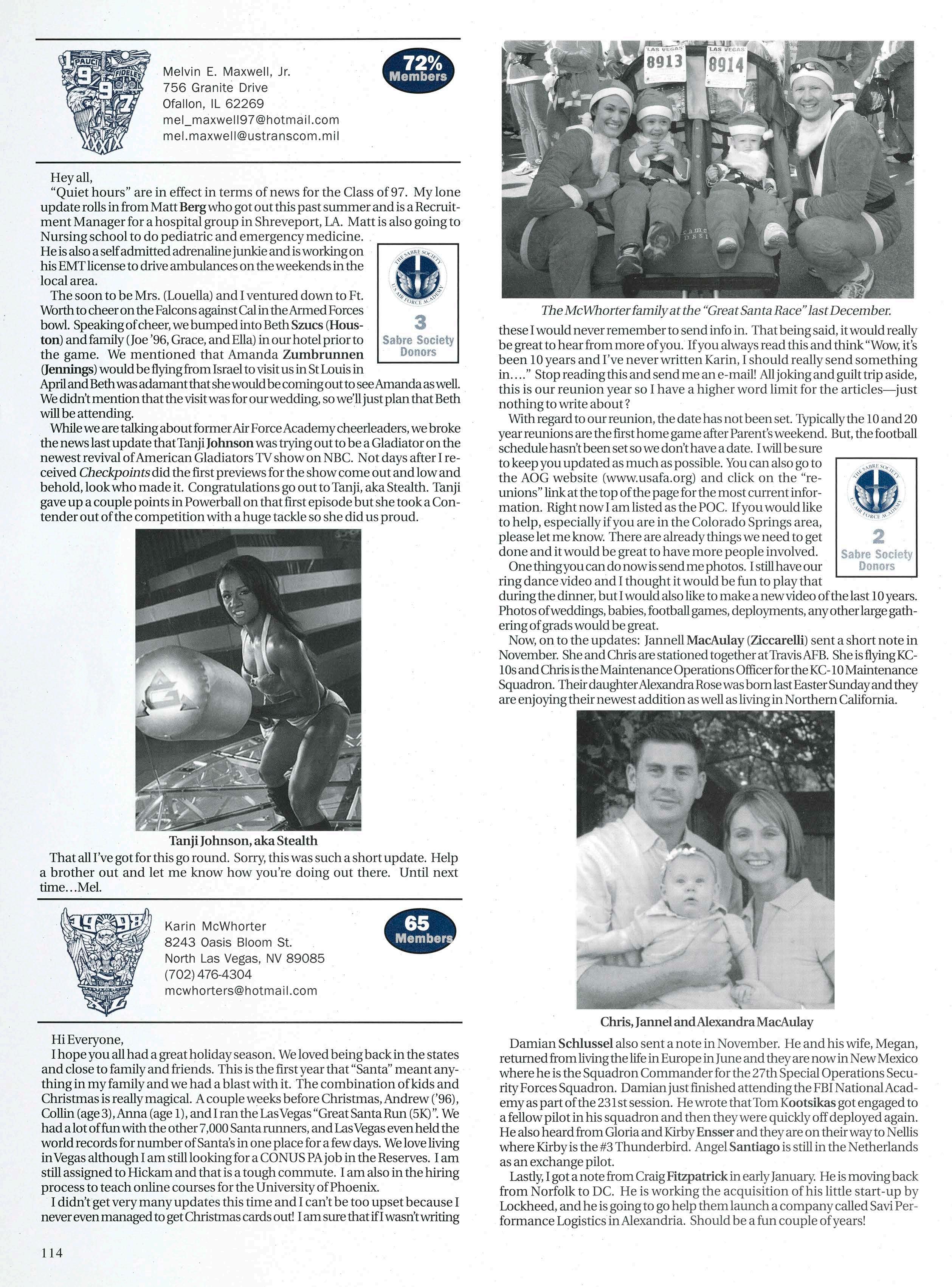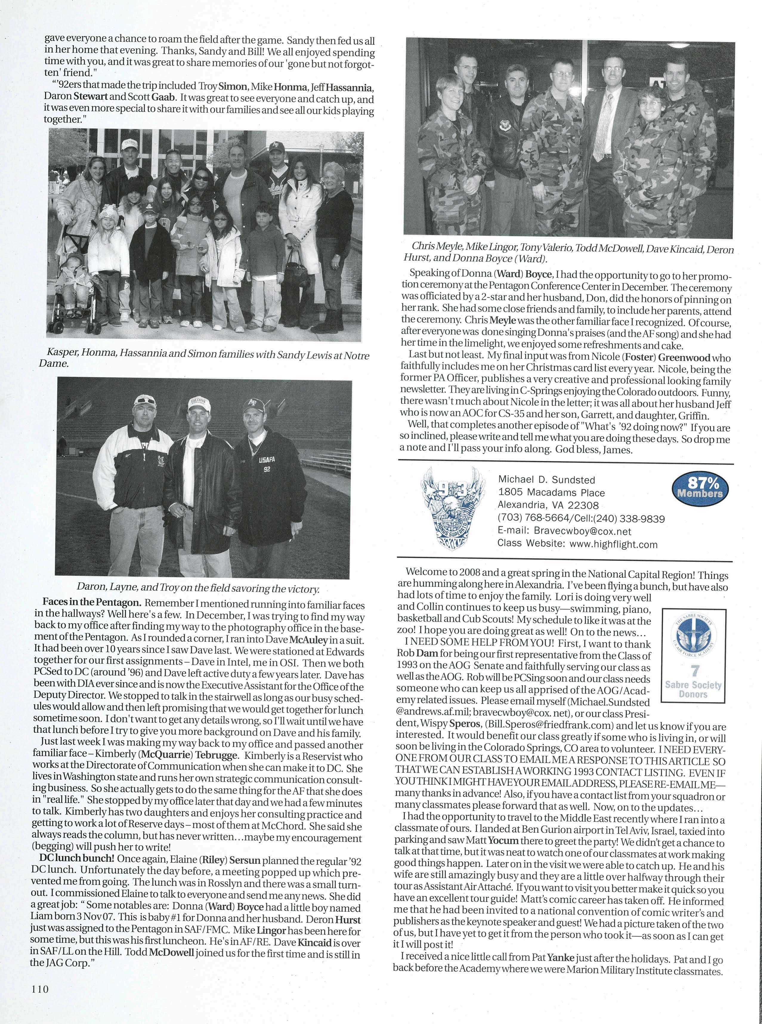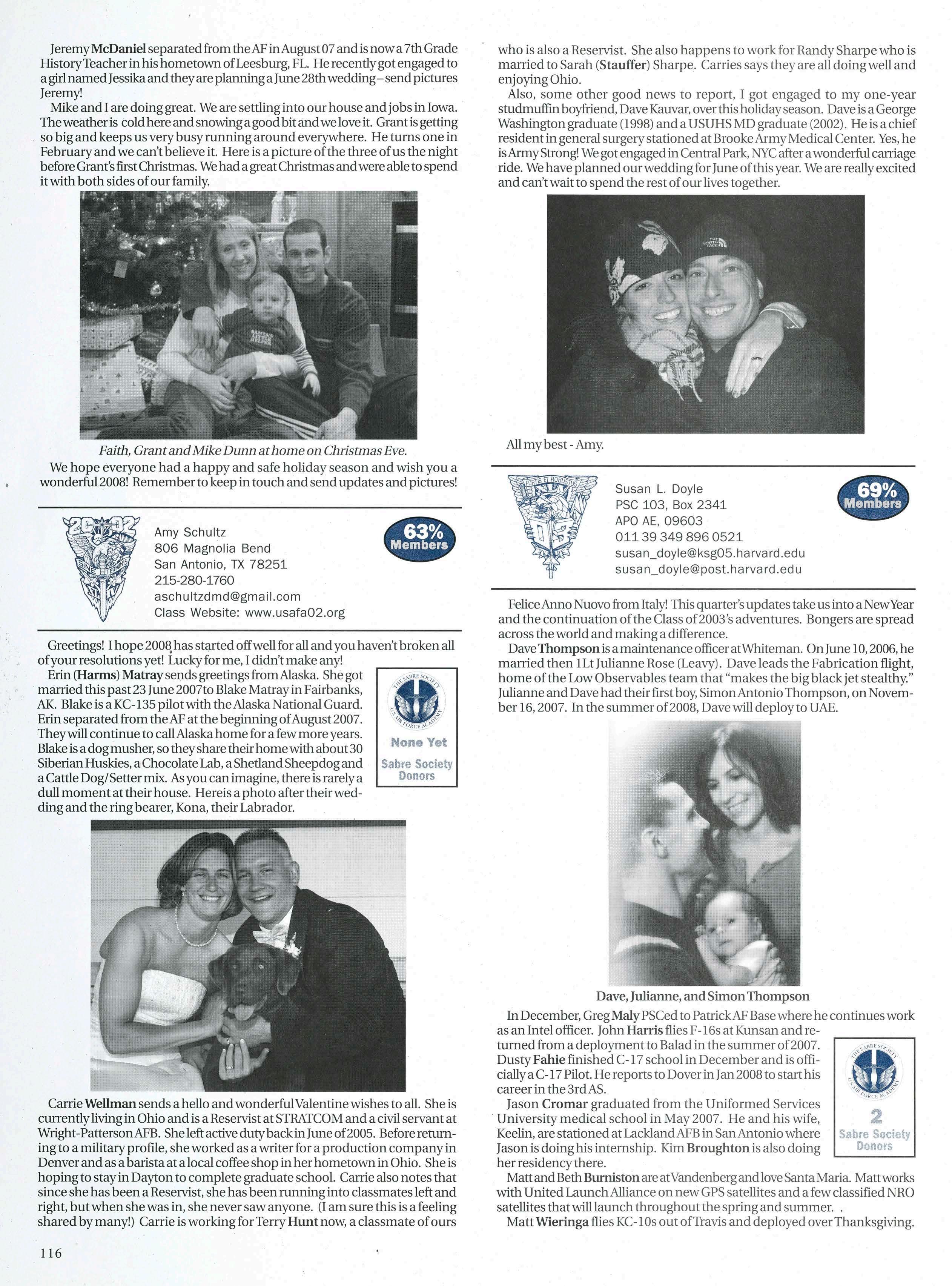 A special thankyou to MarkHickie for submittingupdates for the CS-24 Phantoms: Mike Opresko is the proud parent ofa new baby, Nic Graves finished CRO school and is at DM, and Jon King still flies C- 17s at McChord. MohammedA1Alawi is flying in Oman and enjoyinglifewith hiswife, Dalai, andtheir 19-month-old daughter Shamma. Thomas Bellairsworks acquisi- tions at L.A. AFB on the next generation ofGPS and is pursuinghis master’s at USC. David Bennett is atAviano, did the Paris air show, and has traveled Europe extensively. Laurel Chiaramonte (Huber) is at Nellis on the med/surg ward. HerdaughterArianaLynwas bornonNovember21st. Thewholefamily heads to Kadenain February. Ricardo Cornejo is anAircraft Commanderwith 1000 hours in the C-17. He’sAirdrop Qualified and in the Special Ops Low Level Squadron at Charleston. Stephen Edstrom graduated med school in Mayand startedresidencyinFamilyMedicine/FlightMedicine.Afterhisthreeyear residency, hewill complete the aerospace primer course and go straight towork as a flightdoc. KevinHainesis inTokyo untilDecember2008, andflies the C-12J after the retirement ofthe C-21 Learjet from the PACAF fleet. Elia Hickie (Burrill) started 2007 learning C-17 operations atAltus, OK before movingto South Carolina in February to join the 16thAS. She deployed to A1 Udeid for four months and then finallytookher honeymoon with Mark - a cruise to the Caribbean! MarkHickie finishedup initial F-16training at Luke AFB inMayandbeganflying at Shawin Sumter, SCwiththe 79thFightersquadron in October. John Lancasteris in Special Forces training at Fort Bragg, NC, will finishinAugustandthentake over anA-Team in Fort Campbell, KY. Eric Ledererproposed to his girlfriendMegsbeforehe deployed to Iraq. InAugust, NickWzientekandJefffinished the Leadville 100 trail race in Colorado forthe second straightyear. AndrewNowicki lives in the DC area andleft Deloitte Consultingto pursue an opportunitywithin the DoD. Ian Ostermilleris still at McChordand ran OpsAirForcefortheOpsGroup there.Atripbackto CSprings to him to the Ritz, JackQuinn's, and Garden ofthe Gods. He is applying for FLEP to be a JAG officer. Michelle Ruehl is inAbilene flying the “dangerous andsexyHercules.” Shewillperform in Dr. Jeckyll and Mr. Hyde in the spring. Brian Smolenskyis a full-time actorinLA, despite thewriter’s strike. Hewrote, directed,produced, andstarredinhis firstfeature film - The Gadarene Swine and earned a spot on Prison Break. TylerTracydeployedforfourmonths to fly C-130s inFebruary. InDecember, heaccepted anAFSOC predatorassignment to New Mexico. Holly Van Liere left Tinker for Korea and traveled to JeJu Island, the DMZ,Tokyo, Beijing, andThailand. DerrickWhiteworks in the IZ in Baghdadwith KBR as a Sr. SubcontractsAdministrator. His wife,Adonis, and kids (Wisdom, 4 and Elijah, 1) are doingwell in Hampton,VA.