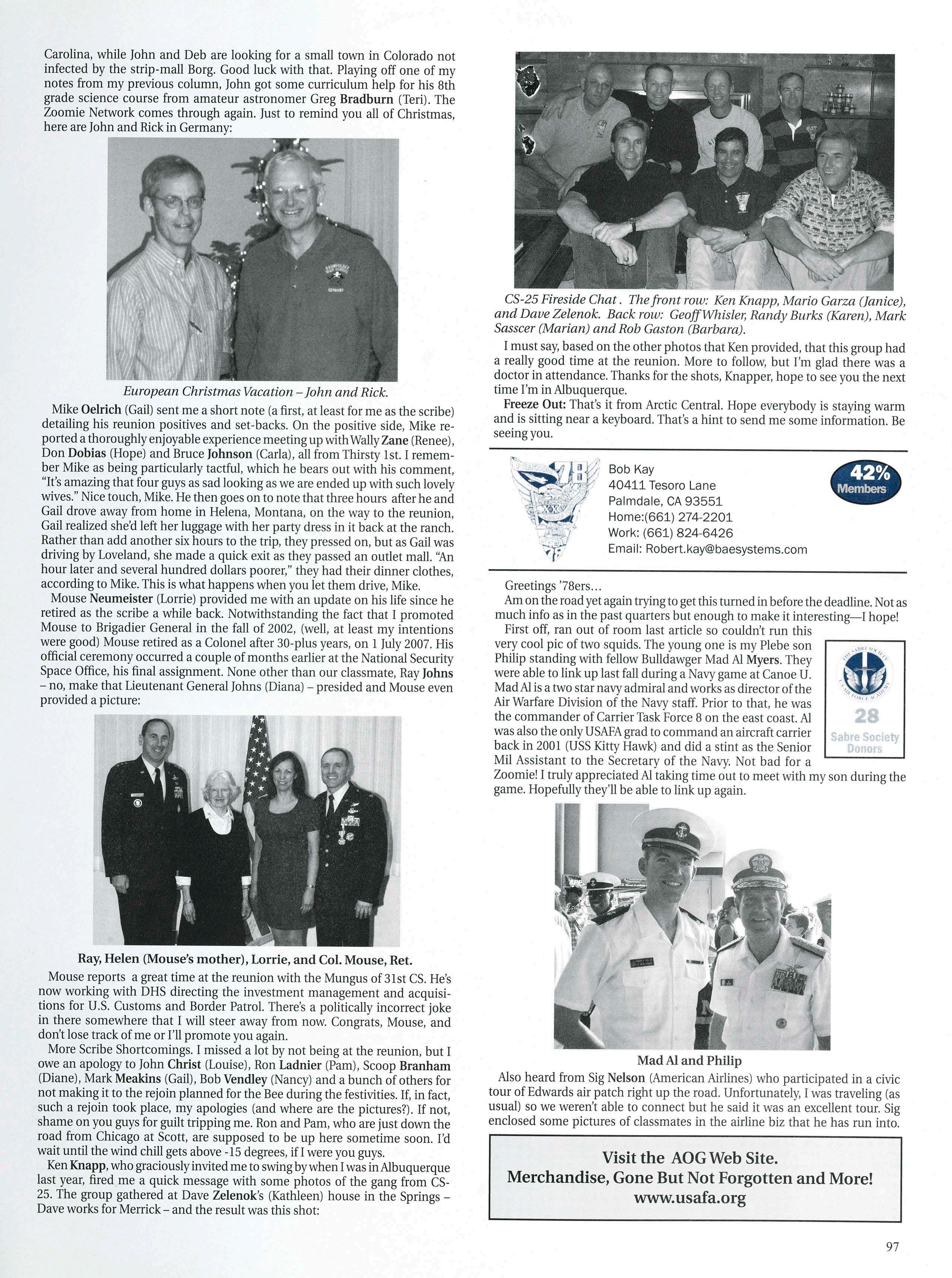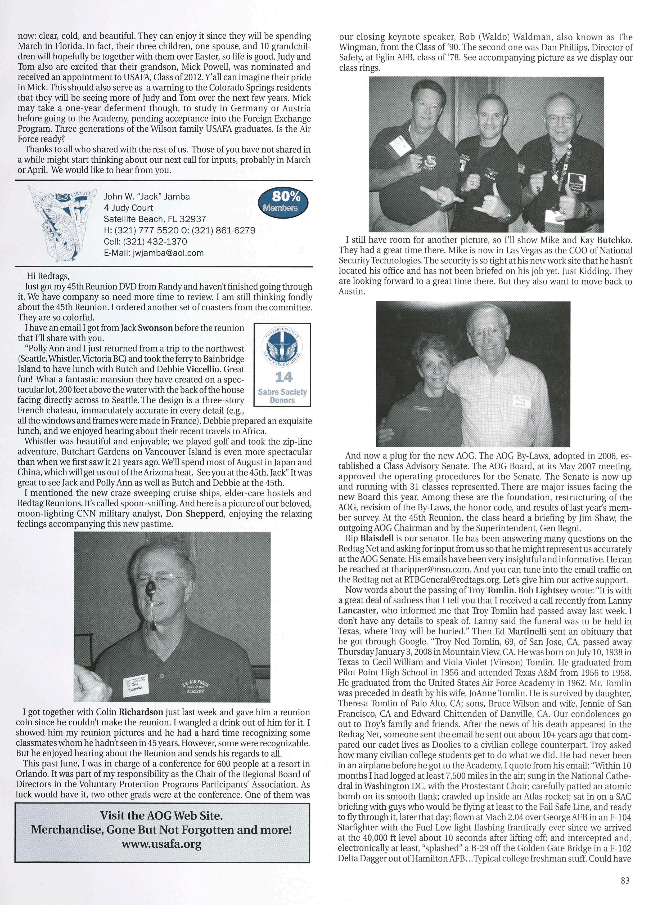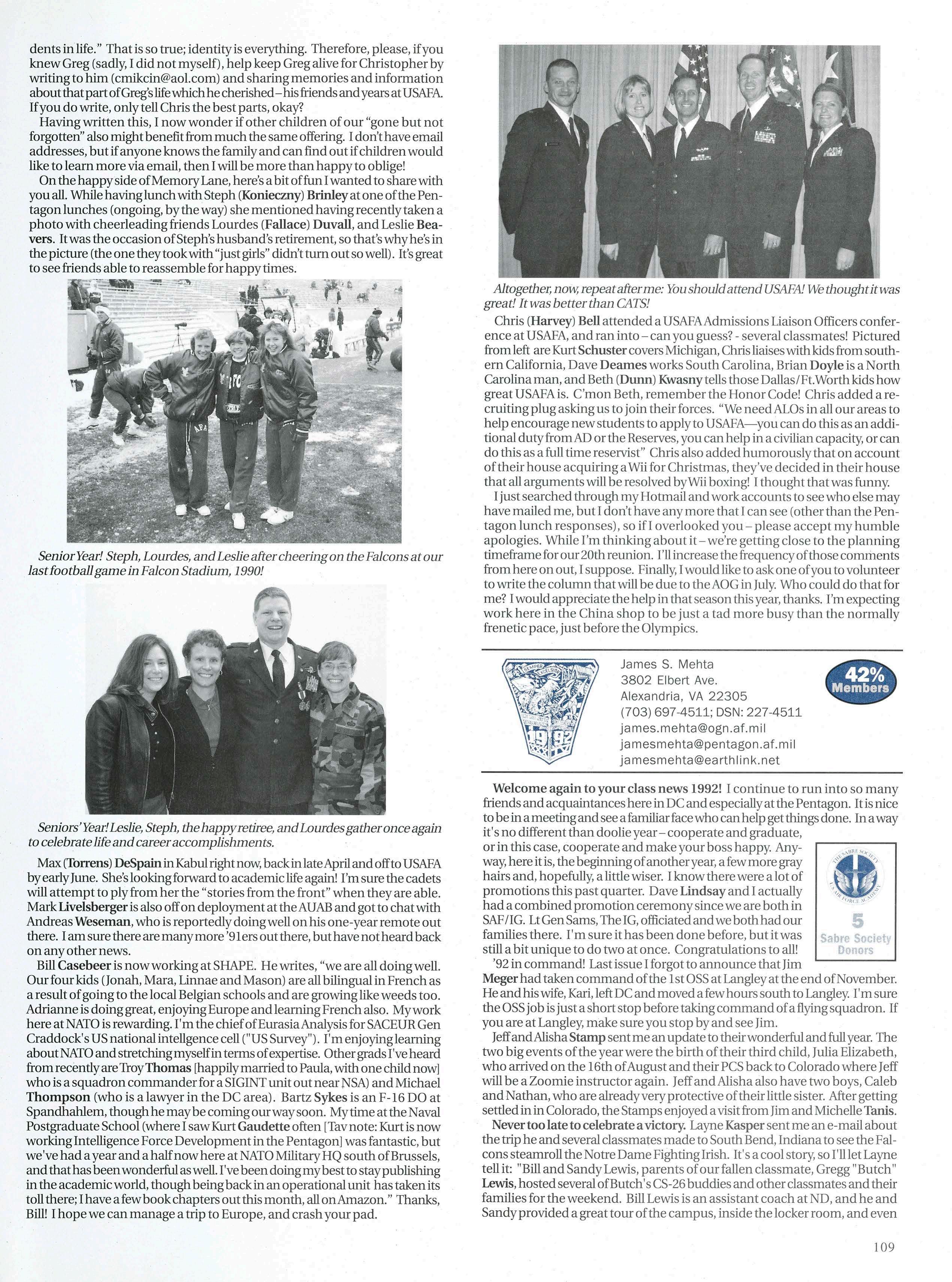 So, ifyou are wondering “what theheck is happening out there at the AOG”, as I was at first, the new gal’s impression is that great things are happening and we need you to help us sustain the renewed energy, clear focus and bridge building. Let’s knock offthe energy it takes to pit groups ofwell-intentioned, hard-workingpeople against each other and use that energy instead to renew, rebuild and move forward there is plenty of room for us all to serve. After all, we all share a unique and common experience with only 38,000 people in the entire world. We share our United States Air Force Academy experience that made us all officers and leaders ofgreat character. This world needs every graduate, officer and leader ofgreat character we can help foster and produce. S