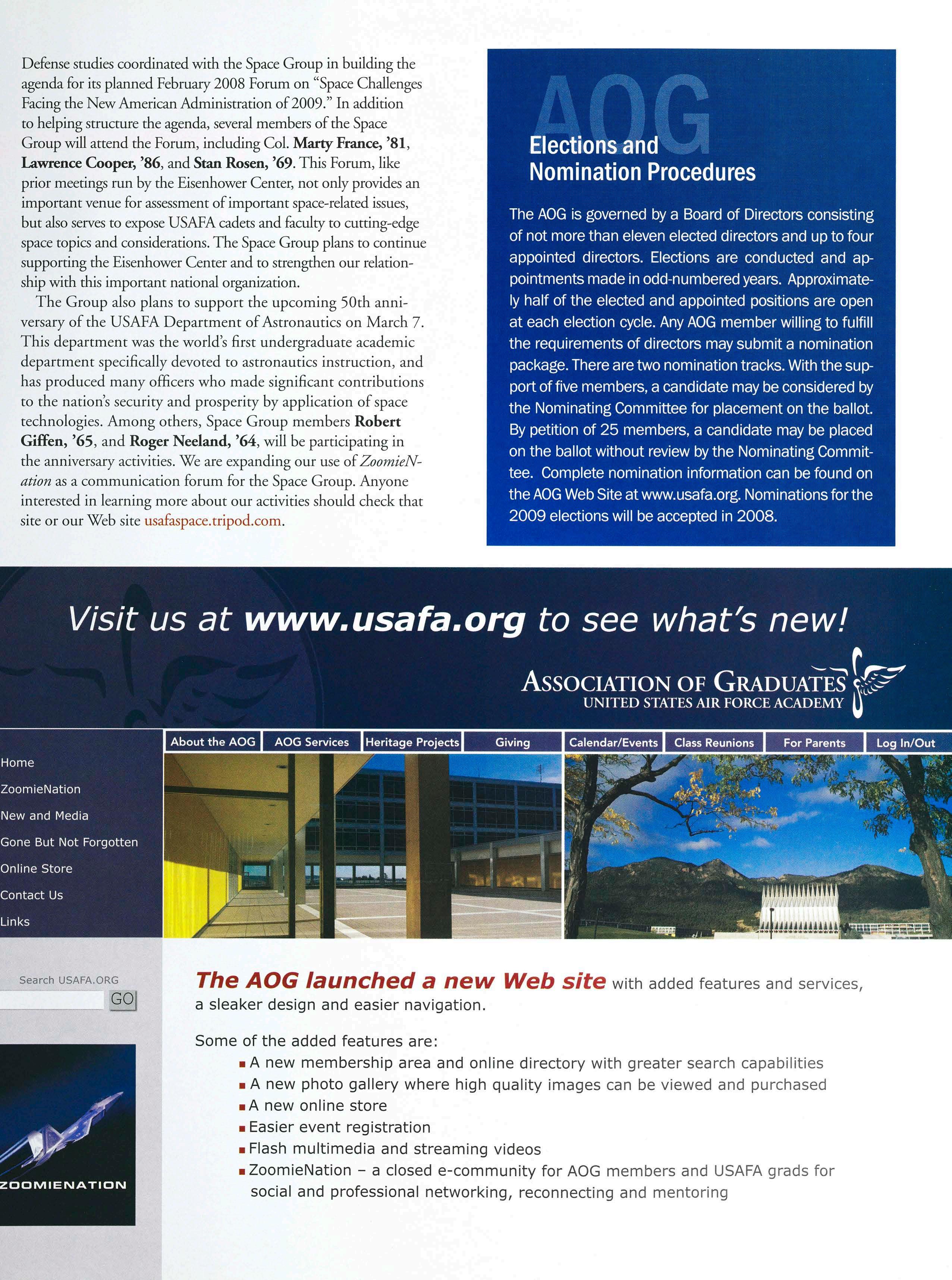A core purpose ofthe AOG as confirmed very recently by the Class Advisory Senate report “Moving Forward” (posted on the AOG Web site) - is and will continue to be fundraising for the ongoing support ofthe cadets and USAFA. In fact, the AOG board announced this weekend its support to renew the AOG Development effort with the appointment of new Director Kevin Carmichael, ’77, who comes with an extensive non-profit and development background to be Chair ofthe reestablished AOG Development Committee.