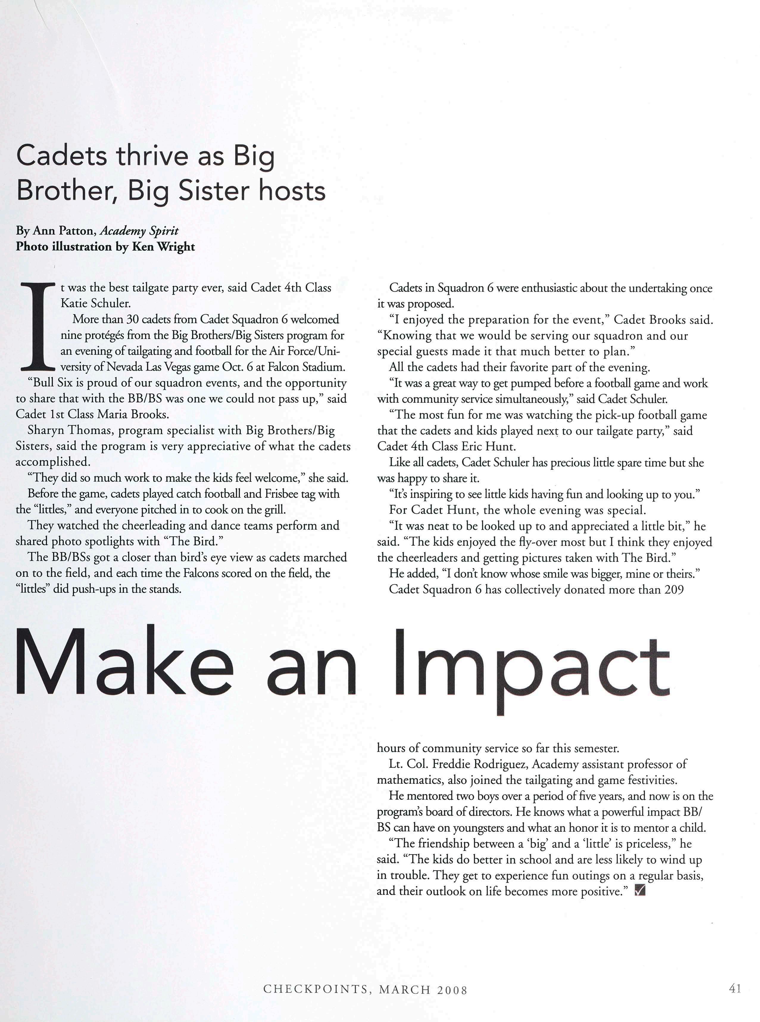 ■ Internal Communications to keep Academy employees (military, civil service and contractor), local retirees and family members up to speed on the goings-on of their Air Force Academy via the Academy Spirit the weekly base newspaper, and our official website (www.usafa. af.mil or www.usafa.edu).