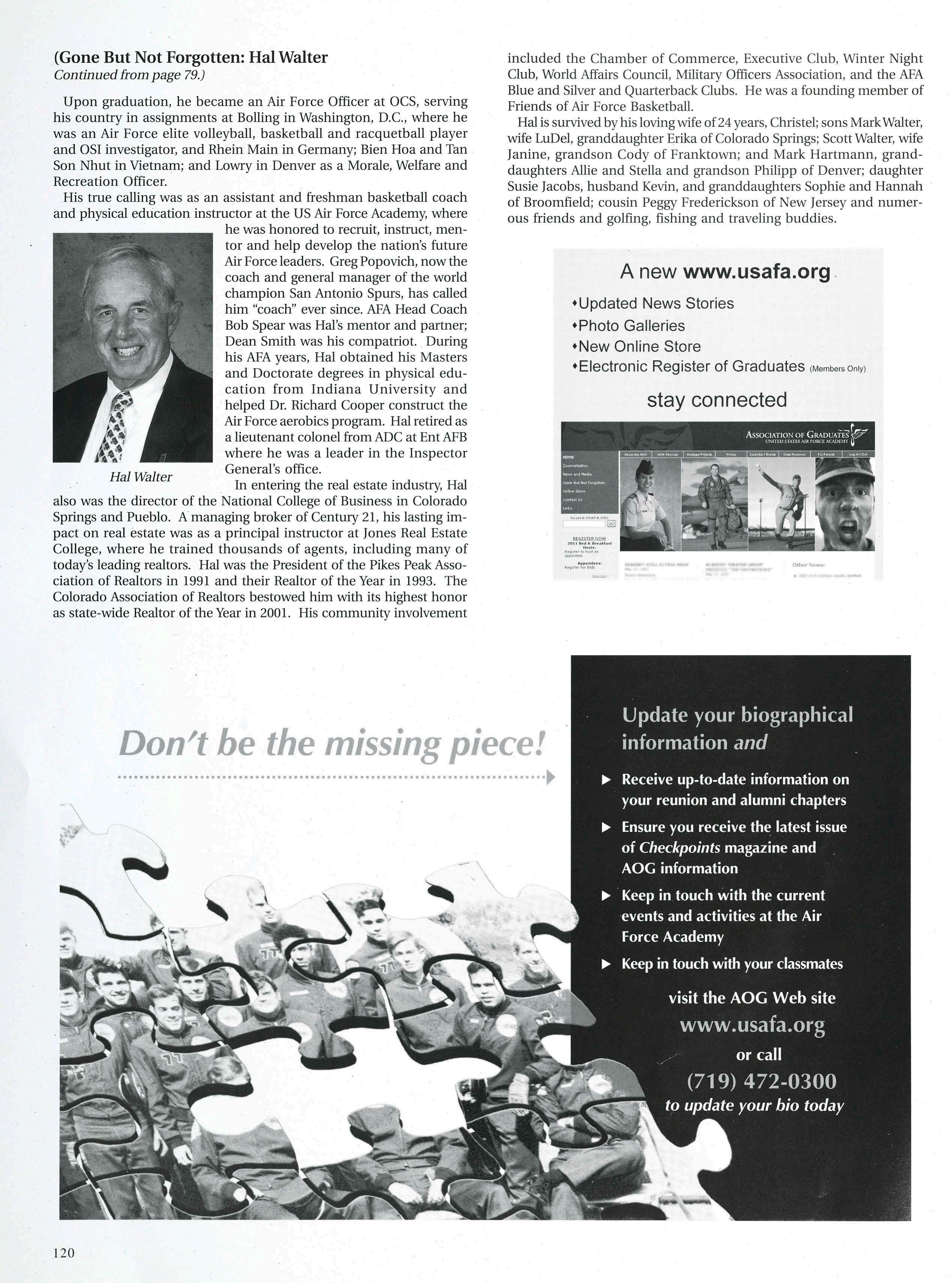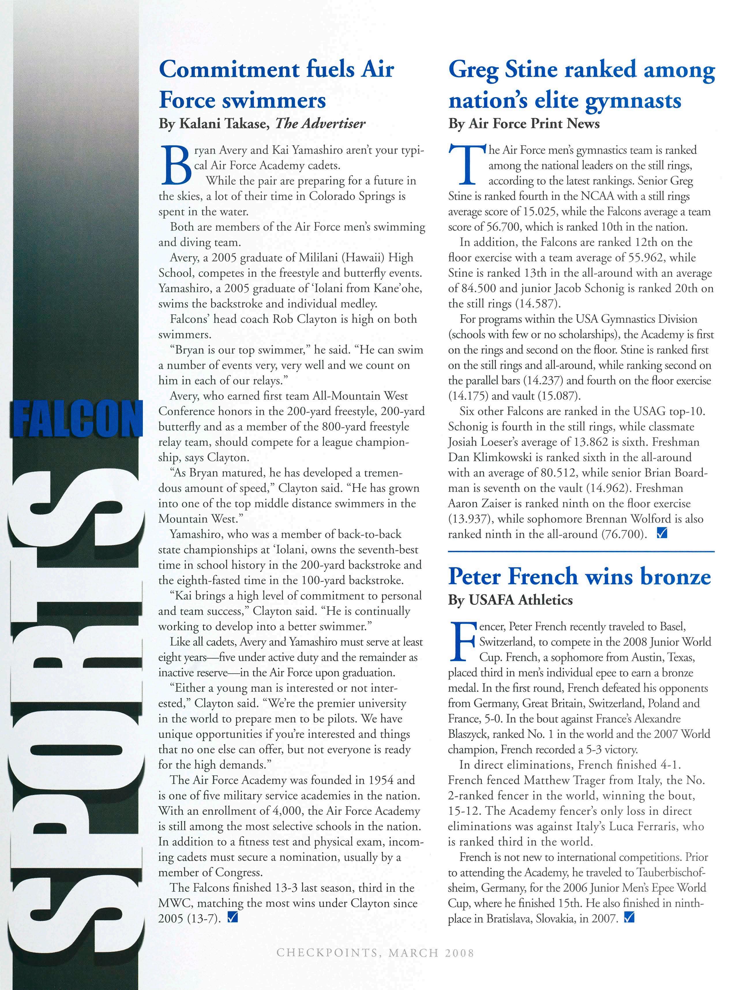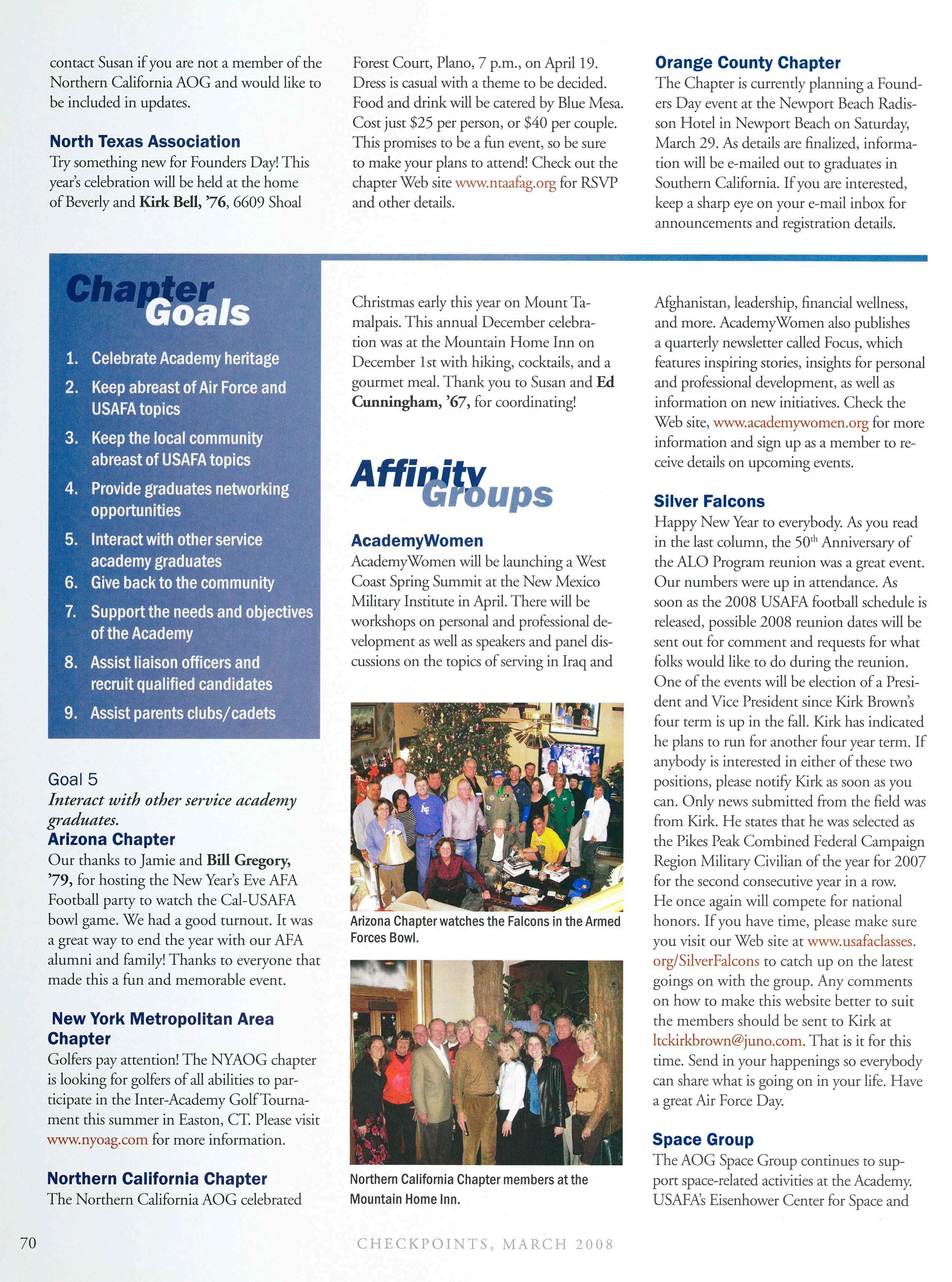 Checkpoints (ISSN 0274-7391) USPS 898-080 is published quarterly in March, June, September and December by the Association of Graduates, U.S. Air Force Academy (Phone: 719-472-0300, DSN: 3332067. FAX: 719-333-4194, E-mail: editor@aogusafa. org.) A portion ofyour dues pays for your magazine subscription. Additional copies may be purchased for $2.50 each, plus $4.60 for shipping. Periodicals postage paid at the U.S. Air Force Academy, Colo., andadditional mailingoffices. POSTMASTER: Send changeofaddress to Checkpoints Association ofGraduates, Doolitde Hall, 3116 Academy Drive, USAF Academy, CO 80840-4475.