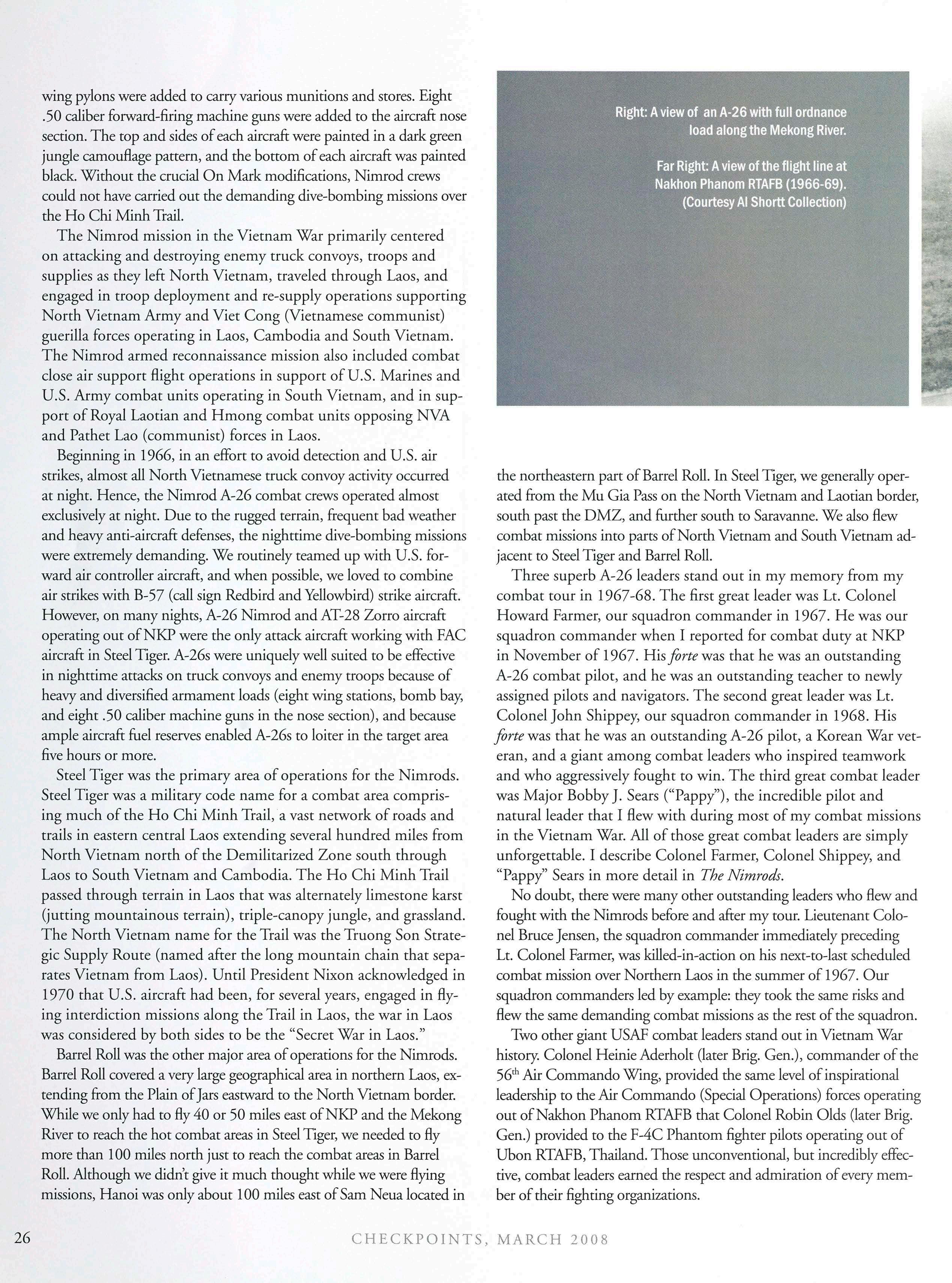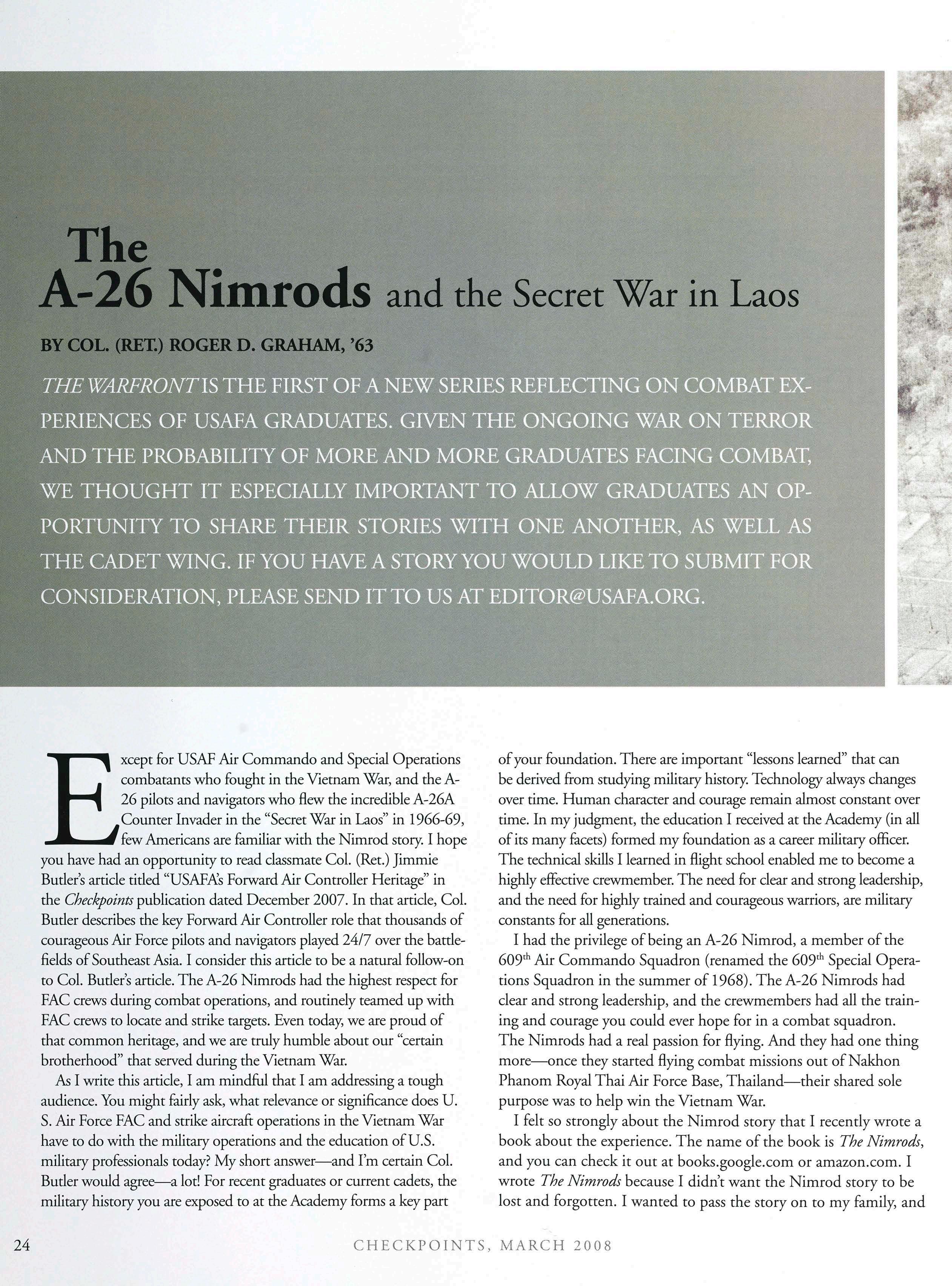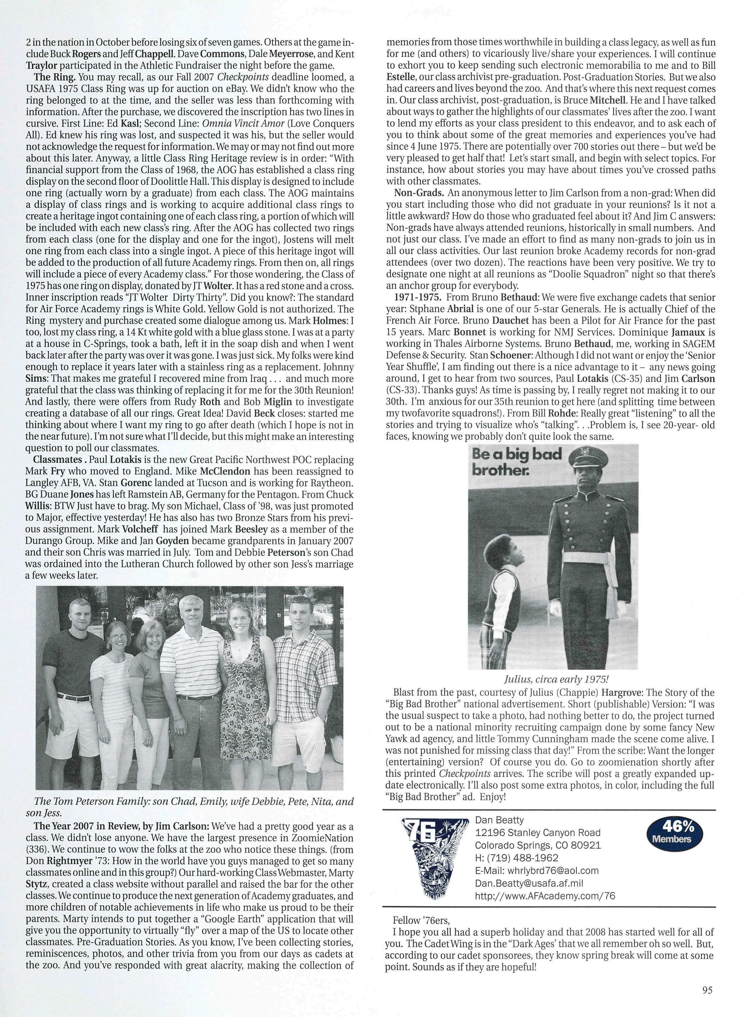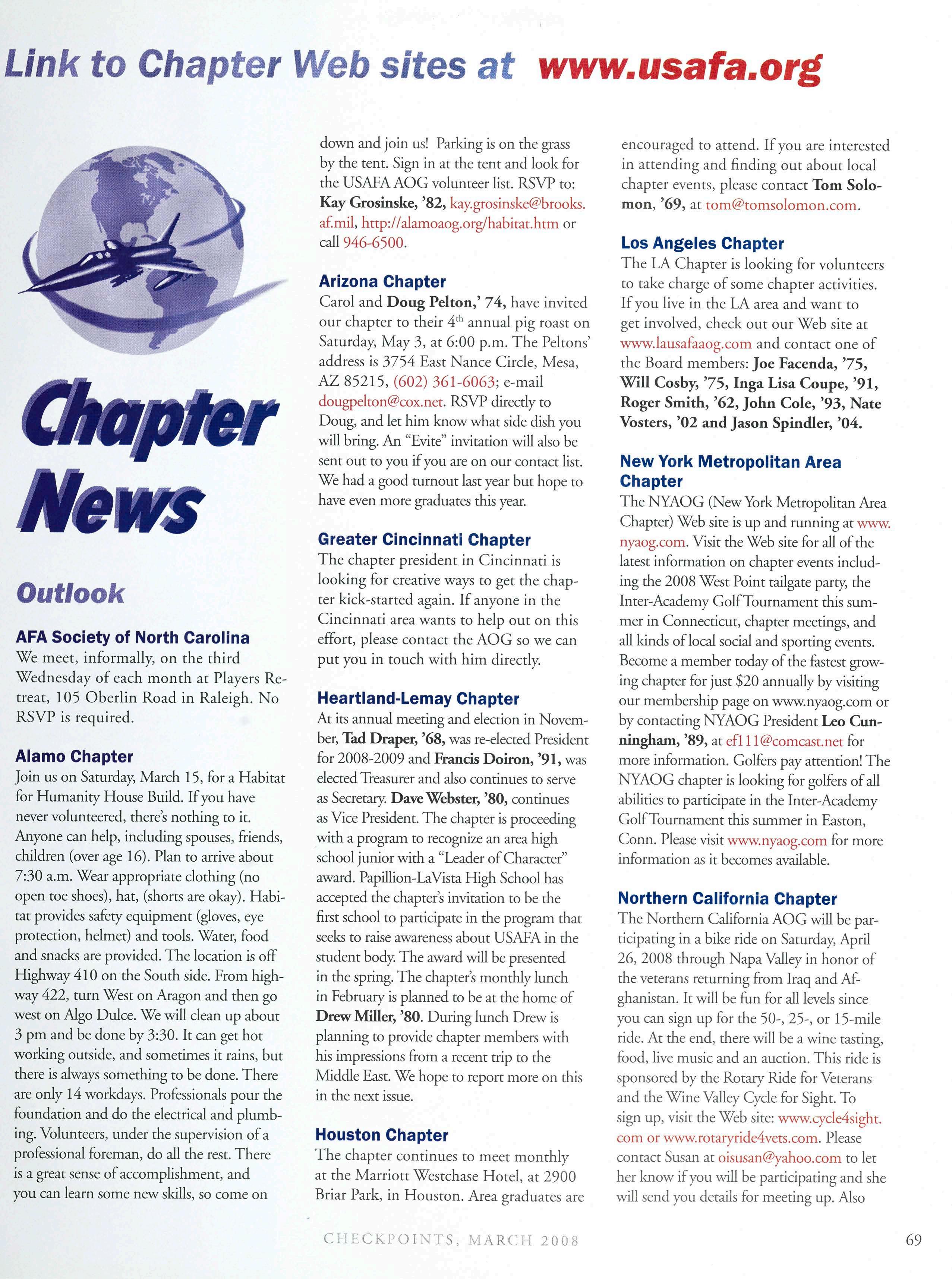 Checkpoints (ISSN 0274-7391) USPS 898-080 is published quarterly in March, June, September and December by the Association of Graduates, U.S. Air Force Academy (Phone: 719-472-0300, DSN: 3332067. FAX: 719-333-4194, E-mail: editor@aogusafa. org.) A portion ofyour dues pays for your magazine subscription. Additional copies may be purchased for $2.50 each, plus $4.60 for shipping. Periodicals postage paid at the U.S. Air Force Academy, Colo., andadditional mailingoffices. POSTMASTER: Send changeofaddress to Checkpoints Association ofGraduates, Doolitde Hall, 3116 Academy Drive, USAF Academy, CO 80840-4475.