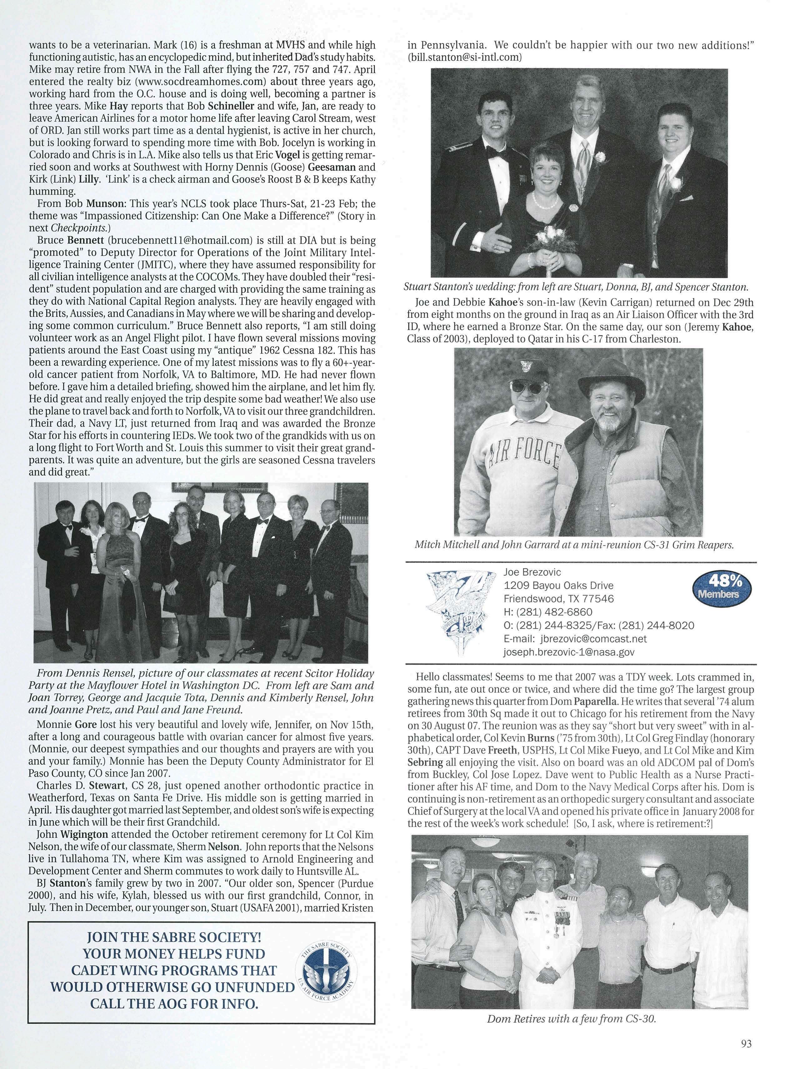 InDecember, GregMalyPSCed to PatrickAF Basewherehe continueswork as an Intel officer. John Harris flies F- 16s at Kunsan and returned from a deployment to Balad in the summer of2007. Dusty Fahie finished C-17 school in December and is offidally a C-17 Pilot. He reports to DoverinJan2008 to start his career in the3rdAS.