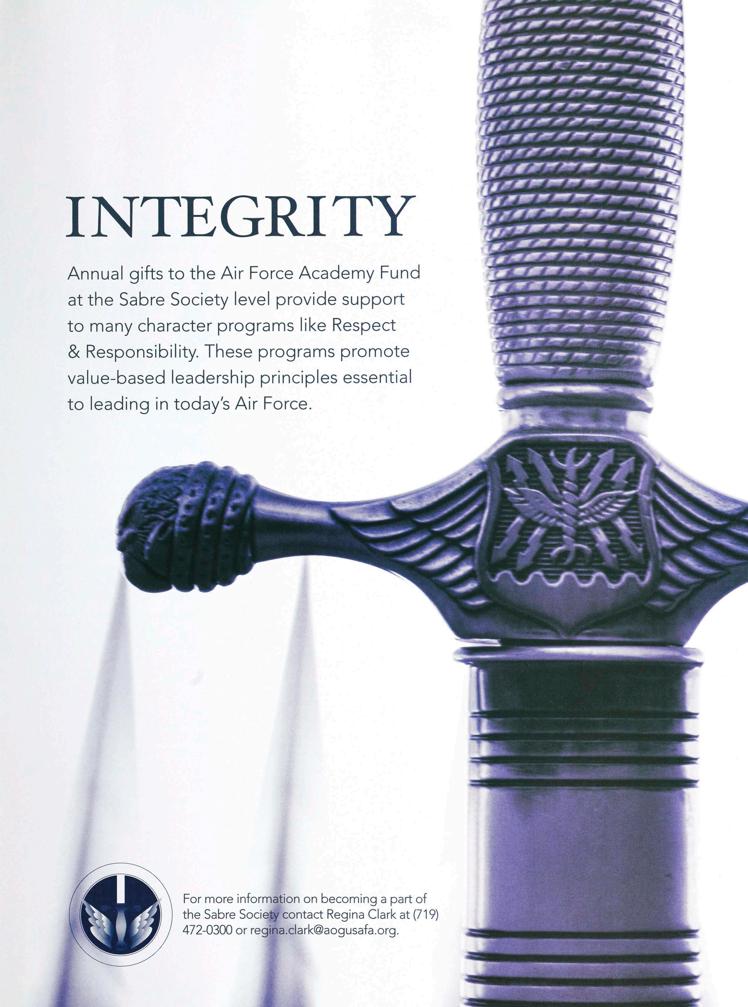 Annual gifts to the Air Force Academy Fund at the Sabre Society level provide support to many character programs like Respect & Responsibility. These programs promote value-based leadership principles essential to leading in todays Air Force.