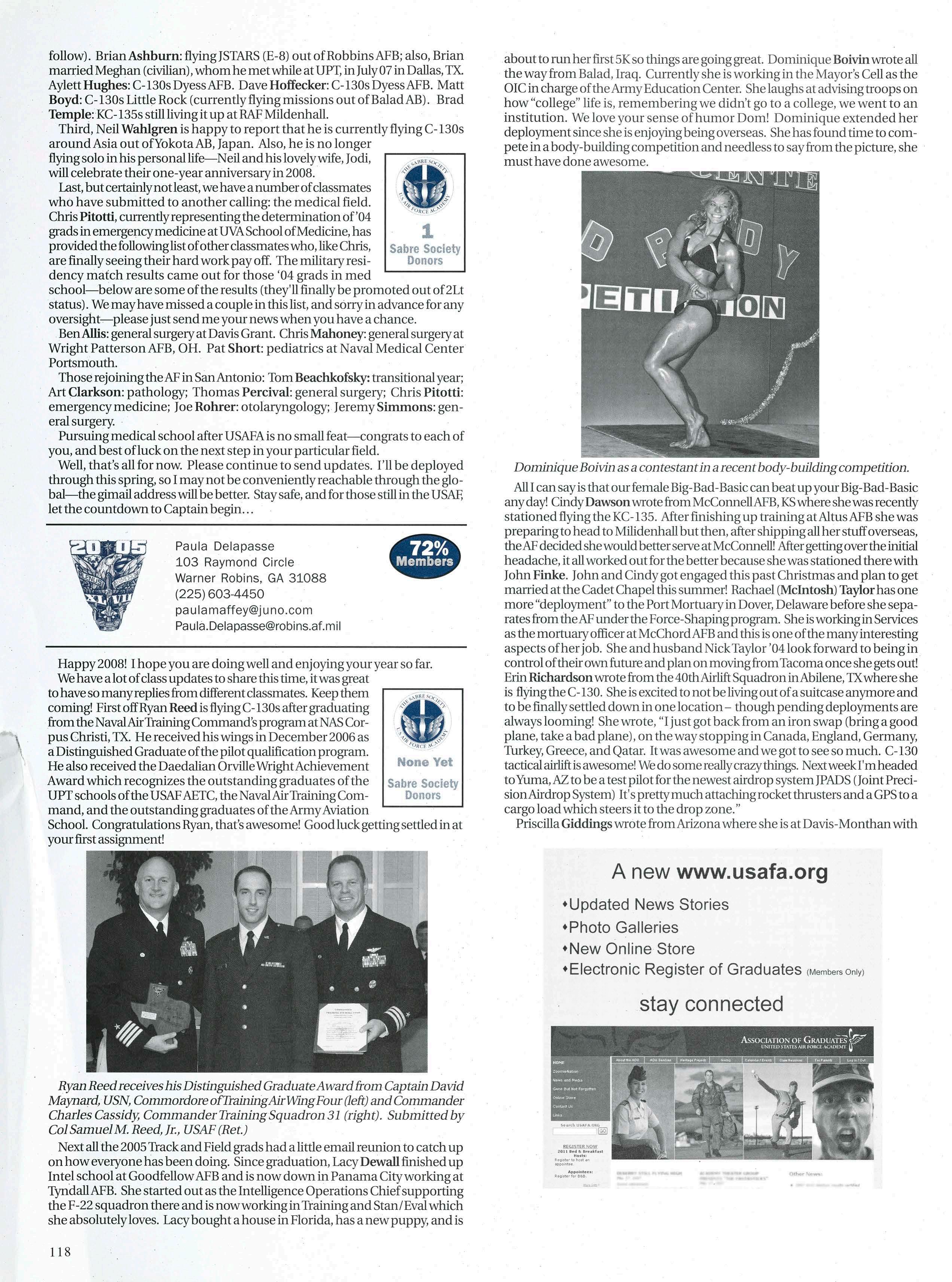 Happy2008! I hope you are doingwell and enjoyingyouryear so far. Wehave a lotofclassupdates to sharethistime, itwas great to have so manyrepliesfromdifferentclassmates. Keep them coming! First offRyan Reedis flying C-130s aftergraduating fromtheNavalAirTrainingCommand’s program atNAS Corpus Christi, TX. He received hiswings in December2006 as a Distinguished Graduate ofthepilotqualificationprogram. He also receivedthe Daedalian OrvilleWrightAchievement Awardwhich recognizes the outstandinggraduates ofthe UPT schools ofthe USAFAETC, the NavalAirTrainingCommand, andthe outstandinggraduates oftheArmyAviation School. CongratulationsRyan, that’s awesome! Goodluckgettingsettled in at yourfirstassignment!