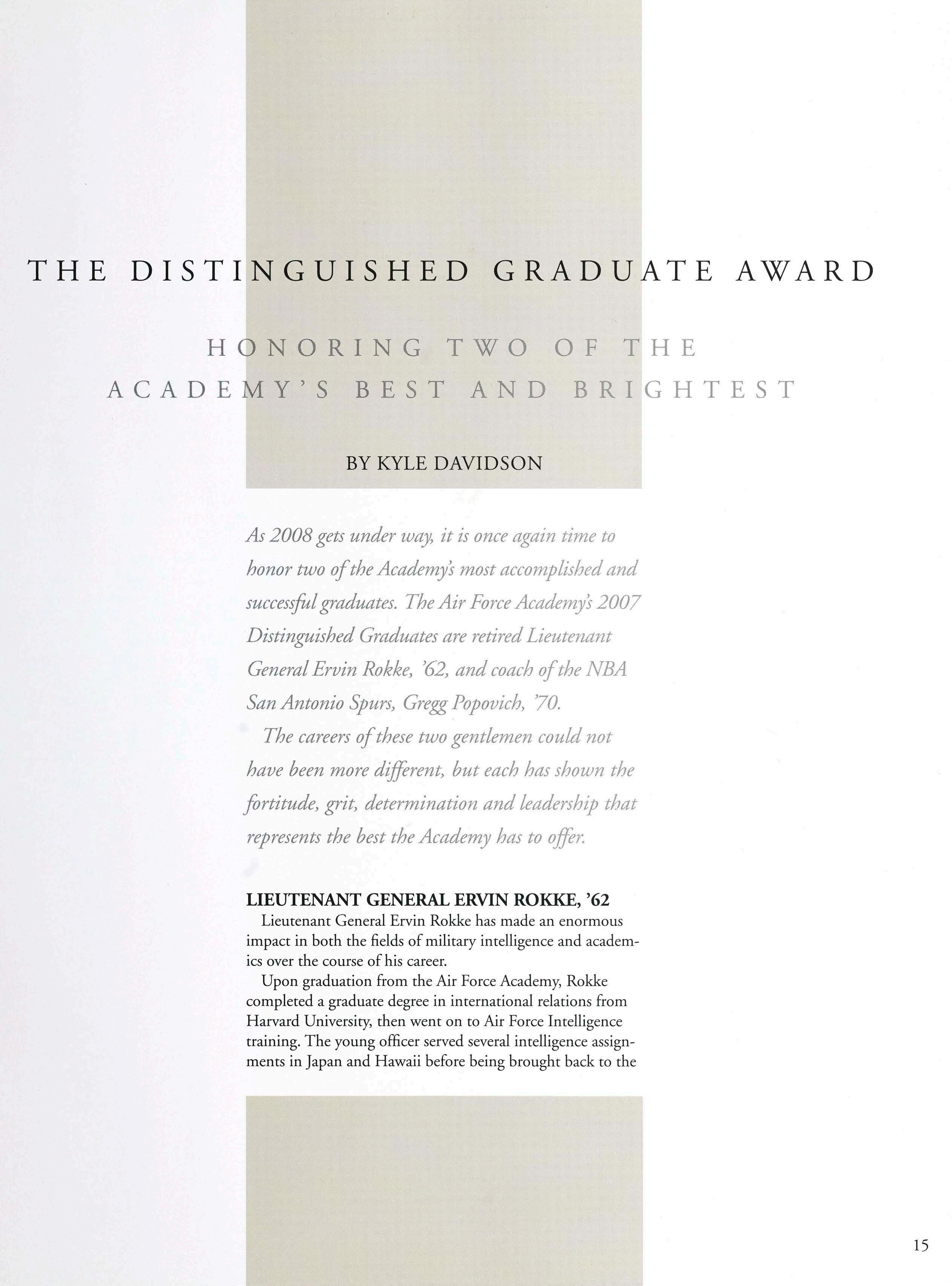 Retired Lt. Gen. Ervin Rokke, ’62, and Gregg Popovich, ’70, are named two ofthe Academy’s best.
