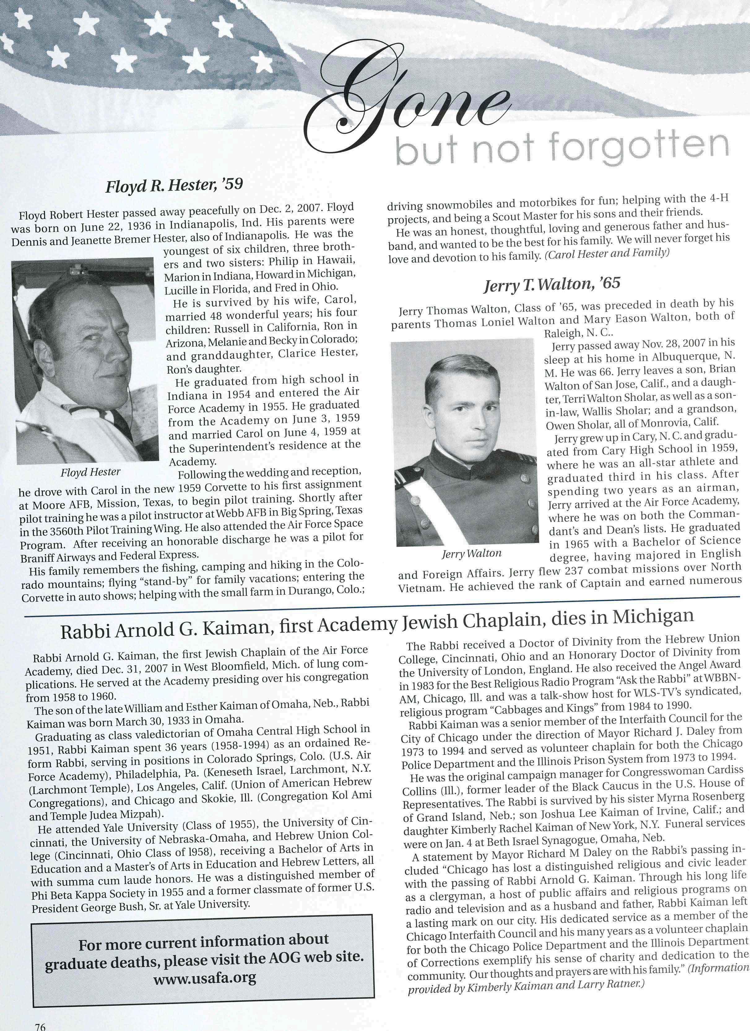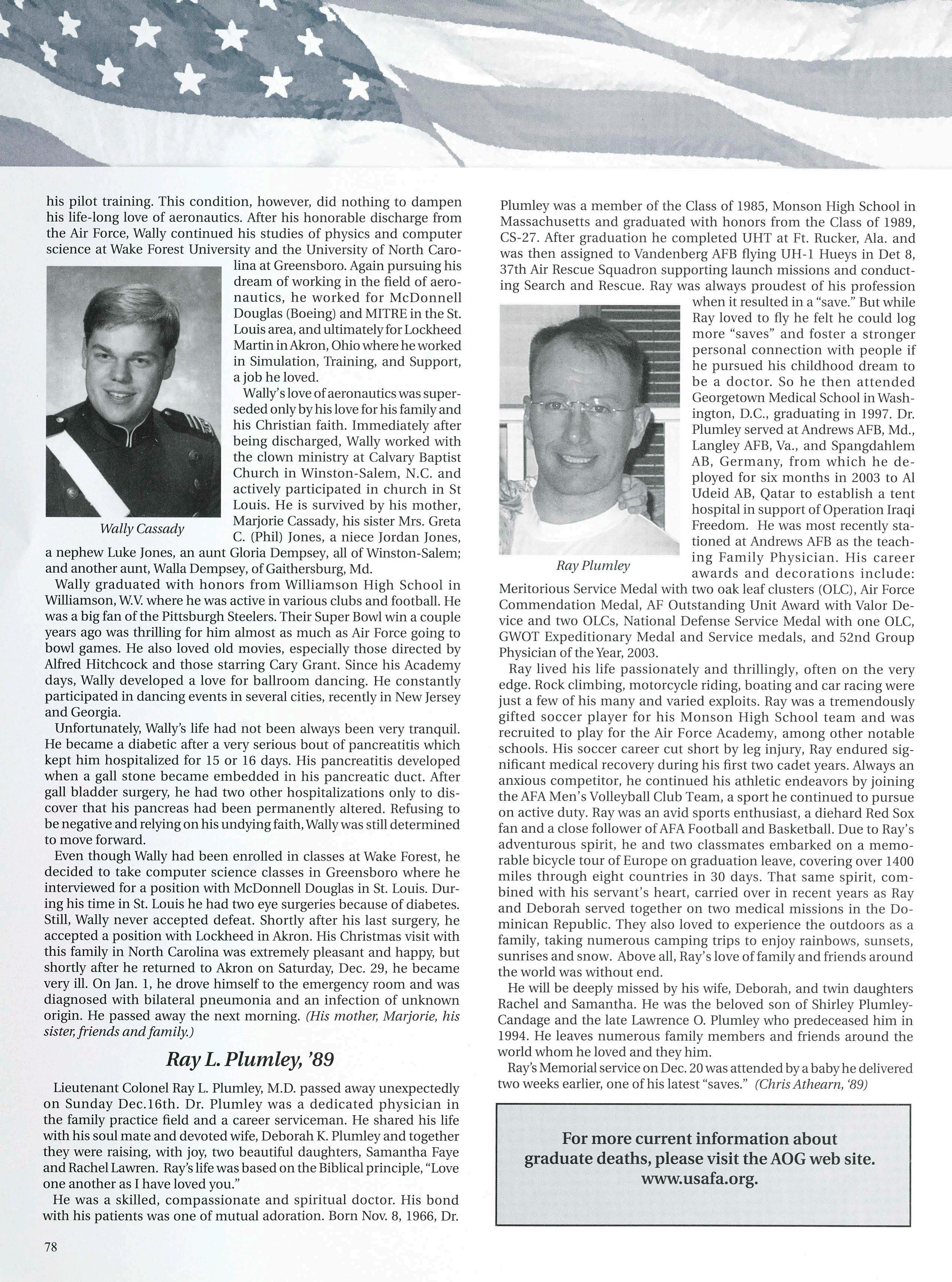 The second part ofthe AOG mission Providingleadership, communication & support to all USAFA graduates and promoting camaraderie among them means something very important to all of us all USAFA graduates are our “wingmen for life.” I flat didn’t know all the things the AOG does for graduates. I thought all they really did was send me a Checkpoints book (which I really do read cover to cover a fact validated by the 2006 grad survey); a Graduate Register; the ability to find, fix or track my cadet ring ifI lost it; and all my reunions (which get to be more fun as the years go by). What I didn’t know is that there are 45 other major programs (see attached list) of responsibility, from job fairs to business networks all the way to taking care of our graduate wingmen after their death. In fact, I didn’t even know that some ofthe “transition” programs I used during my recent post-graduate retirement job search were sponsored by the AOG. The AOG is the partner behind the scenes creating and providing tools like ZoomieNation, ISabre and SACC job fairs. Three grads helped me get my new post-retirementjob after I contacted them via this and other AOG affinity groups like AcademyWomen, which sponsors a job fair every fall and receives resources from the AOG for support. They also supported the travel to this symposium for more than ten USAFA Women. Many others helped me get interviews for potentialjobs but I had to ask. I’ve helped other graduates get their new jobs and understand their transitions. A wingman for life means FOR LIFE even life after the uniform! Today’s cadets are tomorrow’s graduates. We are taking care ofthem from “cradle to grave” figuratively and literally with an awful lot ofhelp from the AOG through your donations.