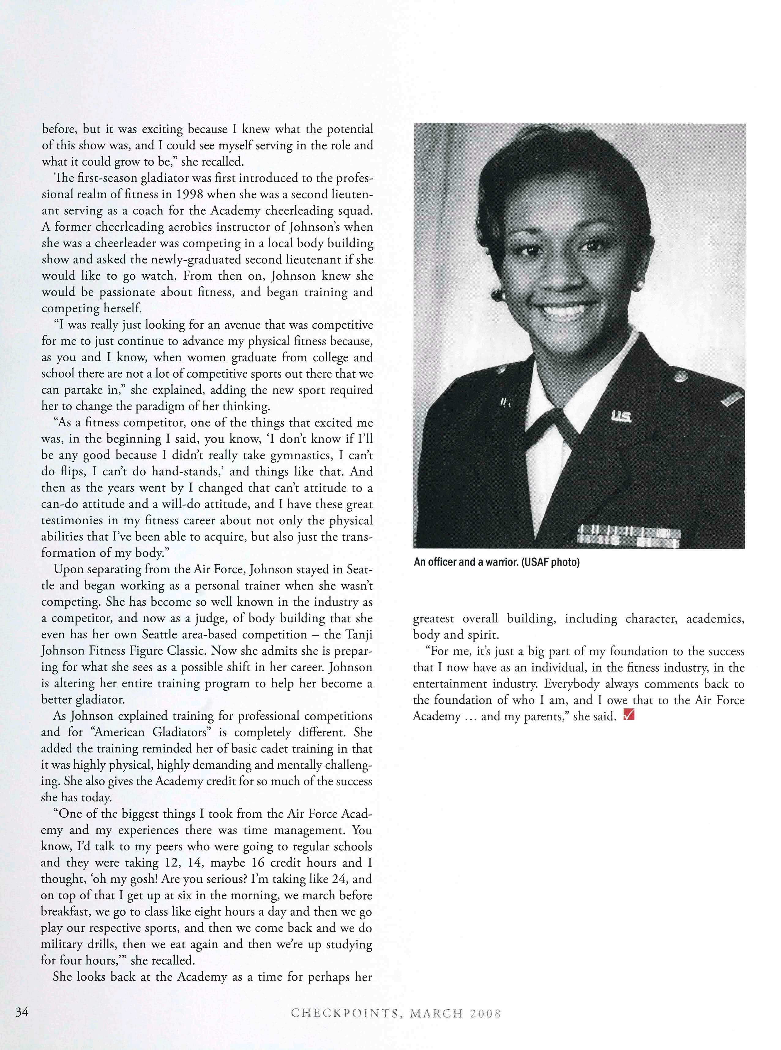DominiqueBoivin as a contestantin a recent body-buildingcompetition. All I can sayis that our femaleBig-Bad-Basic can beatupyourBig-Bad-Basic anyday! CindyDawsonwrote fromMcConnellAFB, KSwhere shewas recently stationed flyingthe KC-135. After finishingup training at AltusAFB she was preparingto head to Milidenhallbutthen, aftershippingallher stuffoverseas, theAF decidedshewouldbetter serve atMcConnell! Aftergetting overthe initial headache, it allworked out forthe betterbecause she was stationedtherewith John Finke. John and Cindygot engaged this pastChristmas and plan to get married at the CadetChapel this summer! Rachael (McIntosh) Taylorhas one more “deployment” to the PortMortuaryin Dover, Delaware before she separates fromtheAFunderthe Force-Shapingprogram. Sheisworkingin Services as the mortuaryofficer at McChordAFB andthis is one ofthe manyinteresting aspects ofherjob. She and husband NickTaylor ’04 lookforward to being in control oftheir own futureandplan on movingfromTacoma once she gets out! Erin Richardsonwrote fromthe40thAirliftSquadroninAbilene, TXwhereshe is flyingthe C-130. She is excited to not be living out ofa suitcaseanymore and to be finally settled downin one location - thoughpendingdeployments are alwayslooming! She wrote, “Ijustgot backfrom an iron swap (bring a good plane, take a bad plane), on theway stoppingin Canada, England, Germany, Turkey, Greece, and Qatar. It was awesome andwegotto see so much. C-130 tacticalairliftis awesome! We do some reallycrazythings. Nextweekl'mheaded toYuma,AZ to be a test pilotforthe newest airdrop systemJPADS (Joint PrecisionAirdrop System) It'sprettymuch attachingrocketthrustersand a GPS to a cargo loadwhich steers it to the drop zone.