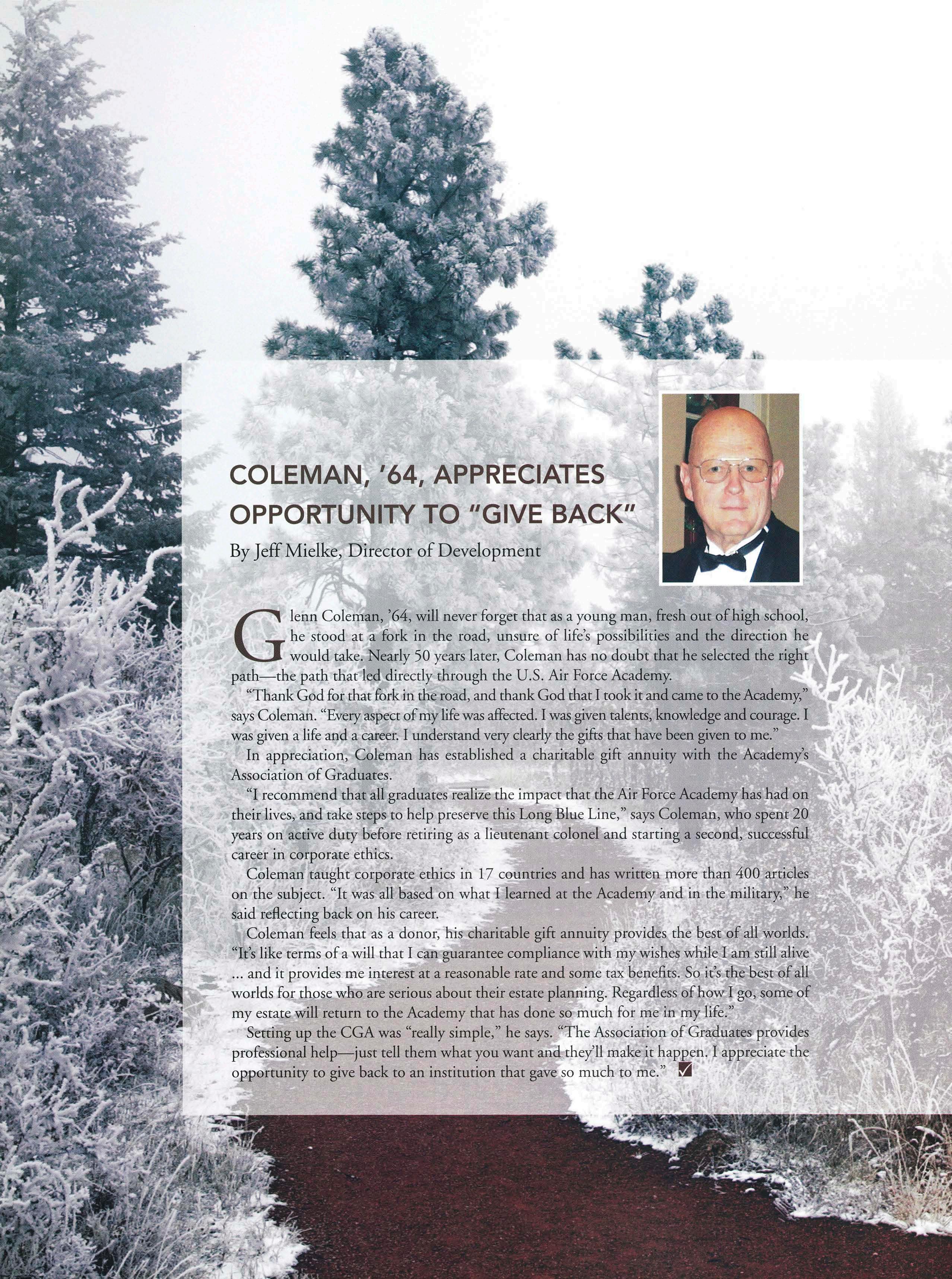 willingness to admit that things had gotten “offtrack” but also their determination to renew the energy, clarify the focus, build bridges instead ofbarriers and PUSH IT UP significandy—hiring a new CEO, filling a few critical fulltime positions in the AOG, installing previouslypurchased software to create efficiencies in financial tracking and responsiveness in development and giving efforts, strengthening graduate programs, fulfilling giving promises to the cadets and USAFA leadership, renewing our strategic planning and performance measures and maintaining a rich heritage effort for generations ofairmen to come. Most ofall, I was impressed beyond measure with the AOG staffitself. I have seen more than my share ofhard-working, dedicated men and women who deliver day after day often in the midst of turmoil and crisis but always with a dedication that is unmatched. Tell them thank you. That isn’t enough, but they are the kind ofpeople who will think the world ofthe recognition.