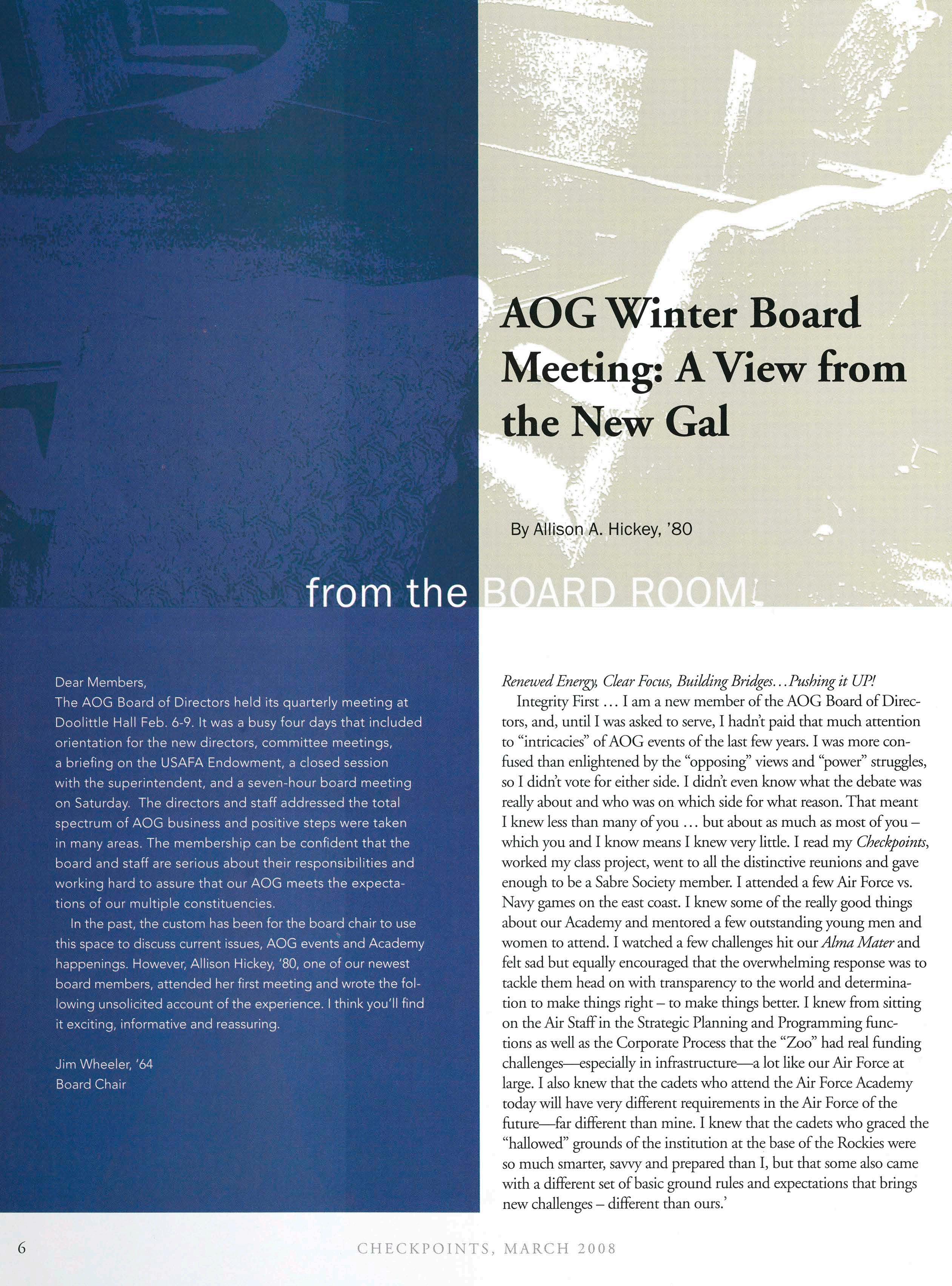 In the past, the custom has been for theboard chair to use this space to discuss current issues, AOG events and Academy happenings. However, Allison Hickey, '80, one of our newest board members, attended her first meeting and wrote the following unsolicited account of the experience. think you'll find it exciting, informative and reassuring.