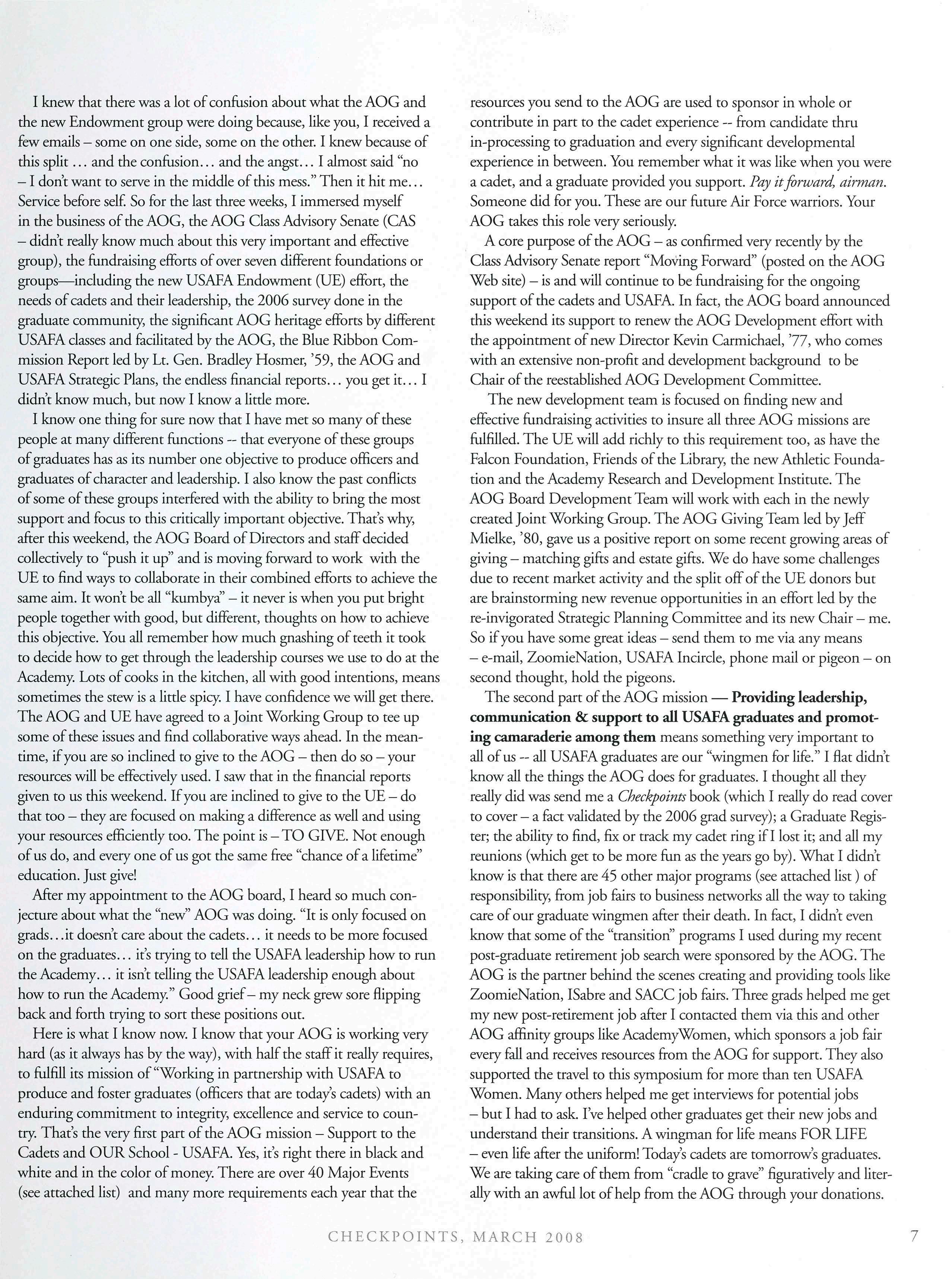 I don’t want to serve in the middle ofthis mess.” Then it hit me... Service before self. So for the last three weeks, I immersed myself in the business ofthe AOG, the AOG Class Advisory Senate (CAS didn’t really know much about this very important and effective group), the fundraising efforts of over seven different foundations or groups—including the new USAFA Endowment (UE) effort, the needs ofcadets and their leadership, the 2006 survey done in the graduate community, the significant AOG heritage efforts by different USAFA classes and facilitated by the AOG, the Blue Ribbon Commission Report led by Lt. Gen. Bradley Hosmer, ’59, the AOG and USAFA Strategic Plans, the endless financial reports... you get it... I didn’t know much, but now I know a little more.
