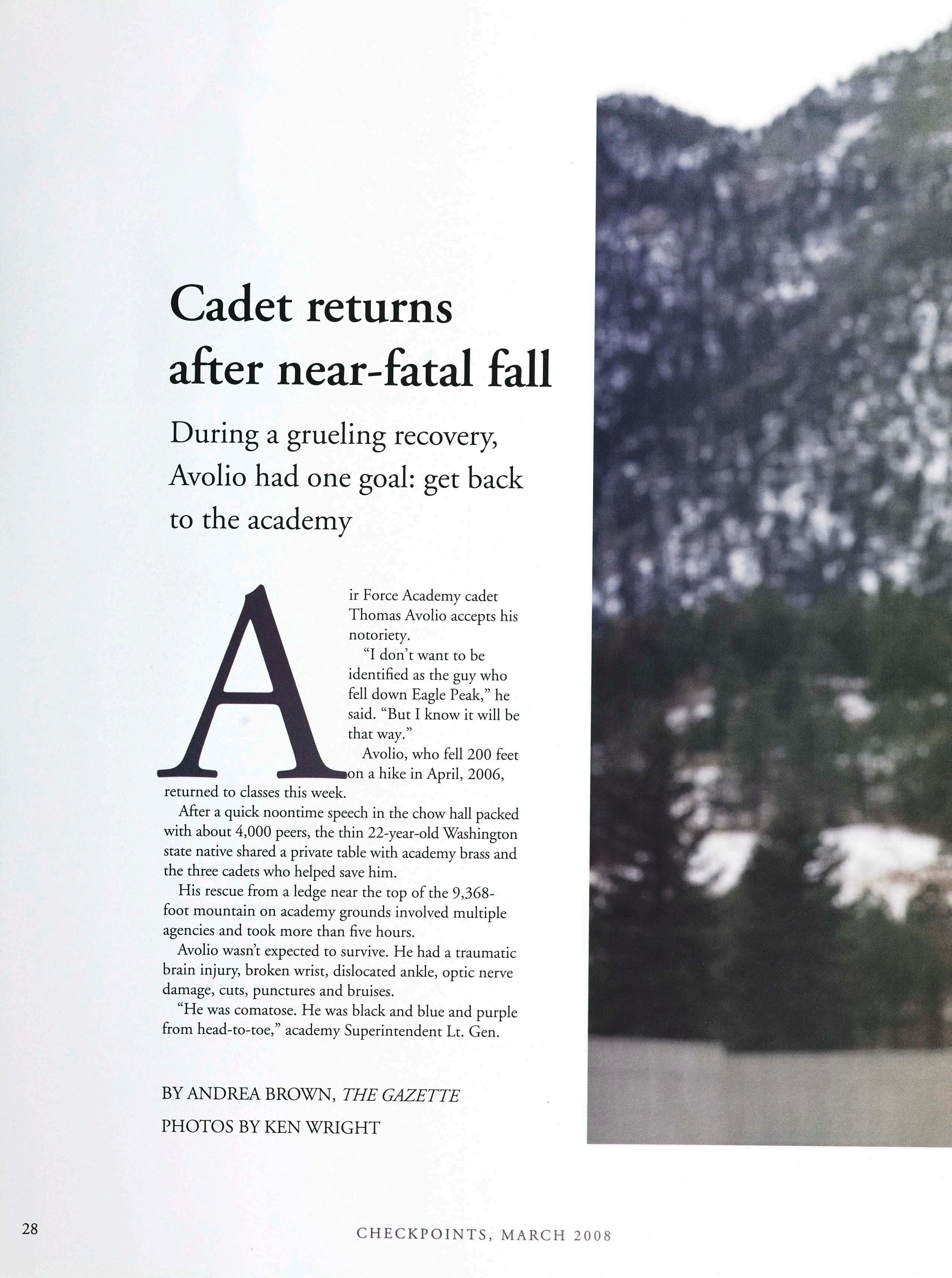 Cadet 2nd Class Thomas Avolio never gave up his quest to return to the Academy following a life-threatening 200-foot fall from Eagle Peak. Story on pg. 28. (Photo by Ken Wright)