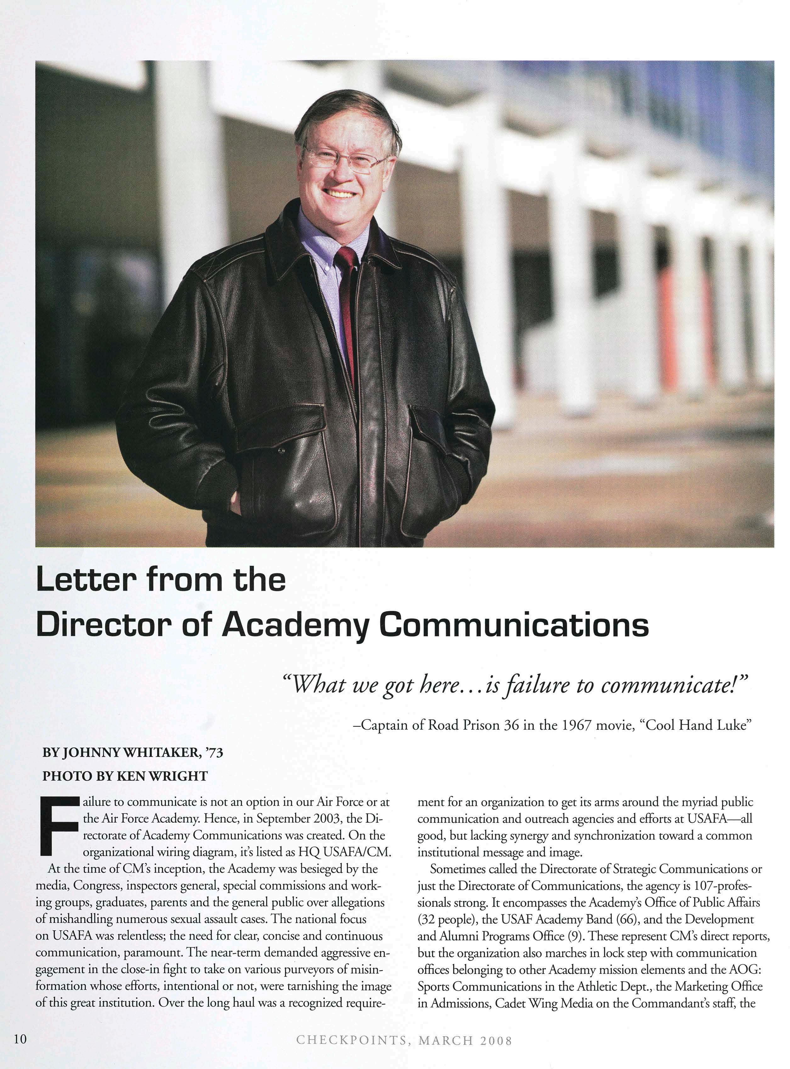 Failure to communicate is not an option in our Air Force or at the Air Force Academy. Hence, in September 2003, the Directorate ofAcademy Communications was created. On the organizationalwiring diagram, it’s listed as HQUSAFA/CM.
