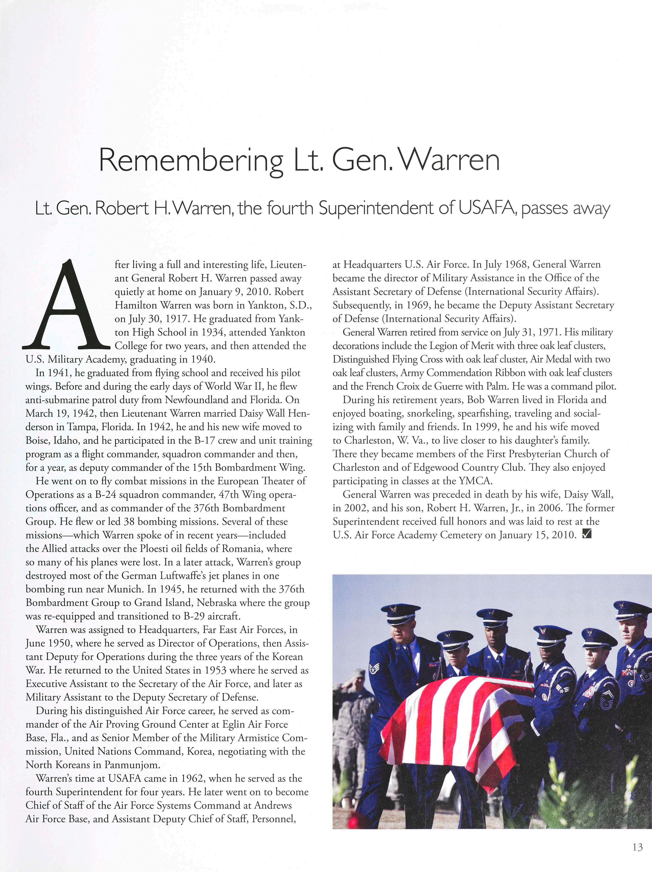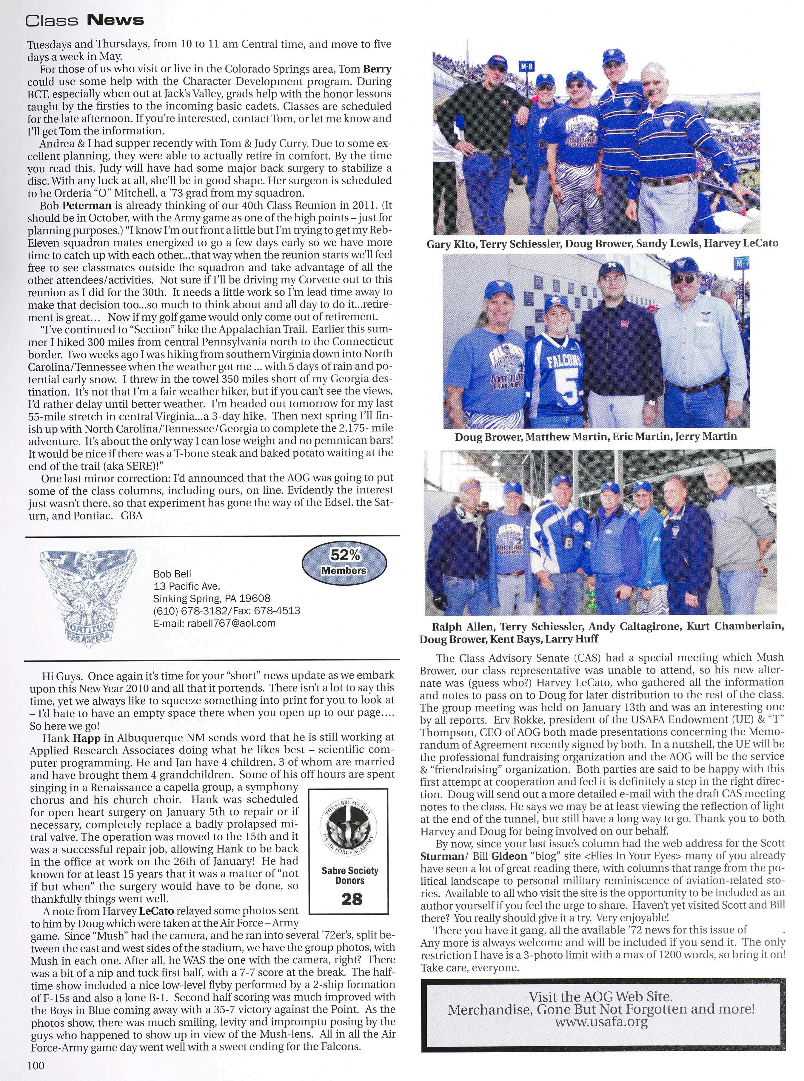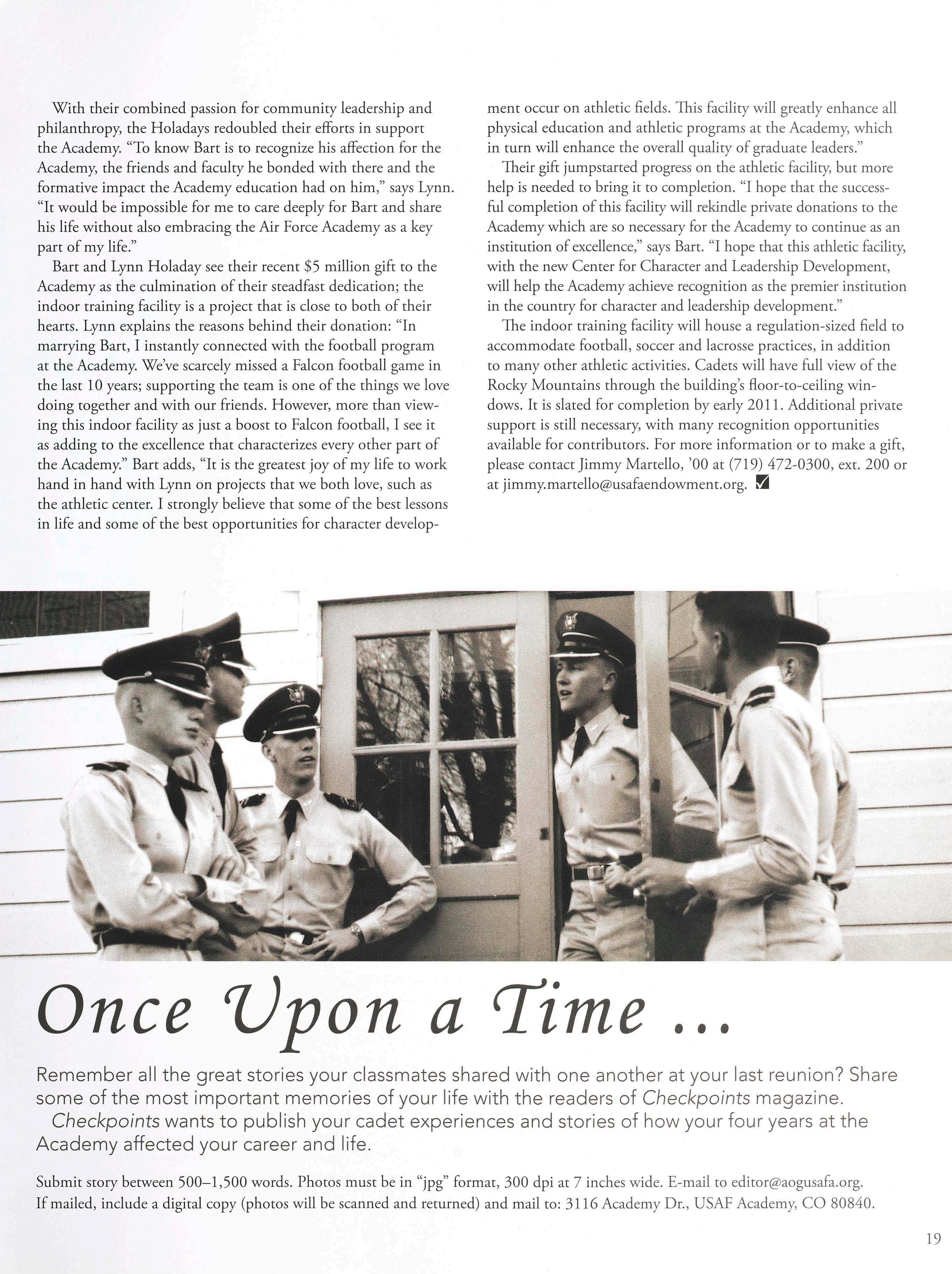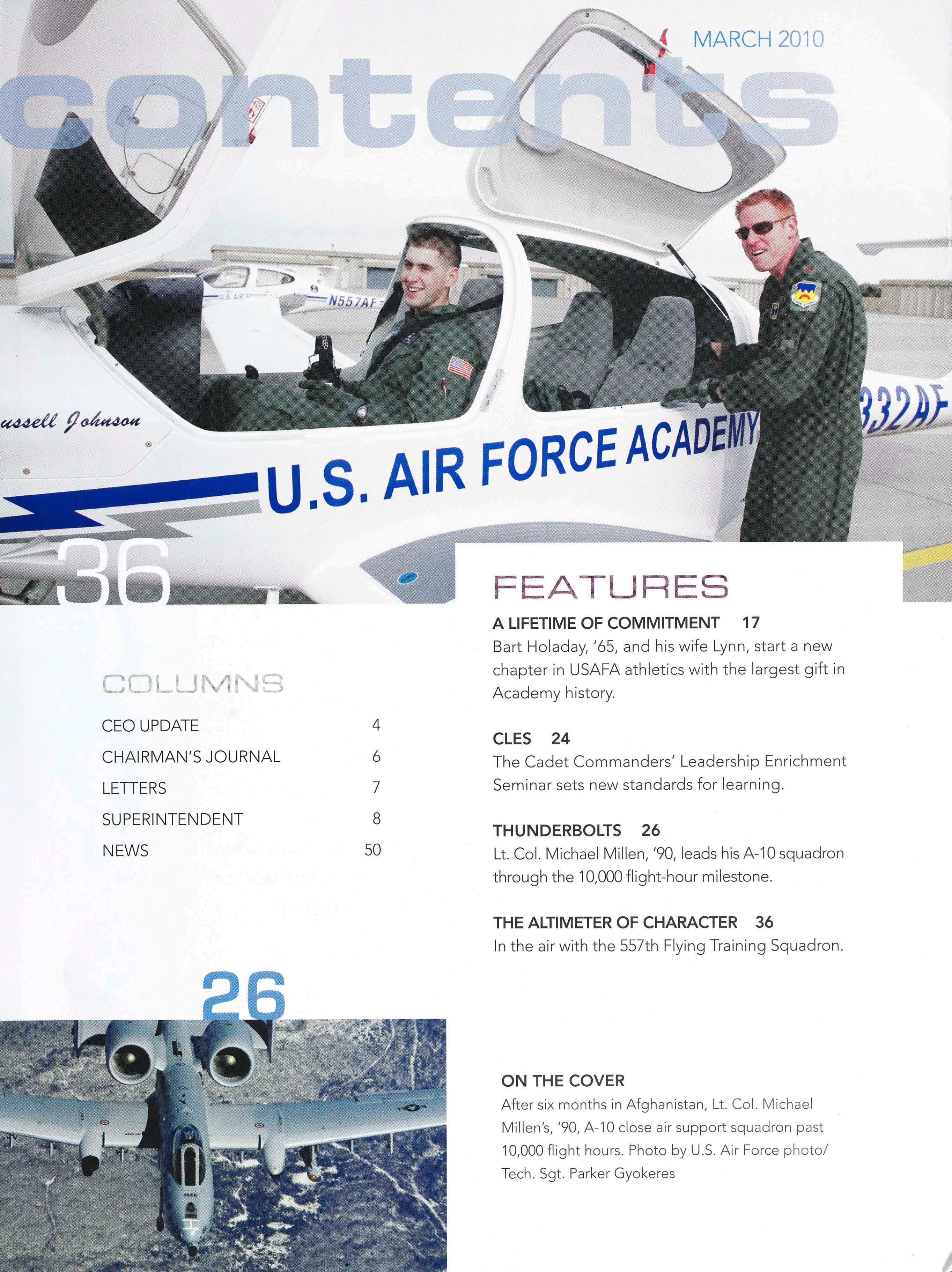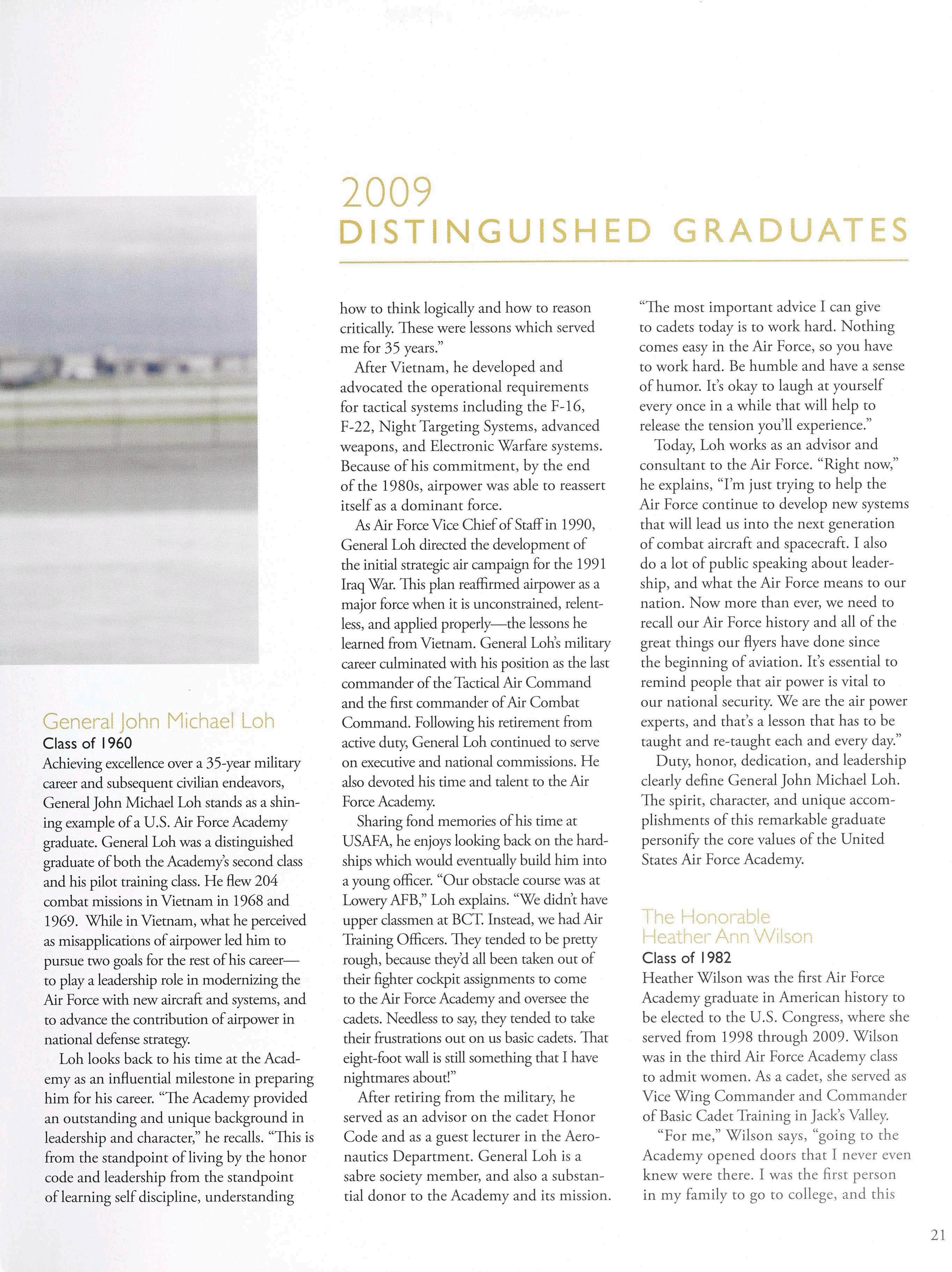 ere we are in another decade, and 2010 is already showing signs of renewed prosperity. Our new generation of Academy progeny are proudly serving our nation and representing our Academy with flying colors. Just this January, Captain Ian Holt, ’04, Air Force Cyclist, was named Air Force Male Athlete of the Year; C1C Bradford Waldie, ’09, won the prestigious Alberta Bart Holaday Scholarship to study at Oxford University, and Air Force 1 st Lt. Roslyn Schulte, ’06, made the ultimate sacrifice when she was killed in action in Afghanistan. She was posthumously awarded the National Intelligence Medal for Valor. While we honor these individuals, we must also remember to pay tribute to the countless airmen who have committed their efforts to easing the pain and suffering in Haiti after what is certainly the worst earthquake of the century. For their achievements, large and small, I salute the fine young men and women who are our alumni.
