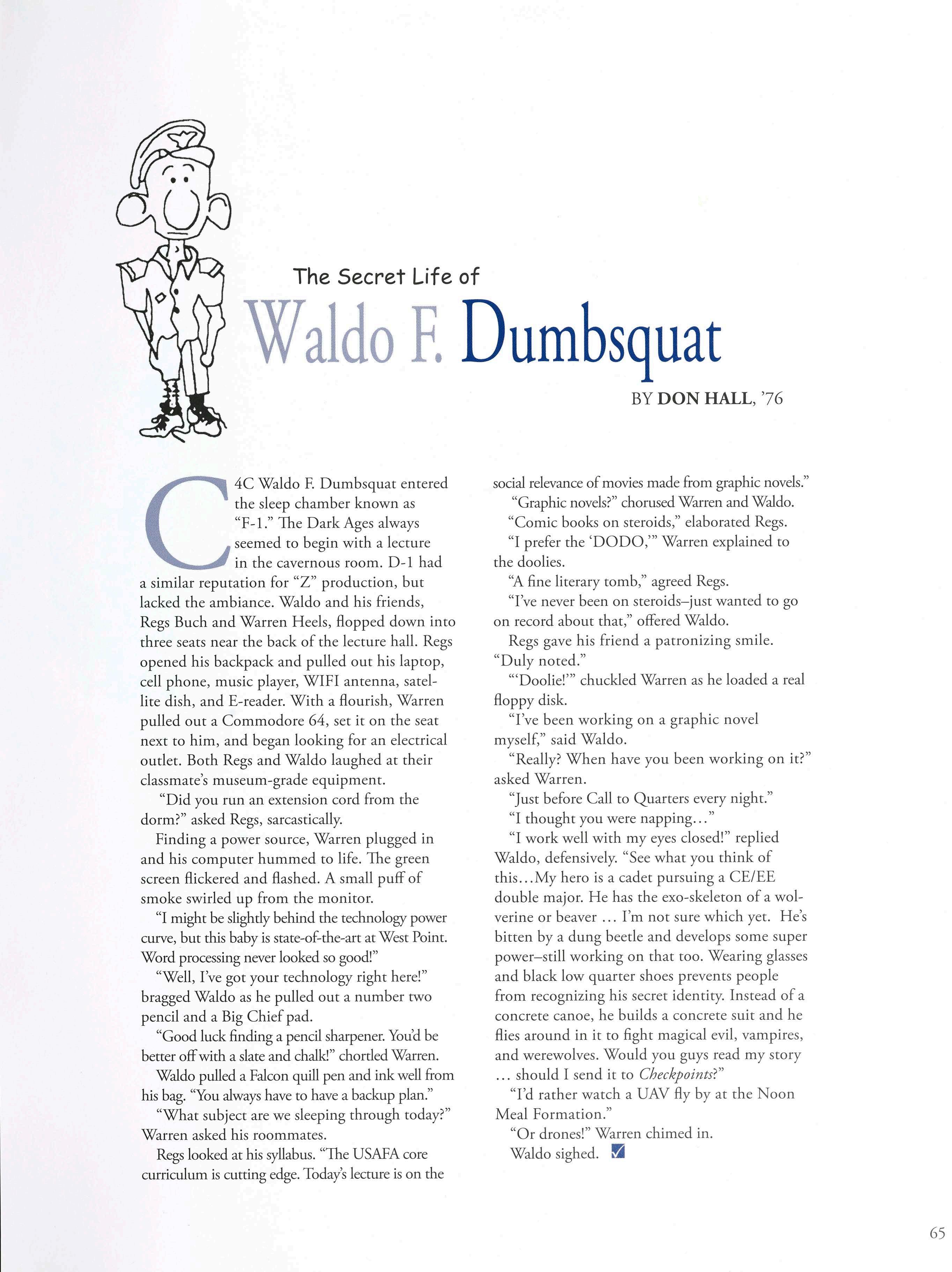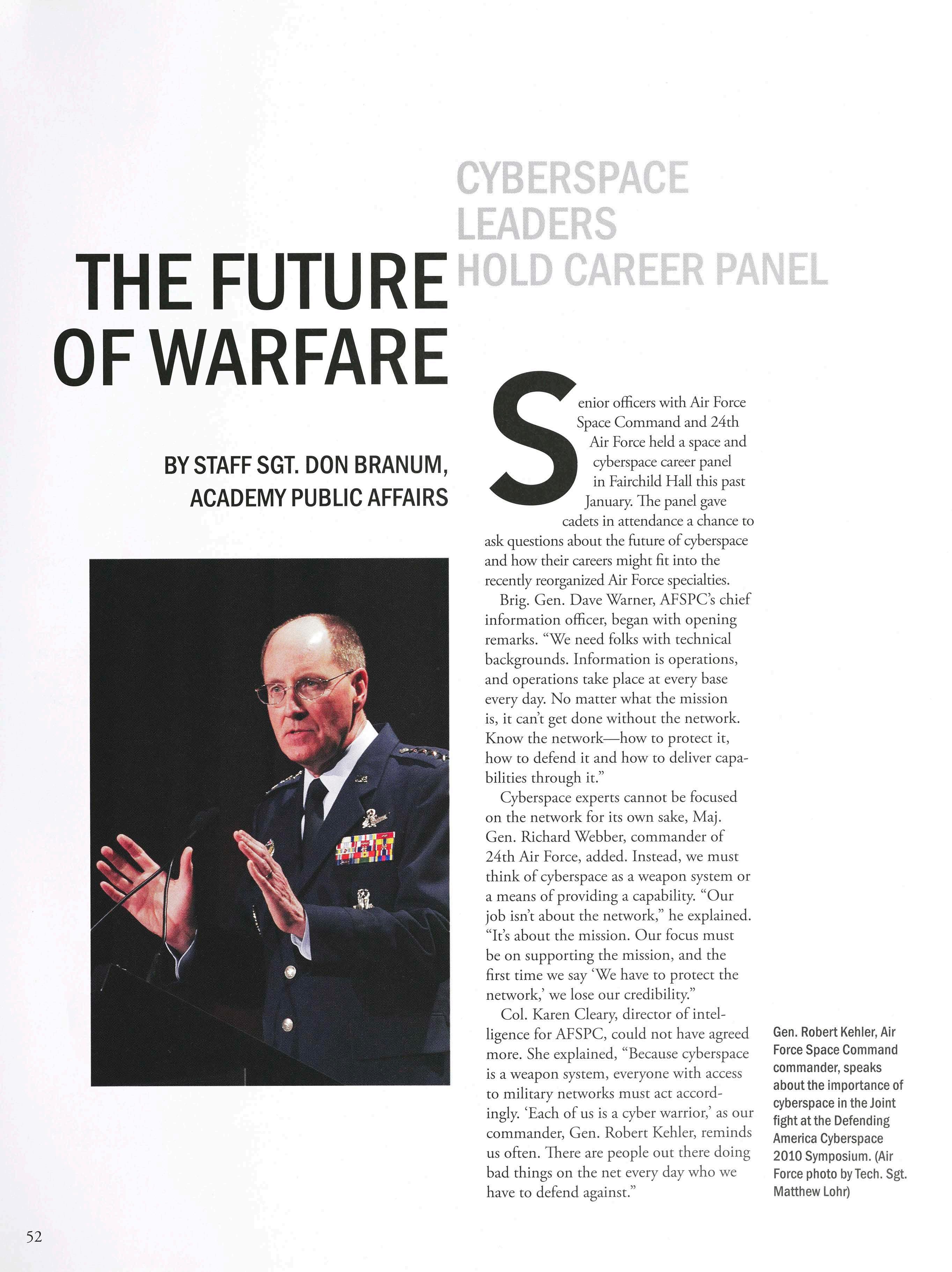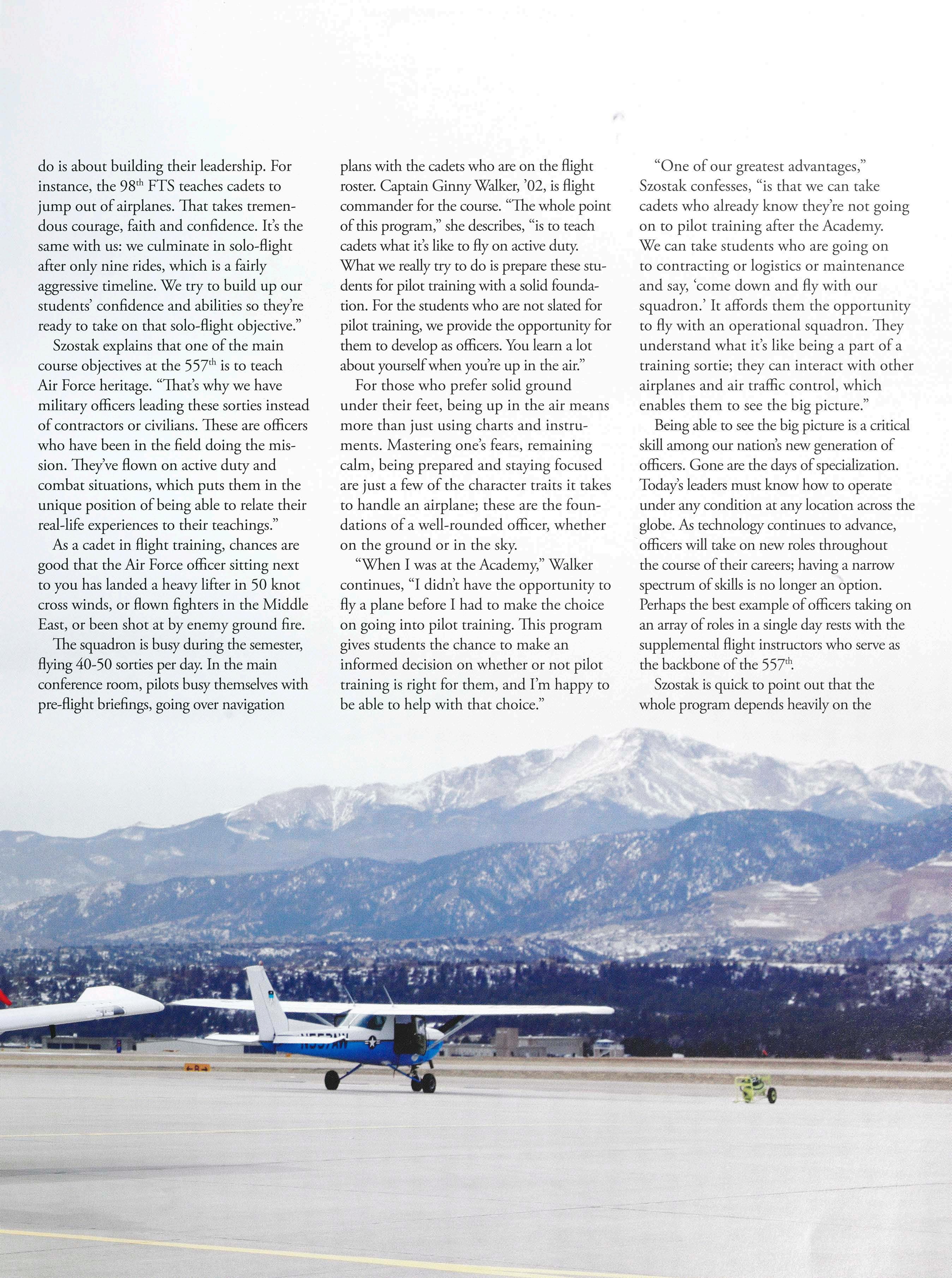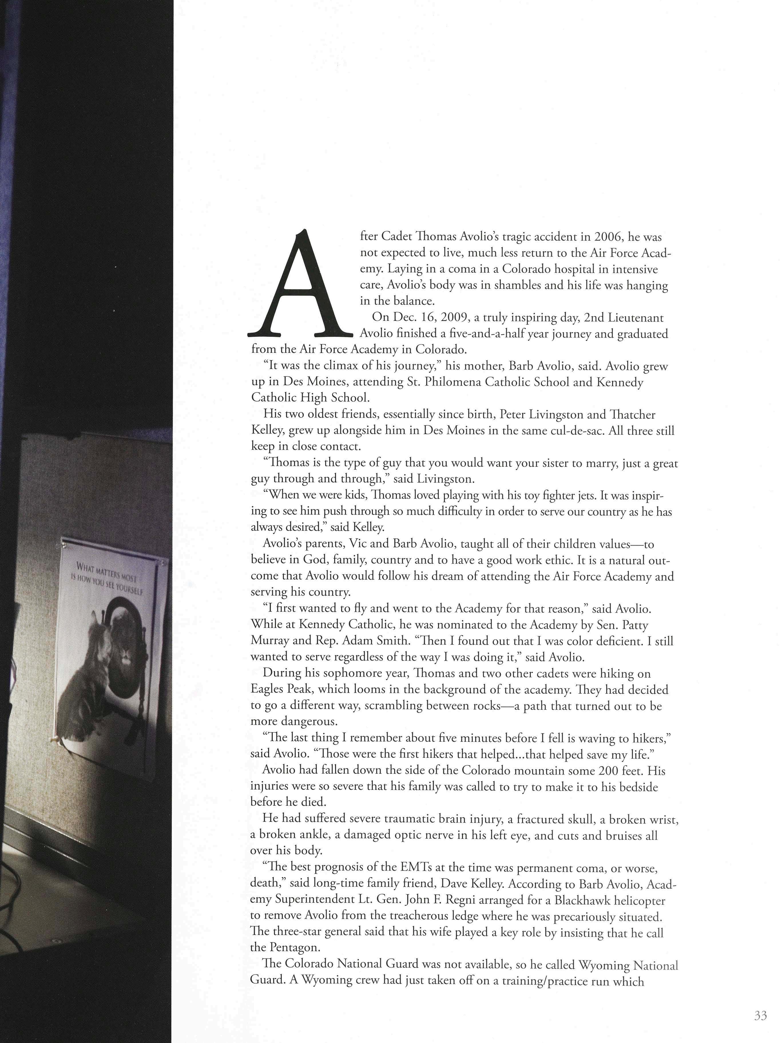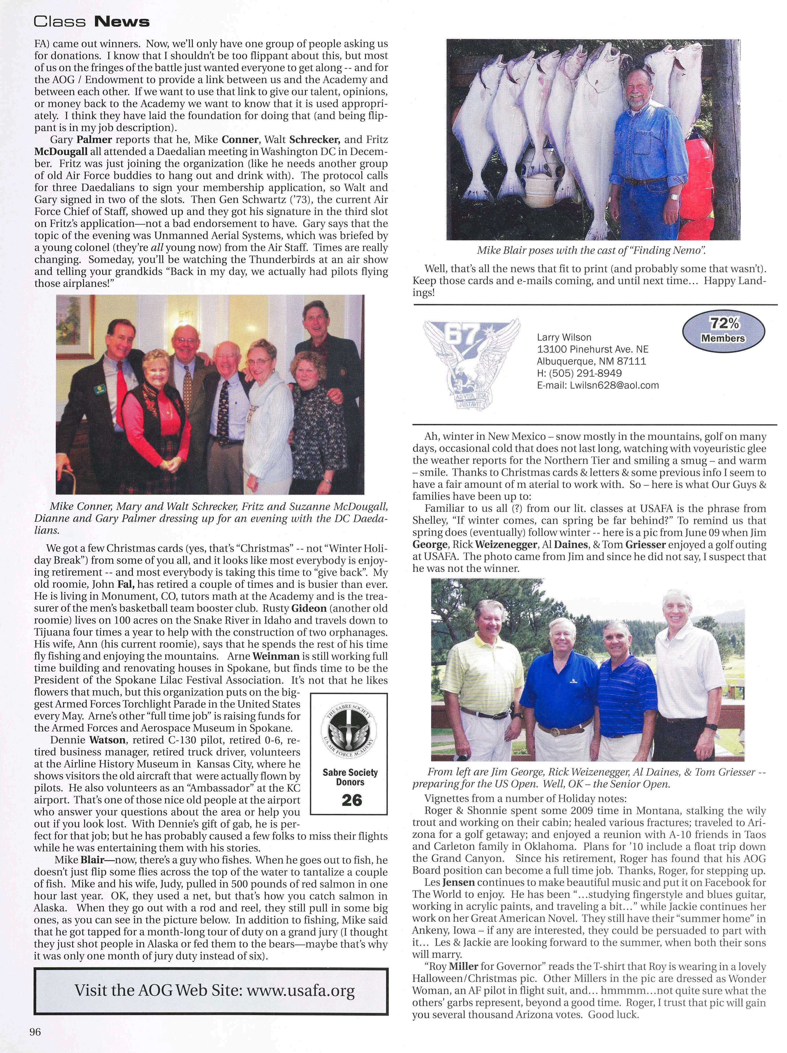 ere we are in another decade, and 2010 is already showing signs of renewed prosperity. Our new generation of Academy progeny are proudly serving our nation and representing our Academy with flying colors. Just this January, Captain Ian Holt, ’04, Air Force Cyclist, was named Air Force Male Athlete of the Year; C1C Bradford Waldie, ’09, won the prestigious Alberta Bart Holaday Scholarship to study at Oxford University, and Air Force 1 st Lt. Roslyn Schulte, ’06, made the ultimate sacrifice when she was killed in action in Afghanistan. She was posthumously awarded the National Intelligence Medal for Valor. While we honor these individuals, we must also remember to pay tribute to the countless airmen who have committed their efforts to easing the pain and suffering in Haiti after what is certainly the worst earthquake of the century. For their achievements, large and small, I salute the fine young men and women who are our alumni.