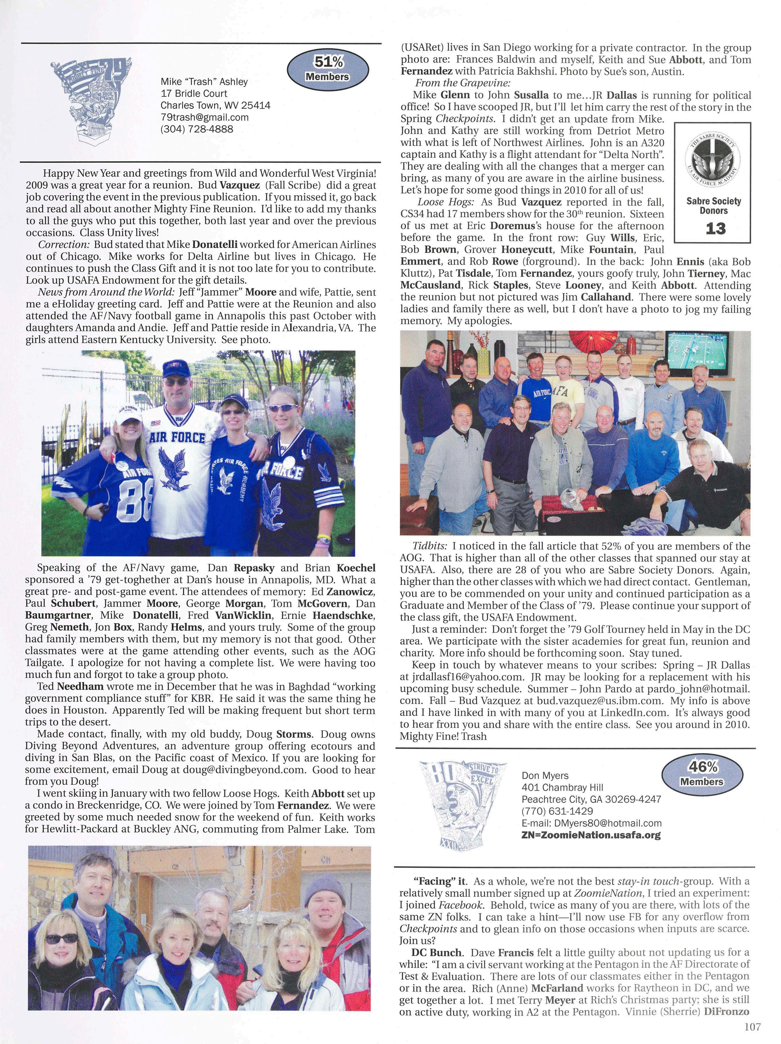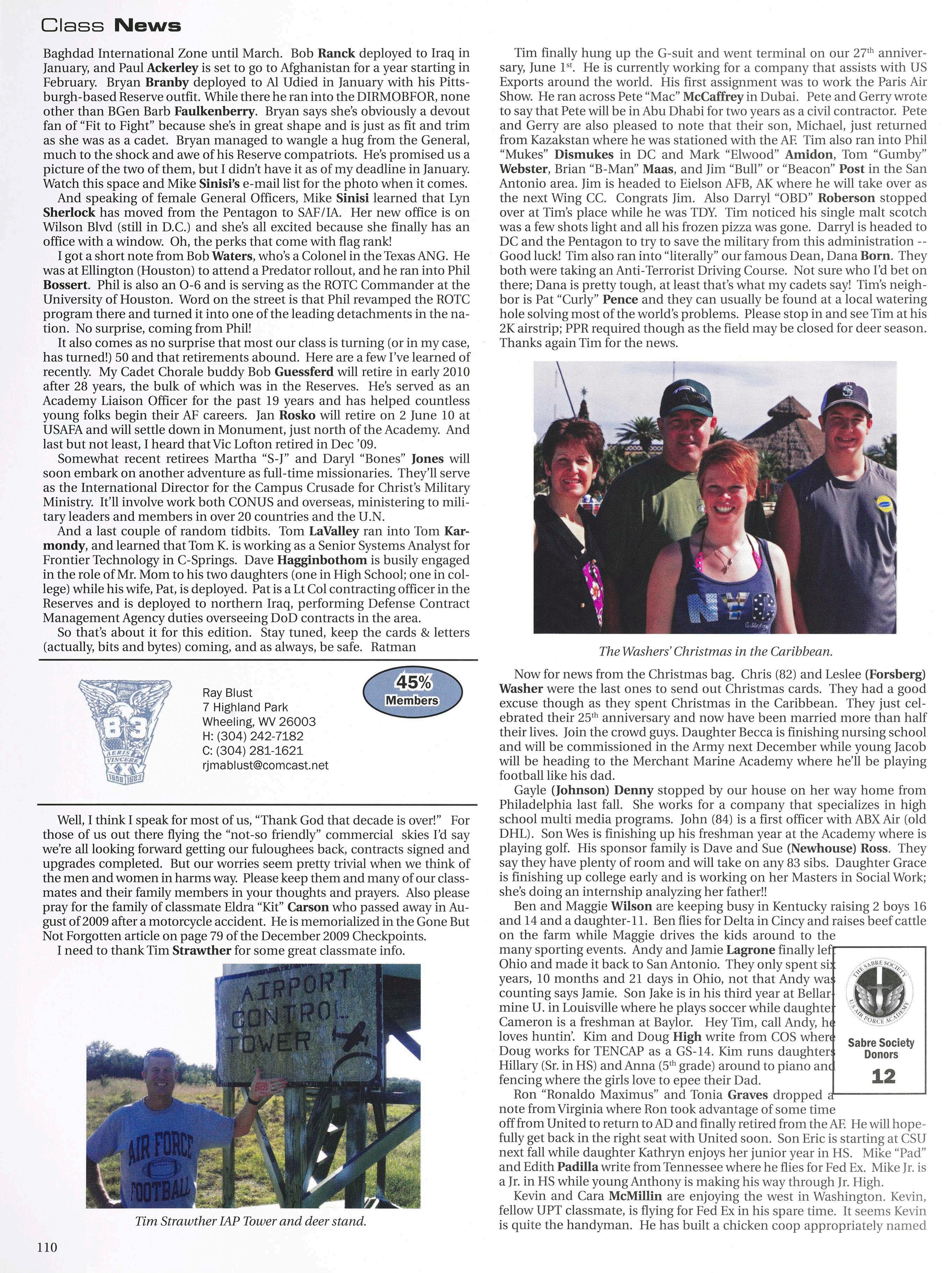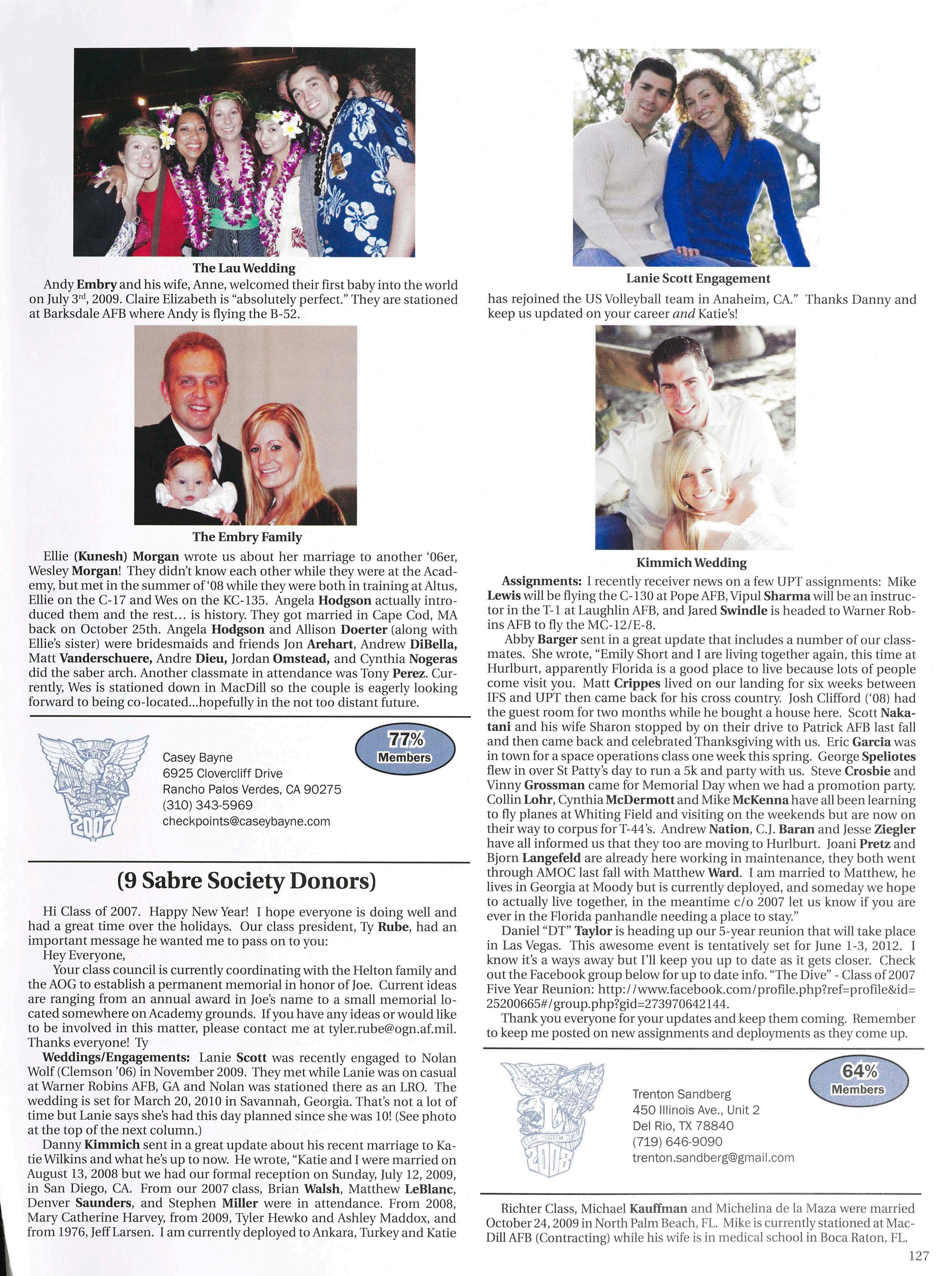 Happy NewYear Bongers! I hope 2010’s first update finds you doing well. I’d like to give a special thank you to Heidi Schlagheck, our class senator, who established a Facebook site for the Class of2003. Check it out on Facebook at: Usafa Zerothree. We’ll use it to send information out to the Class, communicate within our class, and to receive Checkpoints submissions.