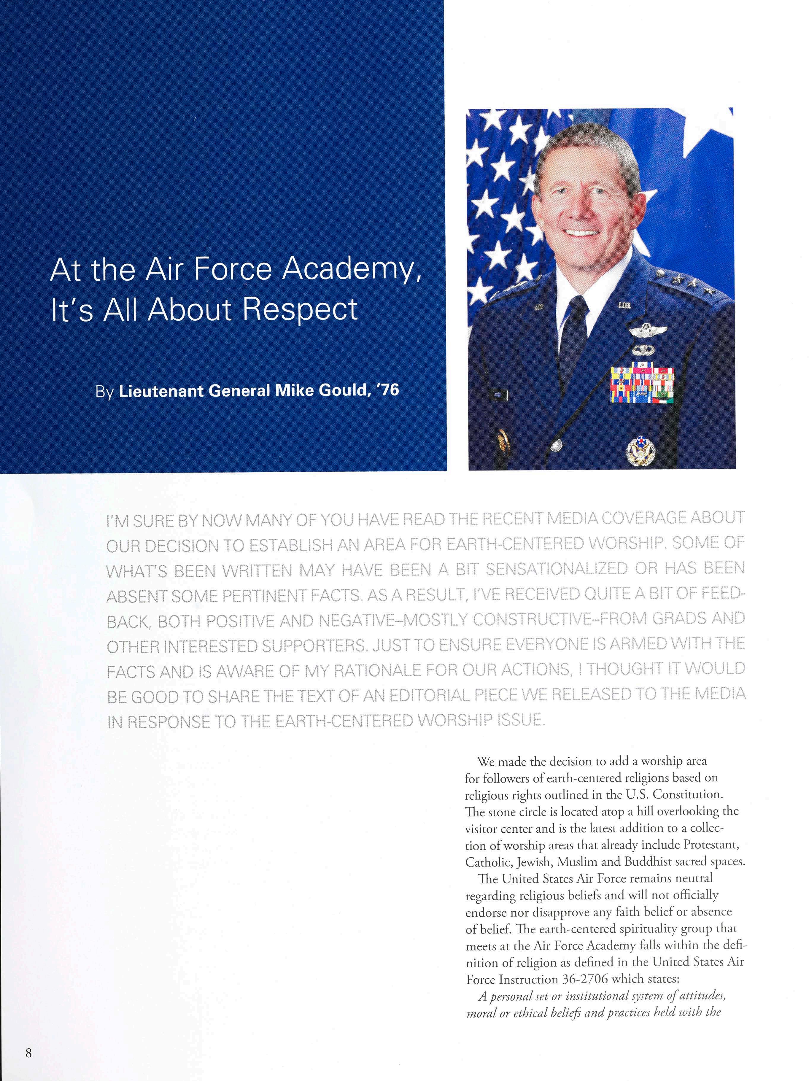 On graduation day, the same day as they are awarded a commission as second lieutenants in the United States Air Force, they will take an oath to support and defend the Constitution ofthe United States. At the Air Force Academy, we focus, and will continue to focus, on respect for human dignity to ensure all personnel respect the spirit and intent of the First Amendment to the U.S. Constitution. This is our common duty as members of the United States Air Force.