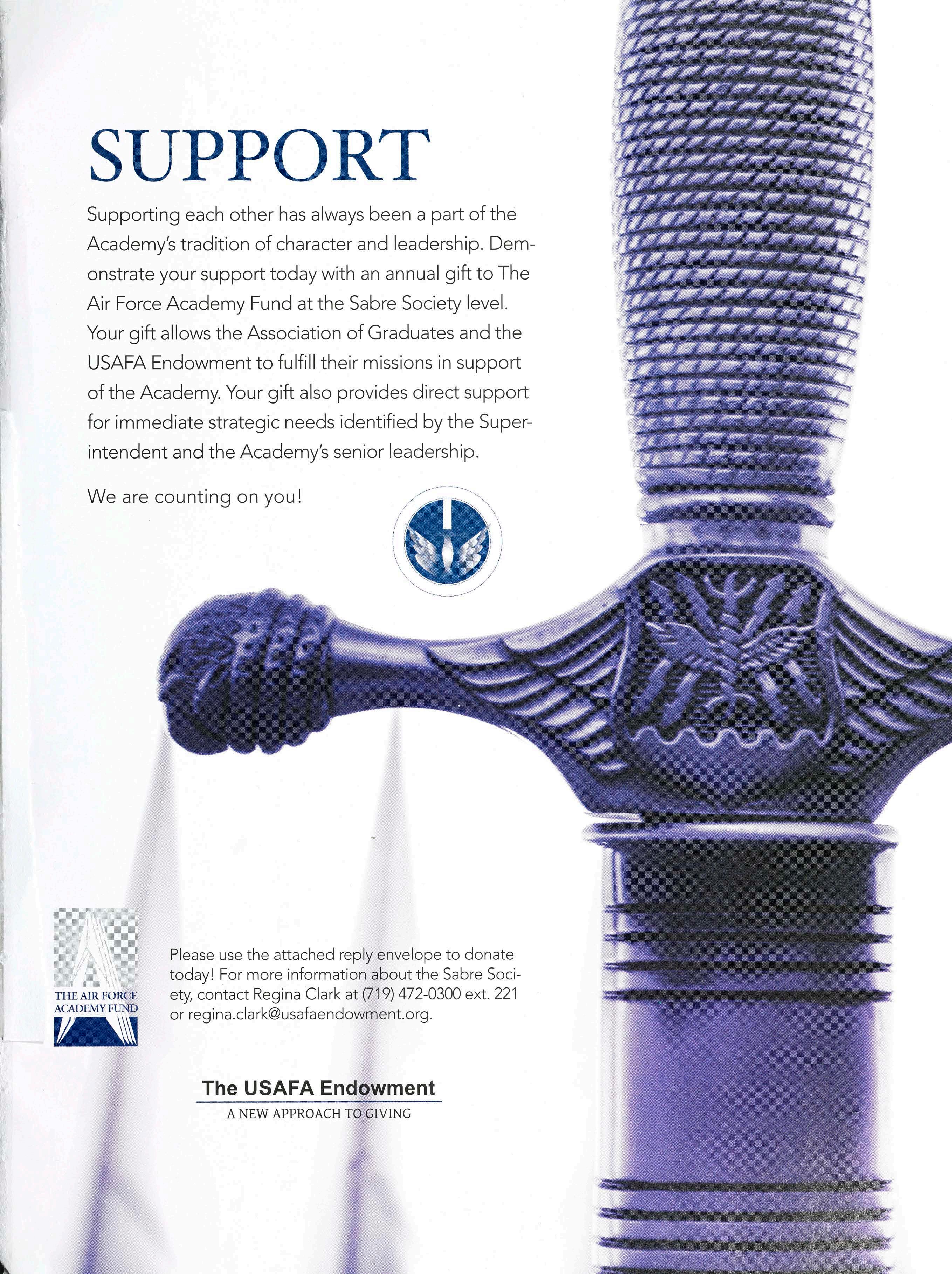 Supporting each other has always been a part of the Academy's tradition of character and leadership. Demonstrate your support today with an annual gift to The Air Force Academy Fund at the Sabre Society level. Your gift allows the Association of Graduates and the USAFA Endowment to fulfill their missions in support of the Academy. Your gift also provides direct support for immediate strategic needs identified by the Superintendent and the Academy's senior leadership.