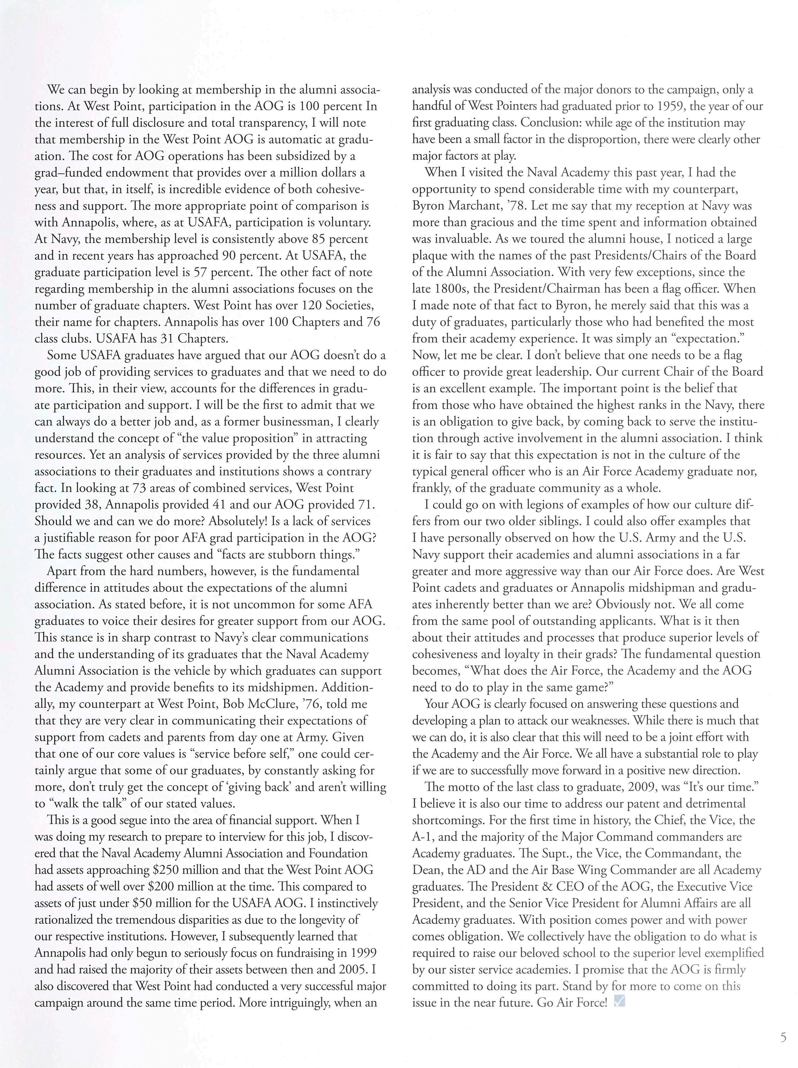 This is a good segue into the area offinancial support. When I was doing my research to prepare to interview for this job, I discovered that the Naval Academy Alumni Association and Foundation had assets approaching $250 million and that the West Point AOG had assets ofwell over $200 million at the time. This compared to assets ofjust under $50 million for the USAFA AOG. I instinctively rationalized the tremendous disparities as due to the longevity of our respective institutions. However, I subsequently learned that Annapolis had only begun to seriously focus on fundraising in 1999 and had raised the majority oftheir assets between then and 2005. I also discovered that West Point had conducted a very successful major campaign around the same time period. More intriguingly, when an