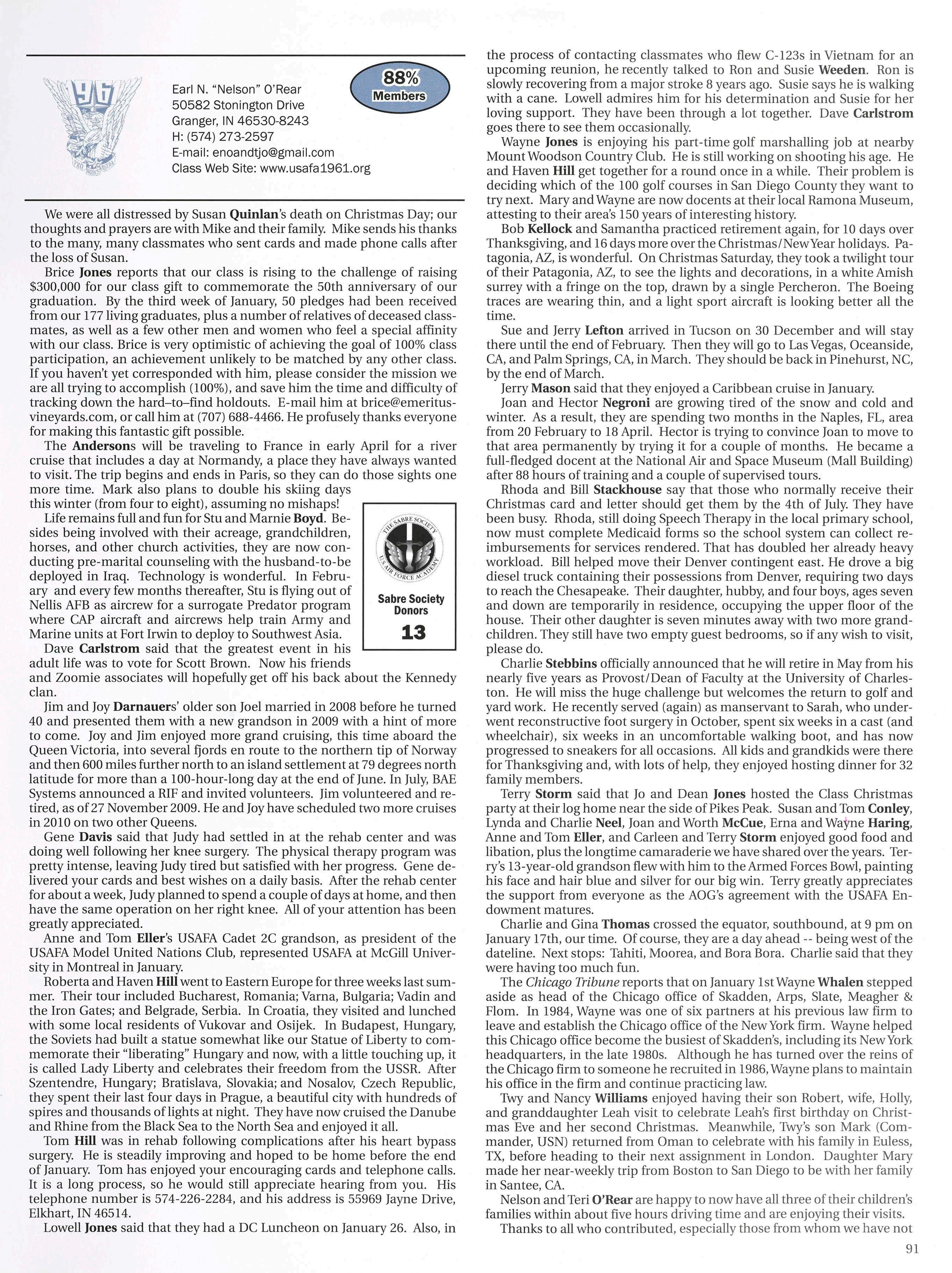 The motto ofthe last class to graduate, 2009, was “It’s our time.” I believe it is also our time to address our patent and detrimental shortcomings. For the first time in history, the Chief, the Vice, the A-l, and the majority ofthe Major Command commanders are Academy graduates. The Supt., the Vice, the Commandant, the Dean, the AD and the Air Base Wing Commander are all Academy graduates. The President & CEO ofthe AOG, the Executive Vice President, and the Senior Vice President for Alumni Affairs are all Academy graduates. With position comes power and with power comes obligation. We collectively have the obligation to do what is required to raise our belovedschool to the superior level exemplified by our sister service academies. I promise that the AOG is firmly committed to doing its part. Stand by for more to come on this issue in the near future. Go Air Force! S