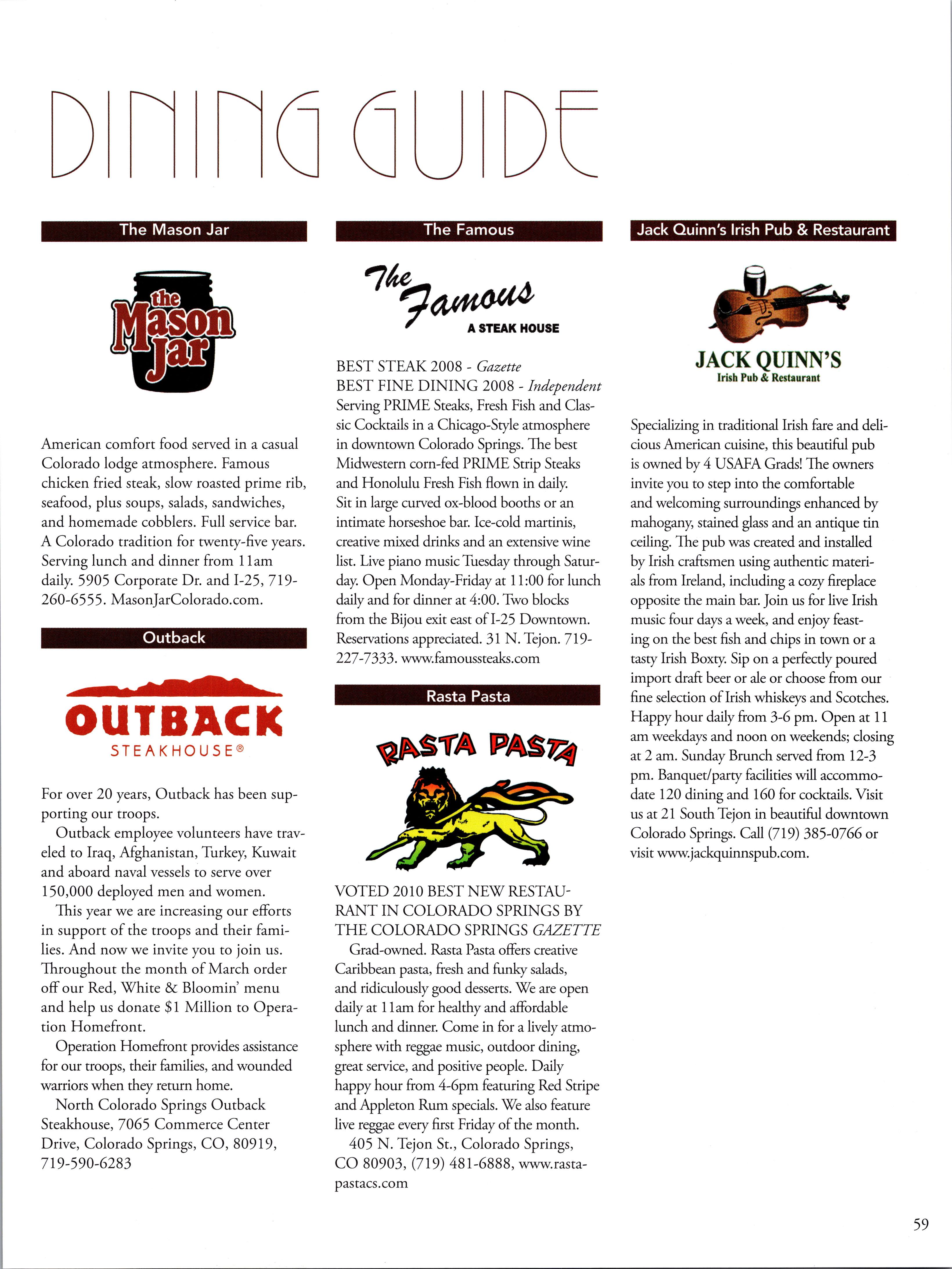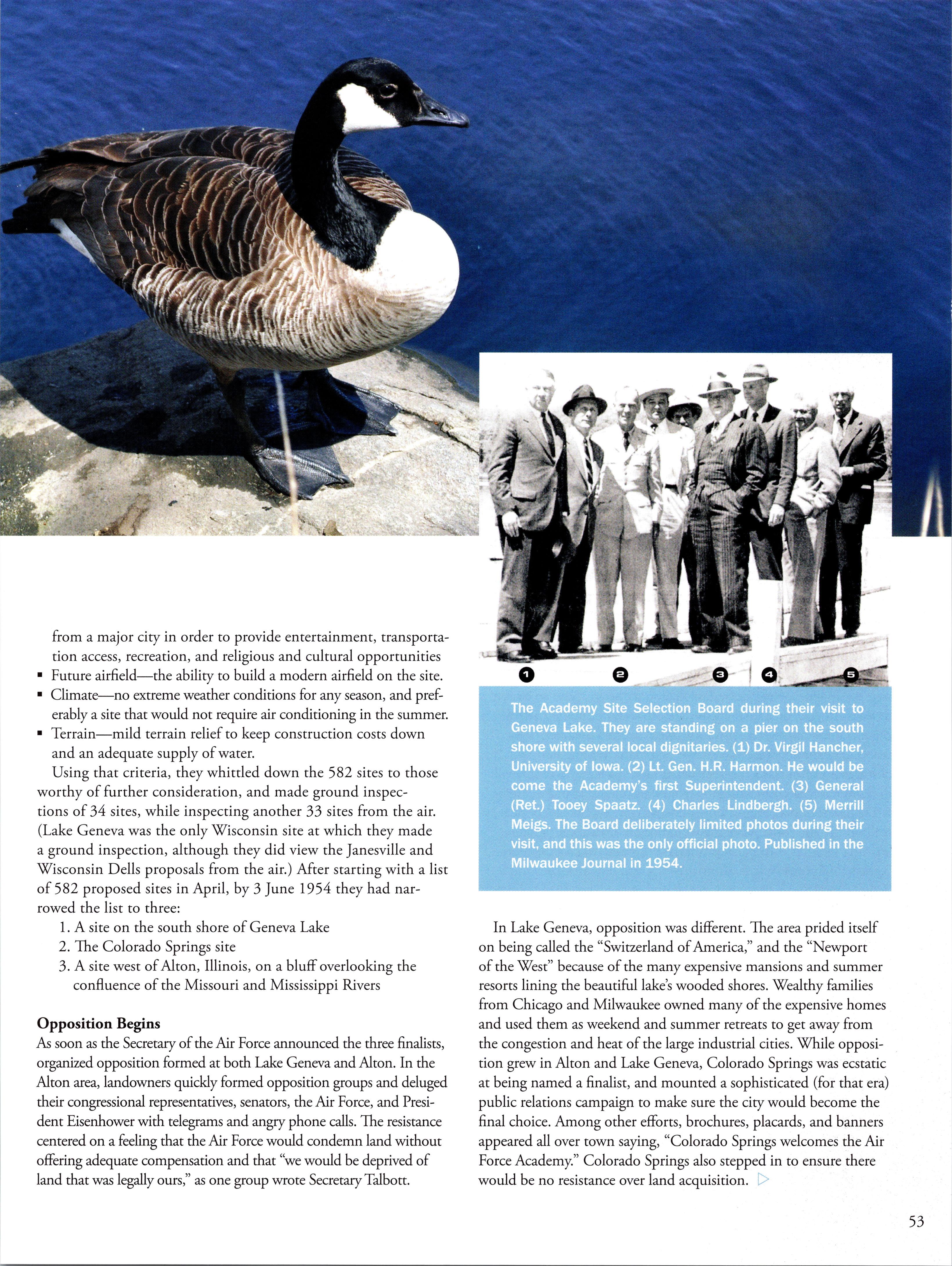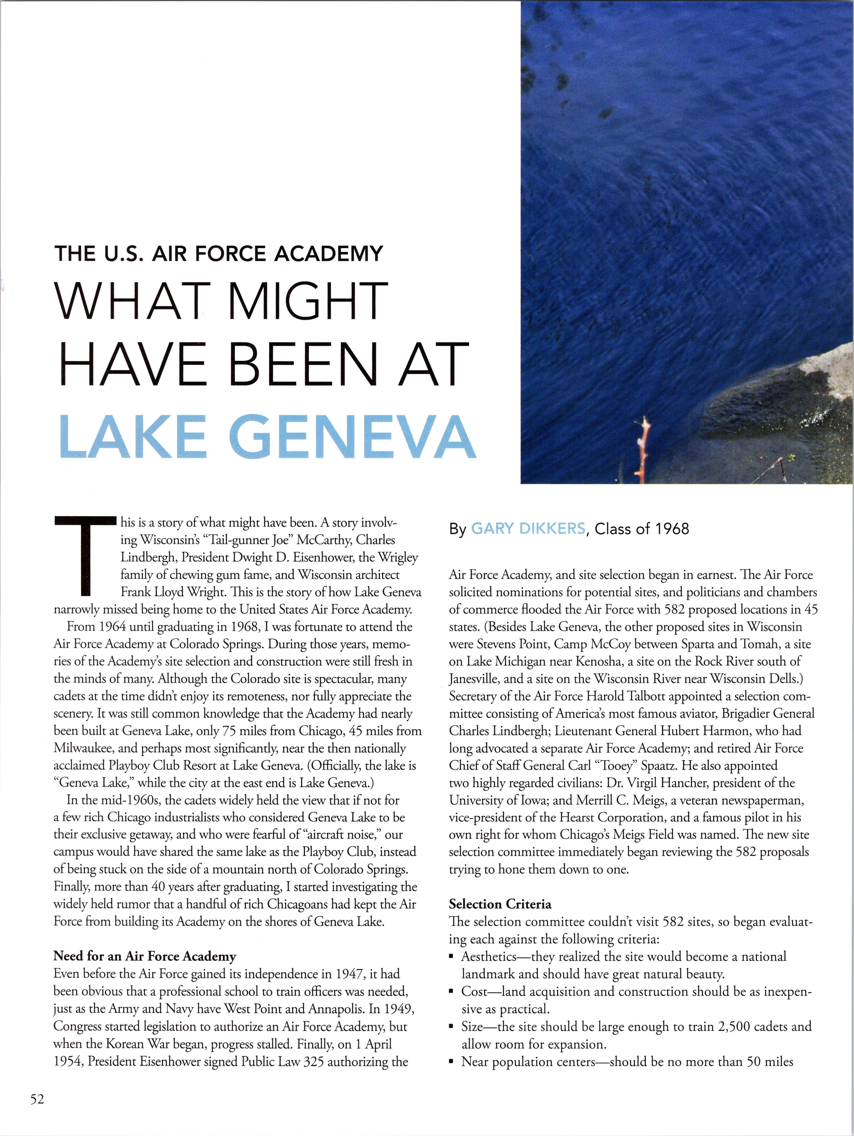 Gary Dickers, '68, takes readers on a historical tour of what might have been had USAFA been built at the alternate location of Lake Geneva. DINING